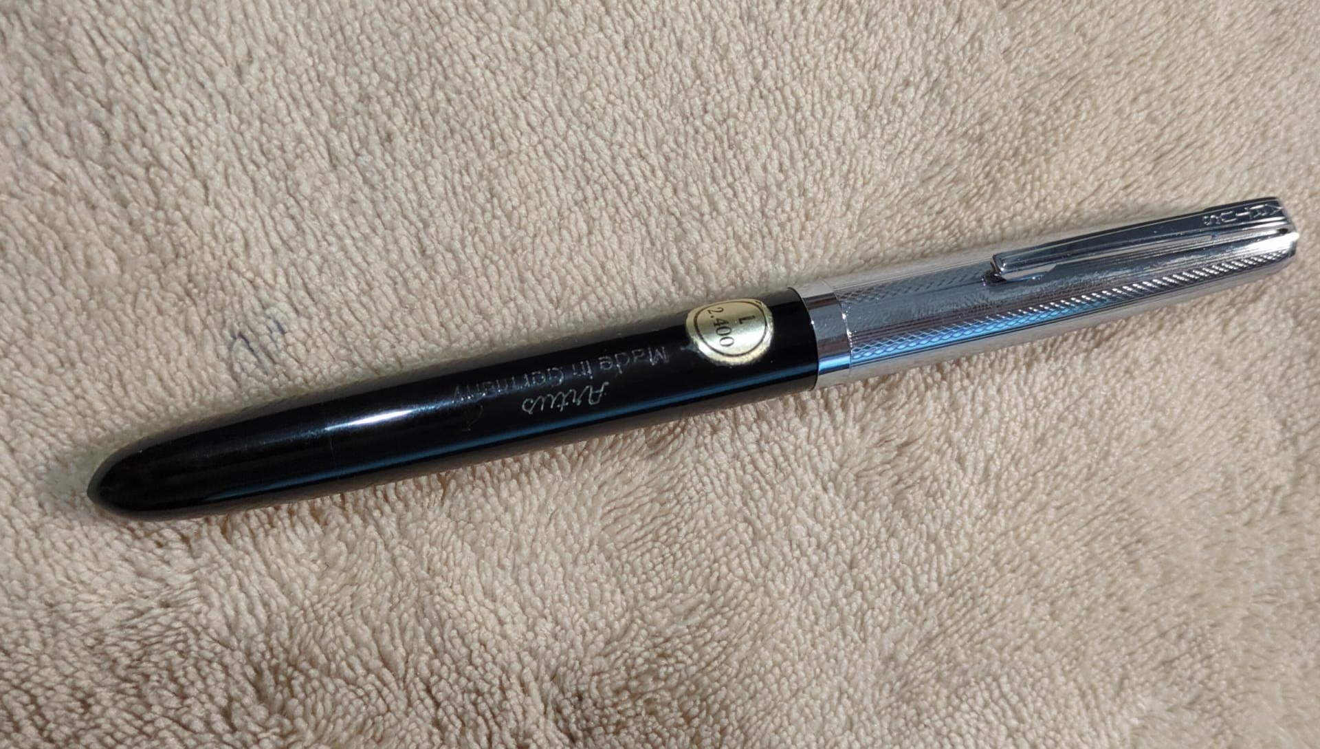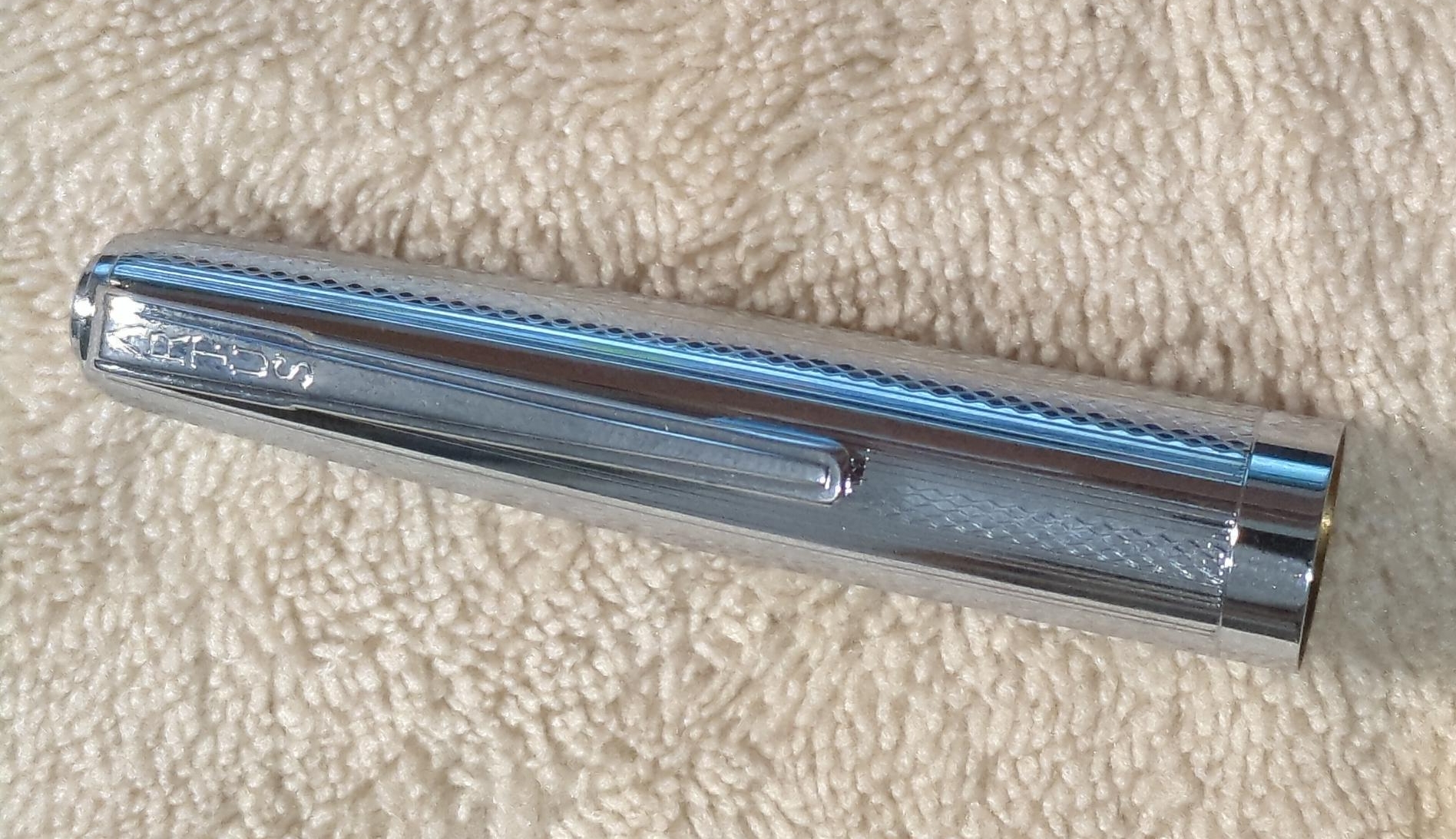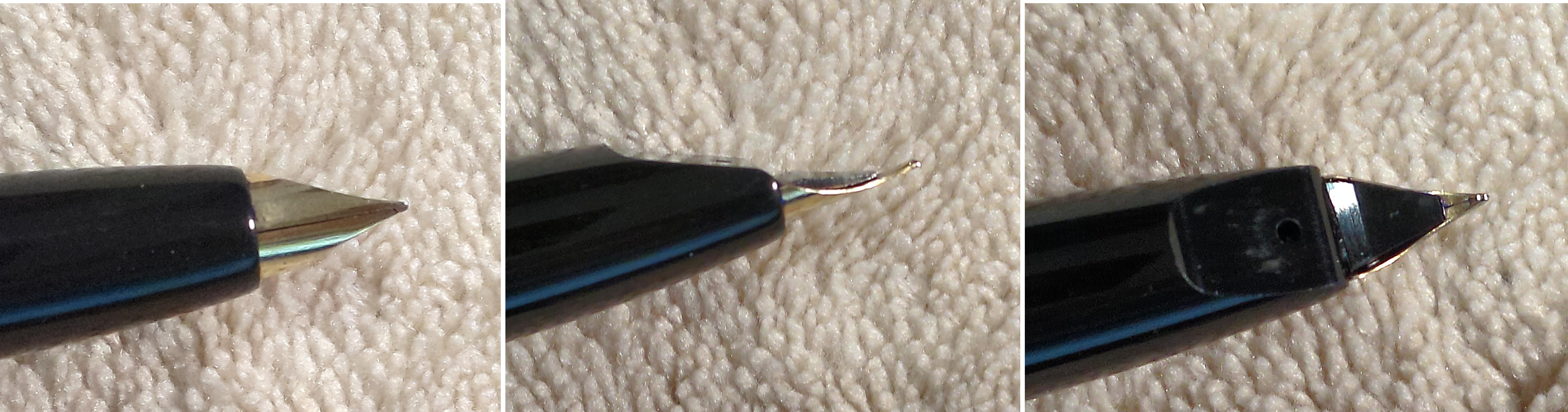 Il pennino è coperto, in acciaio dorato, senza alcuna incisione leggibile esternamente. Questo esemplare ha tratto di misura fine Kugel (FK).