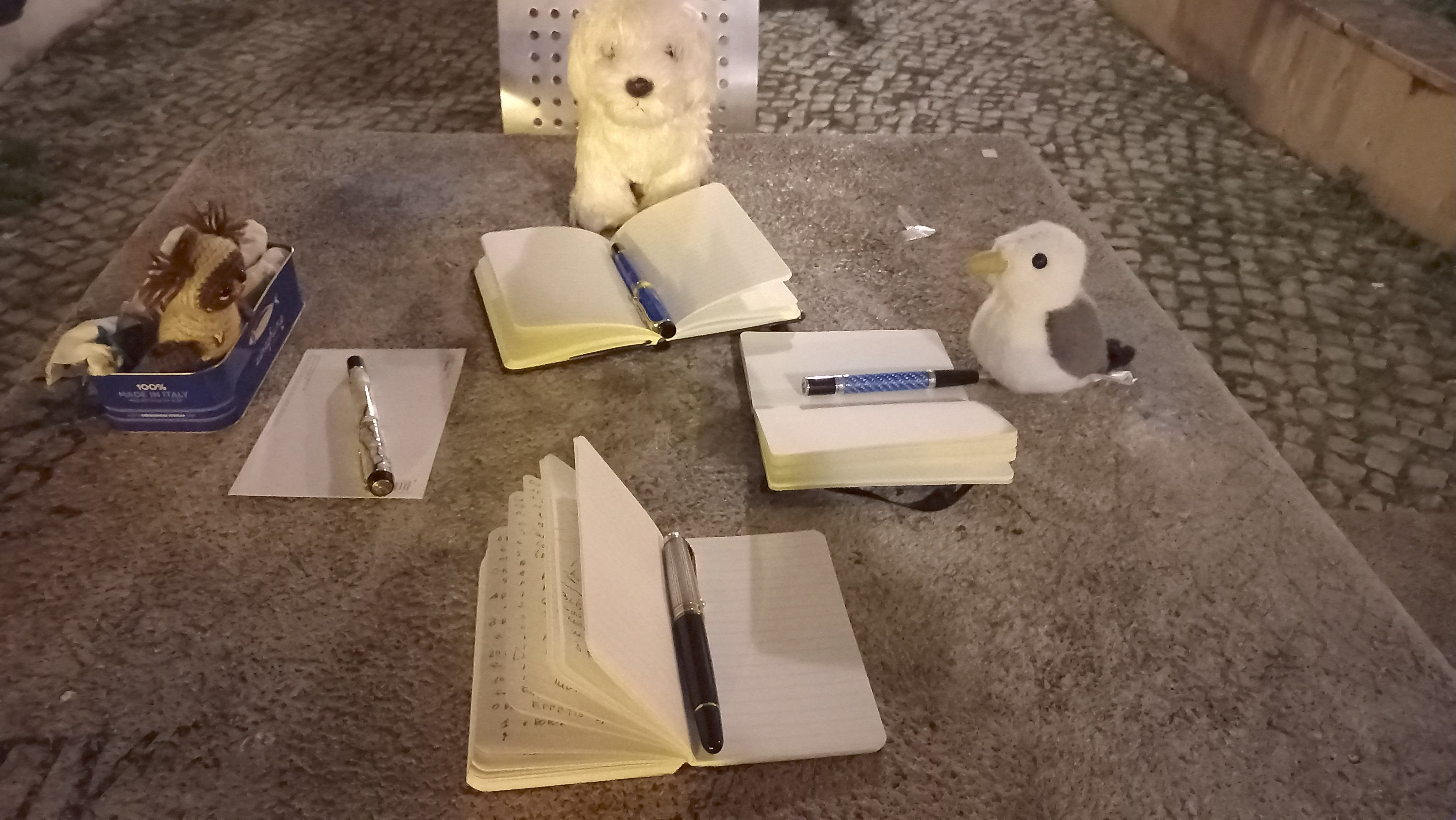 É evidente che scriviamo sui nostri quadernetti come animali e talvolta non si riesce a decifrare quello che si è tracciato il giorno prima. É altrettanto vero che, da solitari e schivi autodidatti, utilizziamo carte, inchiostri e penne comprati “a caso” secondo il luogo in cui ci troviamo e l'aria che tira in quel momento.