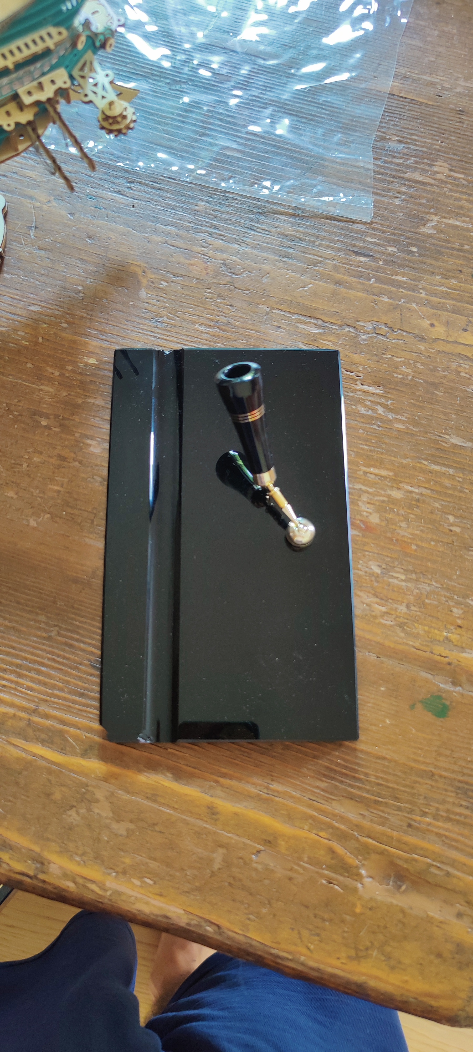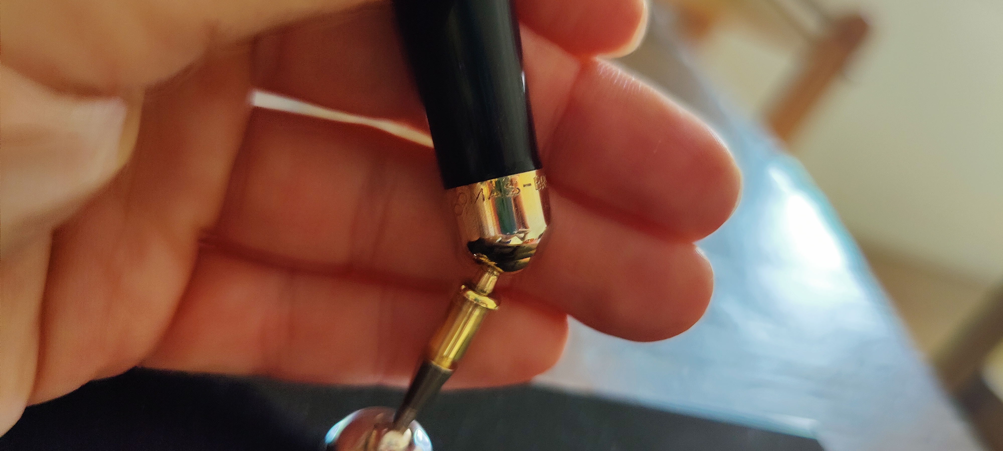 In poche parole : qualche anno fa mi è stato regalato uno stiloforo Montegrappa, azienda di Casa (da che ho capito in celluloide), con base in vetro omas, da un ex- collega (era suo, quindi usato). Nell bel mezzo dei traslochi non mi sono messo a guardarlo e provare a sistemarlo, ma ora che ho tempo.. Insomma, a me piace cercare di riparare tutto, me la cavo parecchio bene ma temo sia un po' improbabile in questo caso.. La base dopo averla pulita e lucidata è decisamente super, apparte qualche sbeccatura sugli angoli del cristallo, ma ce se ne fa una ragione.. Ma cercando di aprire lo stilografo mi sono accorto che qualcosa non andava, faceva resistenza a scatti, e una volta aperta del tutto, mi son trovato nella situazione che vedrete nelle foto.. C'è modo di ripararla? Ci tengo veramente molto e mi dispiacerebbe doverla buttare via.. Se proprio è impossibile in casa, immagino non sia conveniente portarla da un restauratore professionista visto il prezzo abbastanza modico..in quel caso qualcuno sa dove potrei trovarne una identica, almeno per ricordarmi Dell originale? L'obbiettivo mio sarebbe di rimetterla in funzione, ma non me ne intendo di stilografiche, quindi non vorrei fare ancora più danni.. Grazie ancora per le eventuali risposte e lo spazio, e scusate per il Wall of Text