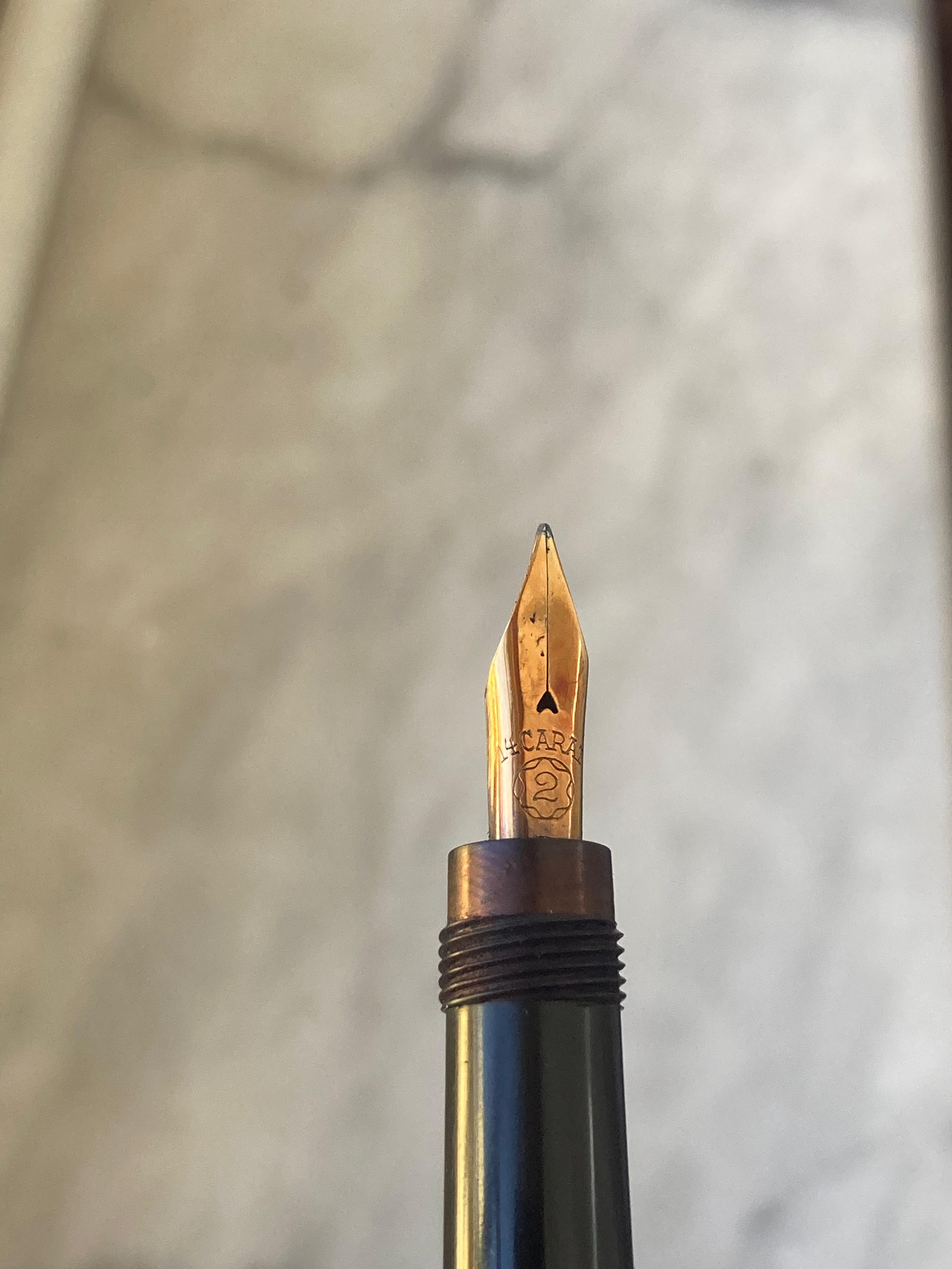 Inizio io, ma ci saranno sicuramente altri pareri più esperti. Dal pennino direi che è una rientrante n.2 con rivestimento laminato in oro.