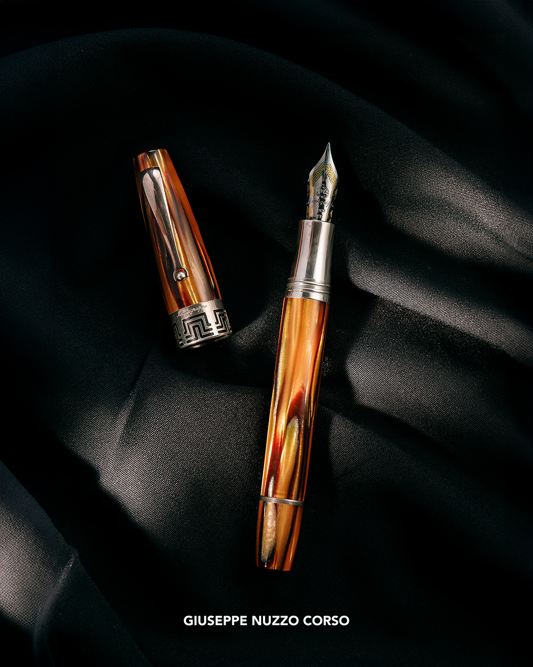 è una testimonianza dell’arte italiana nel pieno della sua maturità. Corpo in celluloide vibrante, dettagli in argento raffinatissimi, pennino gold con greche classiche, riempimento a pistone impeccabile: tutto è pensato per suscitare stupore, rispetto e quell’inclinazione emotiva che solo un oggetto perfetto può evocare.
