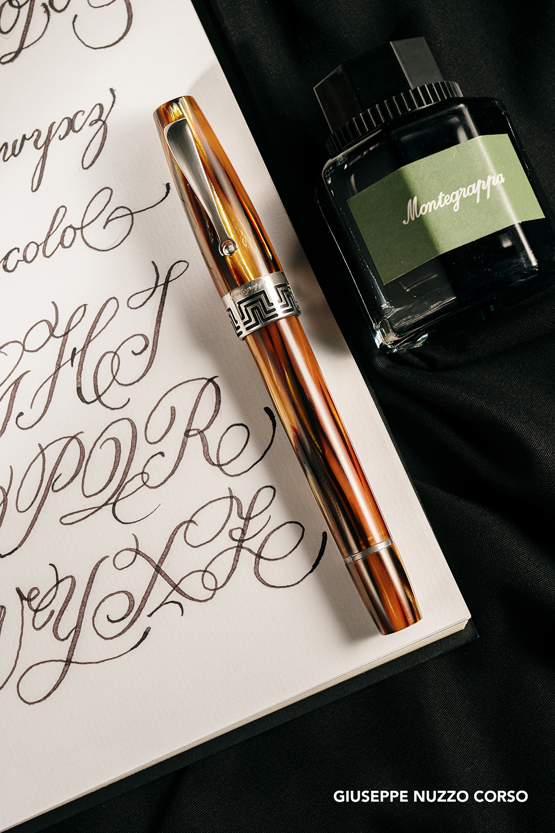Ogni dettaglio della Extra 1930 incarna l’architettura estetica del Made in Italy: la fascia sul cappuccio traforata con il motivo a greca, segno distintivo di Montegrappa, e le minuterie in argento 925, lucidate a specchio, donano un sottile contrasto metallico che esalta la celluloide senza sovrastarla