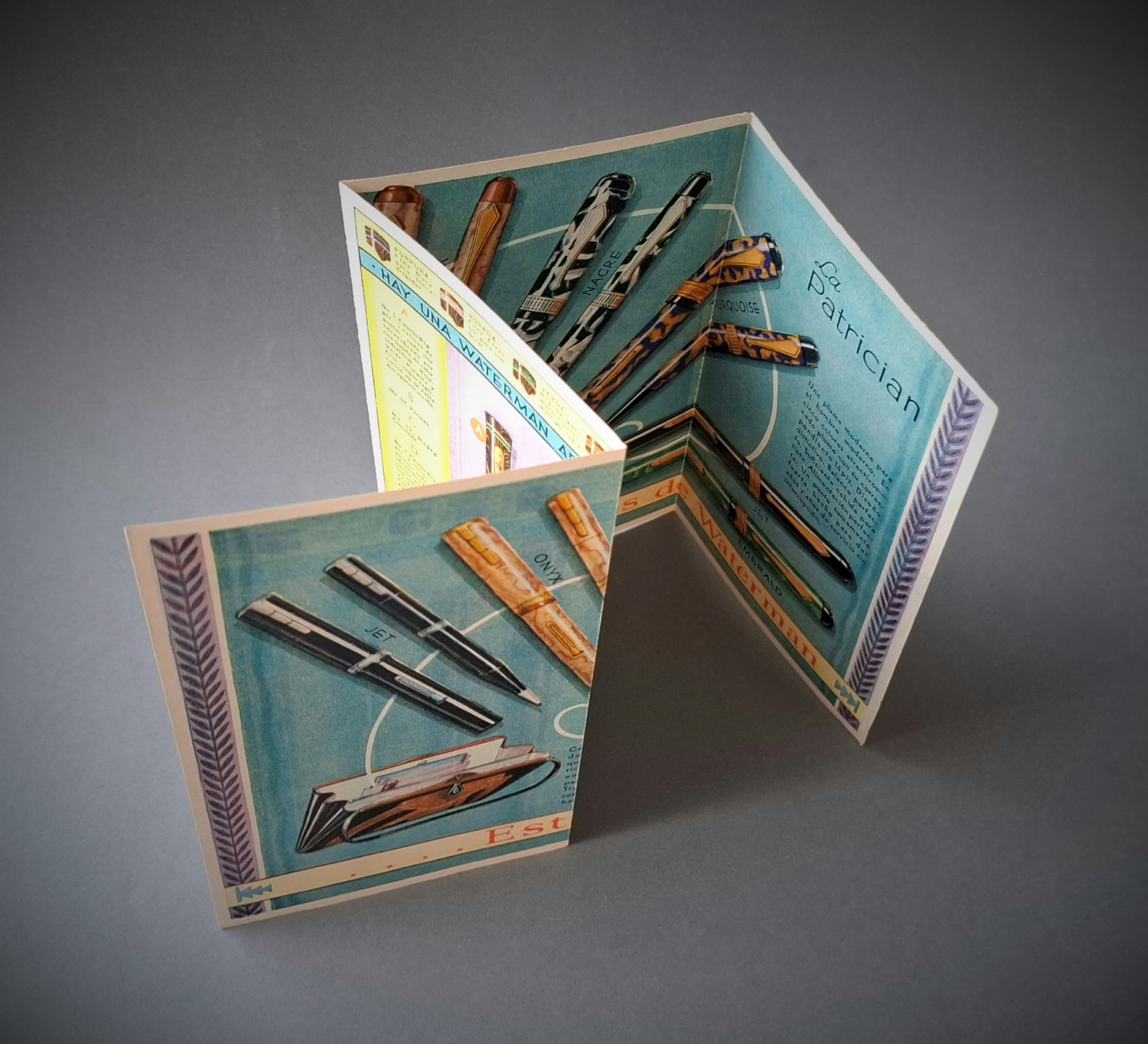 Il mio conferimento odierno al nostro formidabile Wiki è una notevole brochure a colori Waterman’s in lingua spagnola, risalente all’inizio degli anni Trenta del Novecento, che, completamente squadernata, misura ca. 36x16 cm.