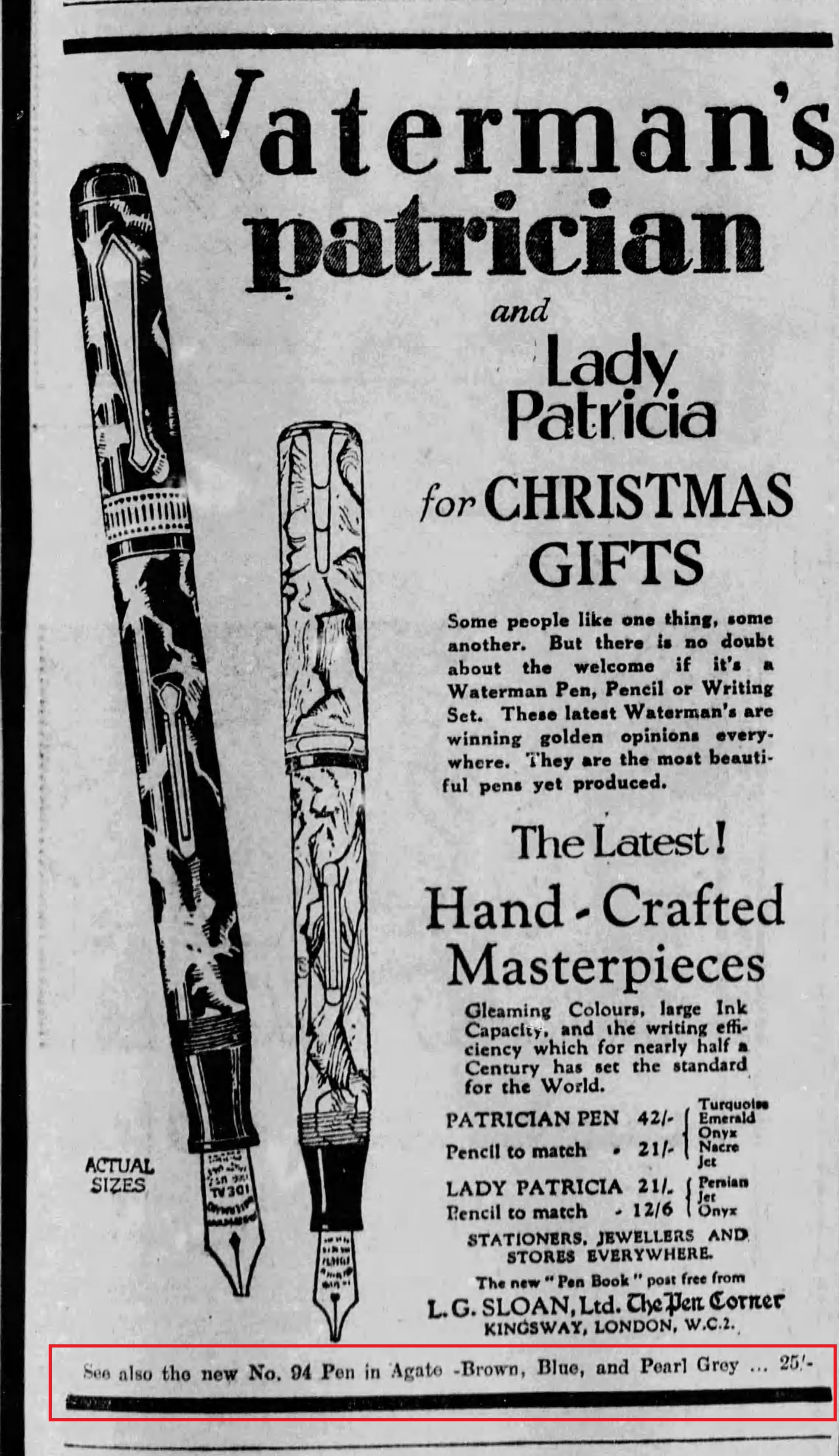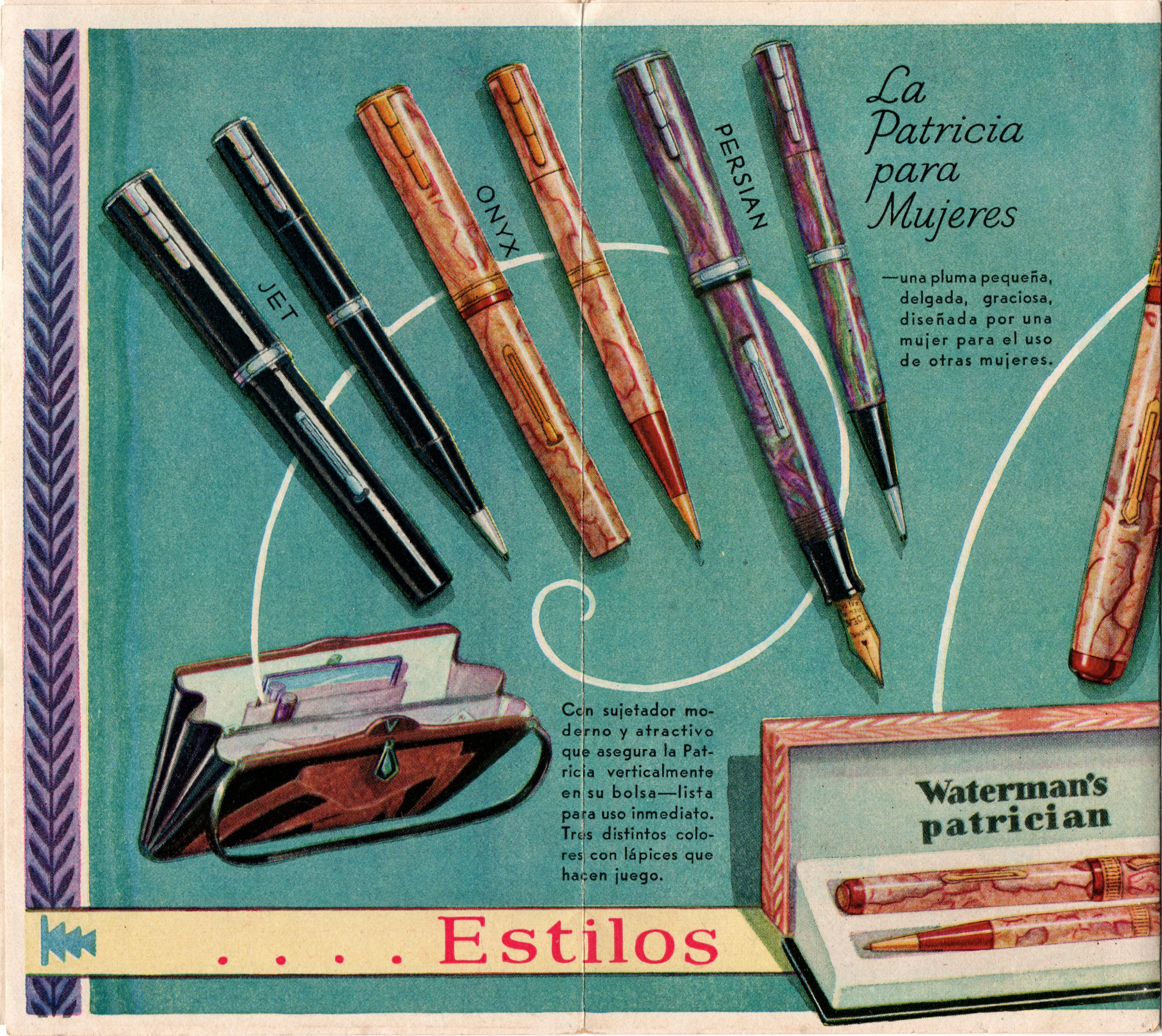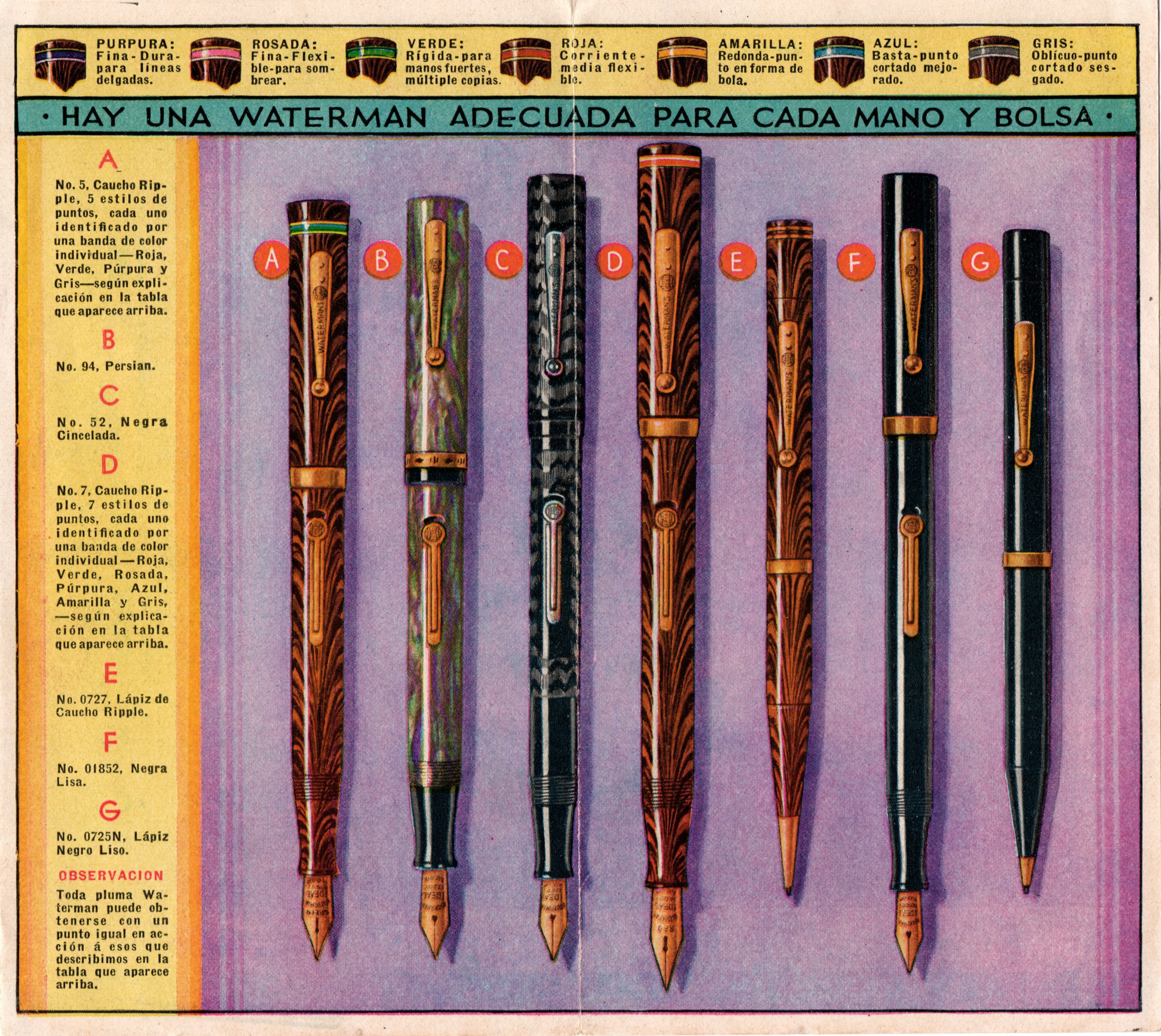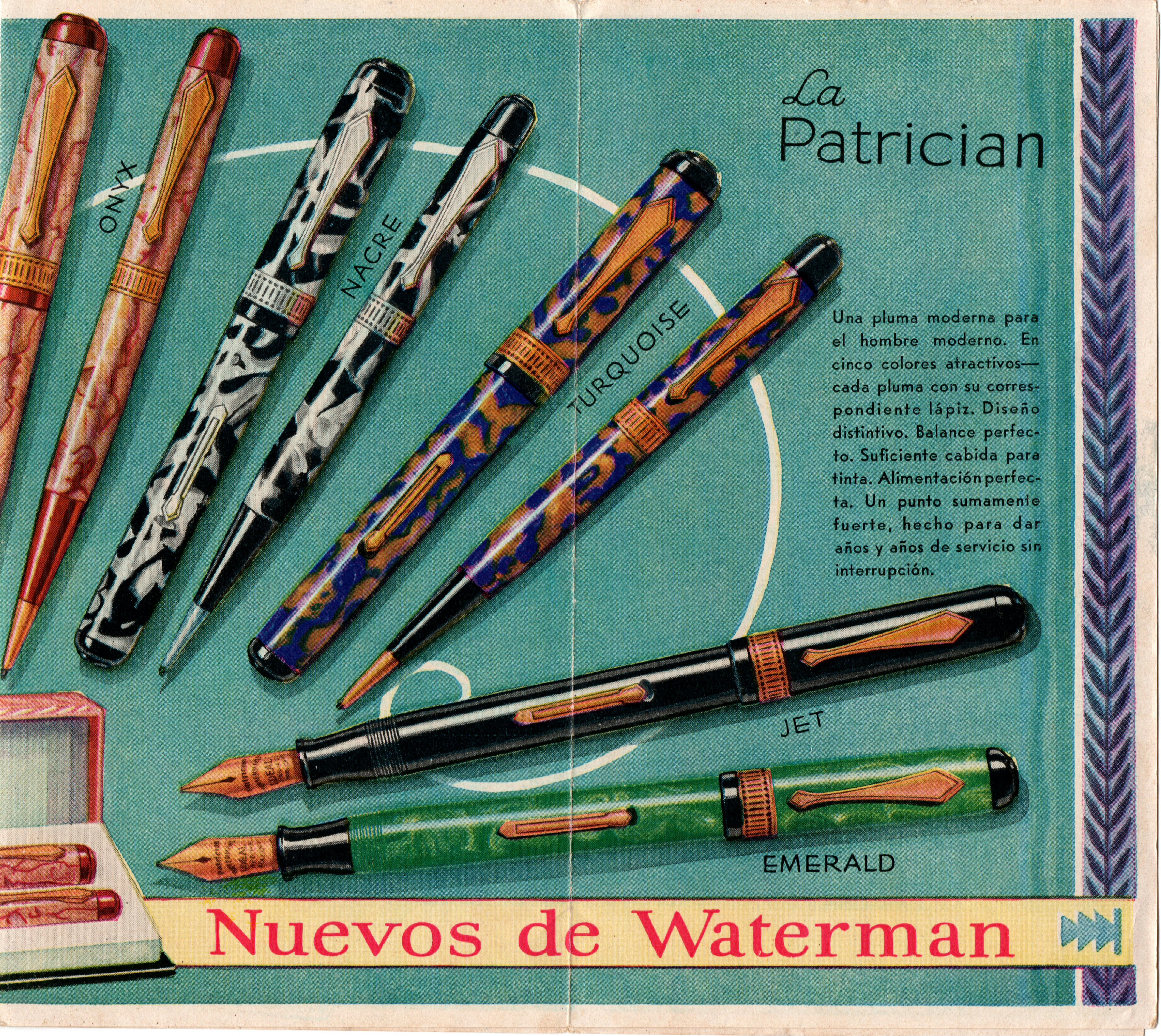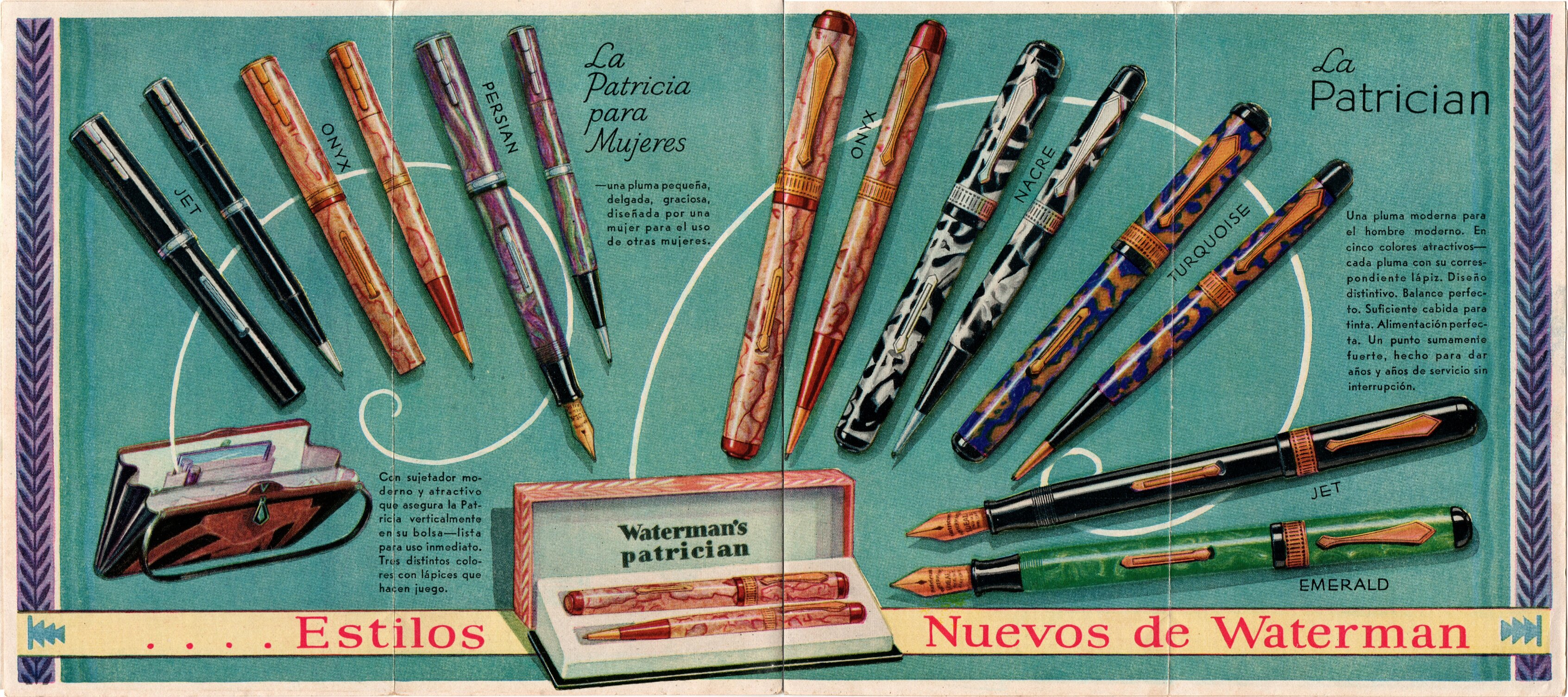 Scopriamo qui una rara avis, la <#94 in celluloide Persian>, la cui esistenza secondo l’attuale voce del Wiki (https://www.fountainpen.it/Waterman_9x) sarebbe ancora sub iudice: «Non è chiaro se siano stati usati i colori presenti sulle Lady Patricia come il Persian.». Orbene, dalla mia brochure oggi apprendiamo con certezza che la <#94 Persian> era stata pubblicizzata, almeno nei paesi del centro America.