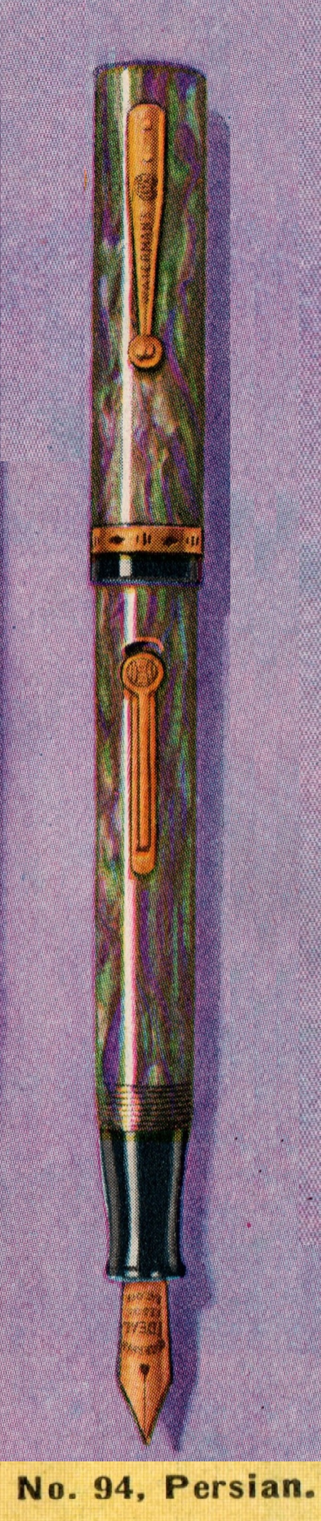 Dettagli comuni a tutte le stilografiche sono la clip rivettata e la levetta di caricamento con terminale a paletta e globo "Ideal", mentre l’unico vero elemento di novità della <#94 Persian> è costituito dal labbro del cappuccio, in celluloide di colore nero a contrasto, e dalla notevolissima veretta traforata: entrambi gli elementi non possono non richiamare la parte inferiore del cappuccio della <Patrician>, come si può verificare dal brevetto seguente.