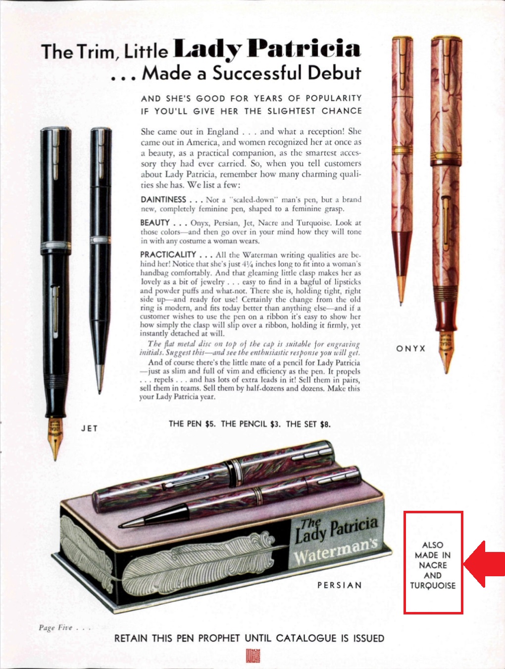 L’offerta complessiva di 5 colori, grazie all’aggiunta delle livree Nacre e Turquoise (celluloidi entrambe presenti già dal 1929 sulle Patrician), come nel testo della brochure olandese di Simone, dovrà attendere il febbraio/marzo del 1931, come risulta dalla rivista aziendale «The Pen Prophet» del febbraio 1931,