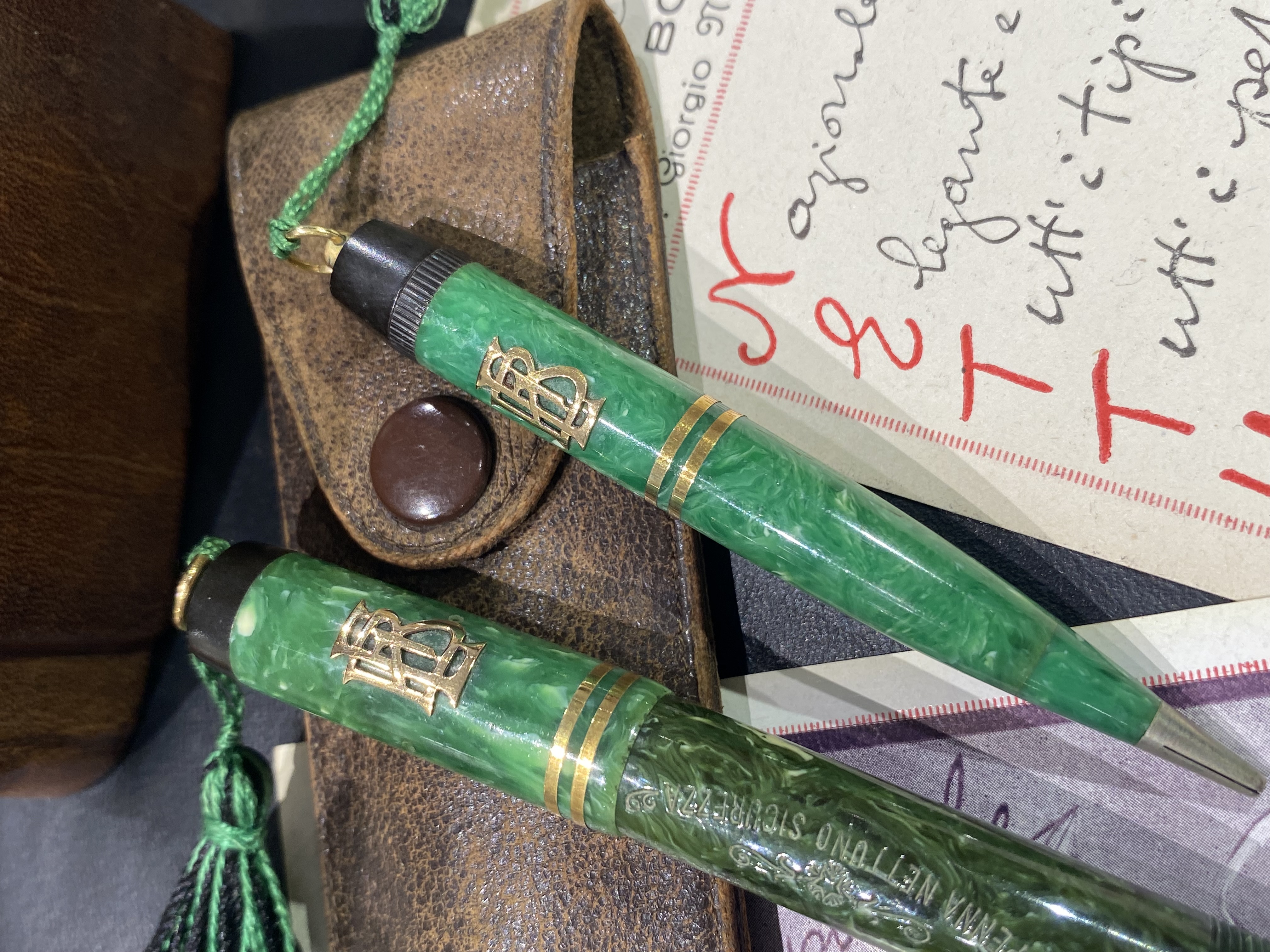 con ogni probabilità risalente agli anni ’30-’40 – ma come sempre mi affido all’esperienza di Simone per una datazione più precisa – vi presento questa parure Nettuno Sicurezza in celluloide verde, composta da penna e matita.
