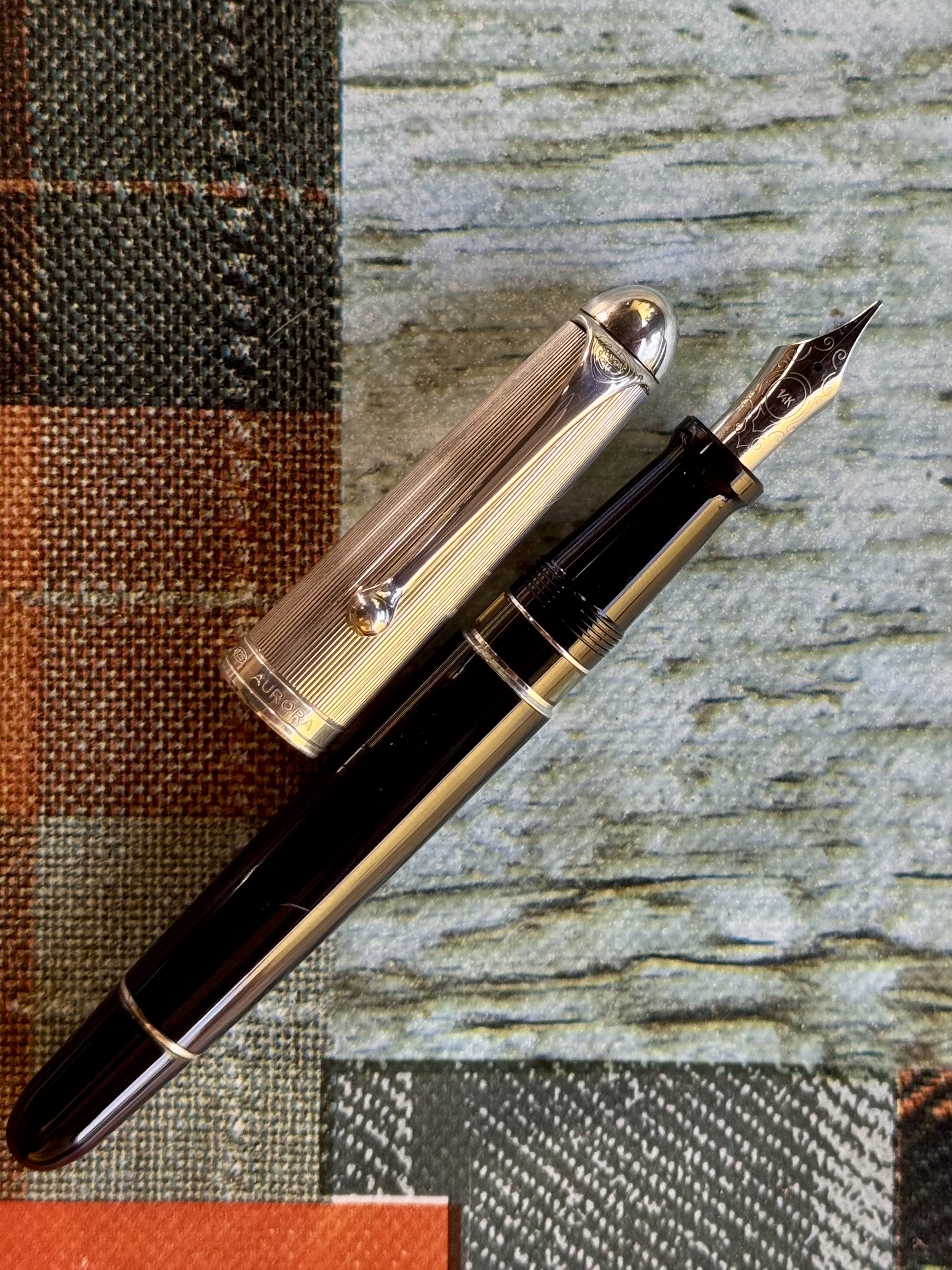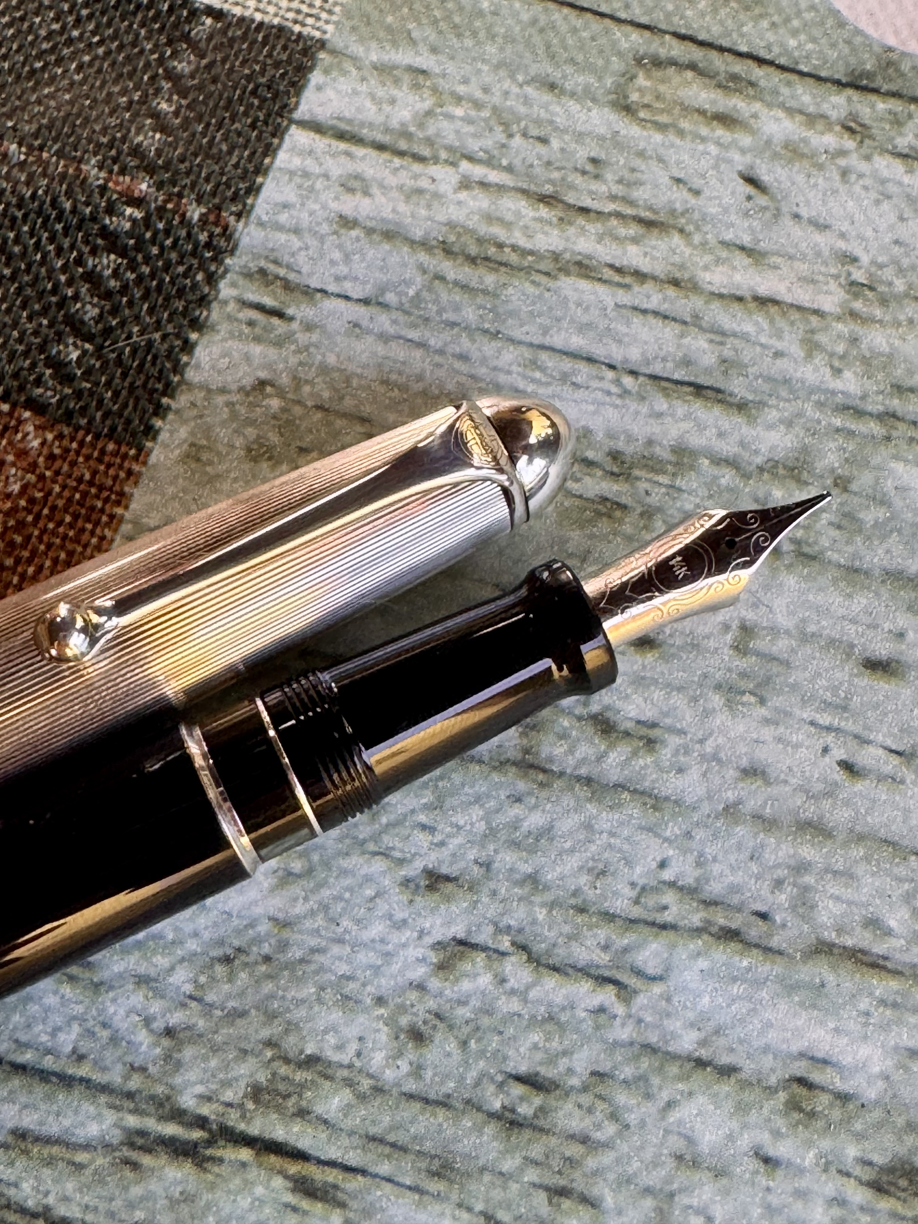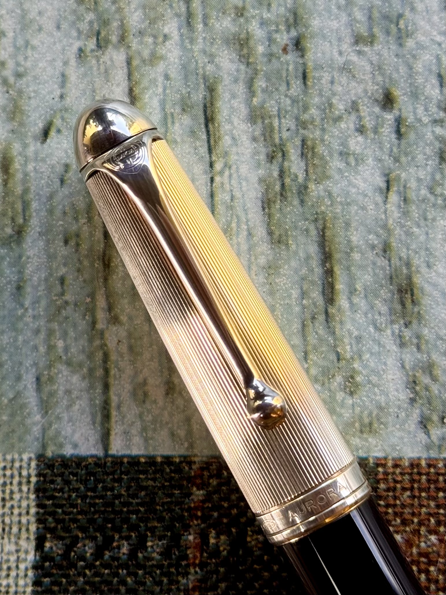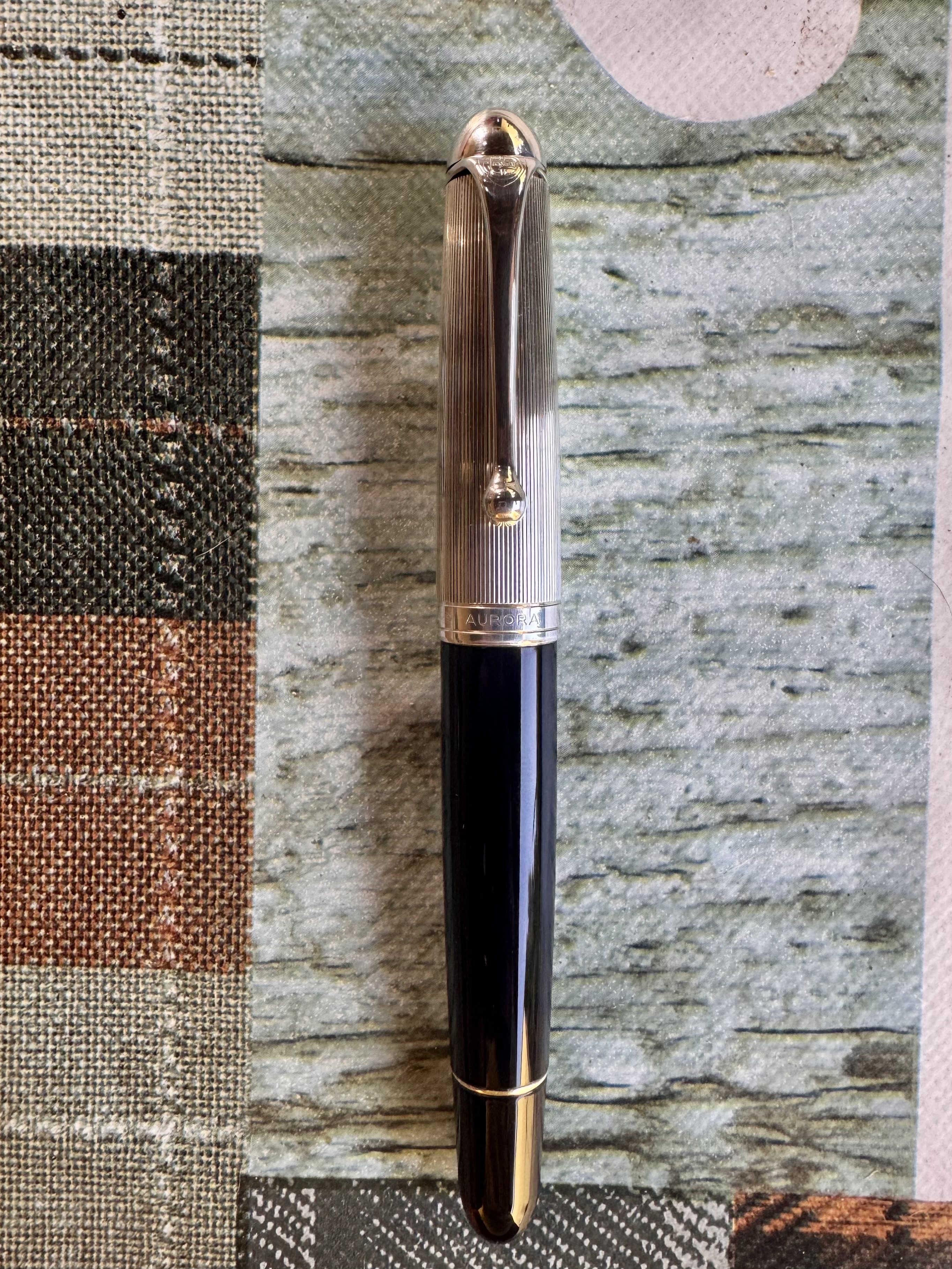 Rispolvero questo topic per aggiungere foto di questa Aurora 88 personalizzata Lancia. Pennino a rebbi lunghi, cappuccio in argento massiccio. Parte -a quanto detto dal venditore, ex dipendente Fiat- di un regalo aziendale. La particolarità è la resina di un blu molto scuro (quasi nero dalle foto).