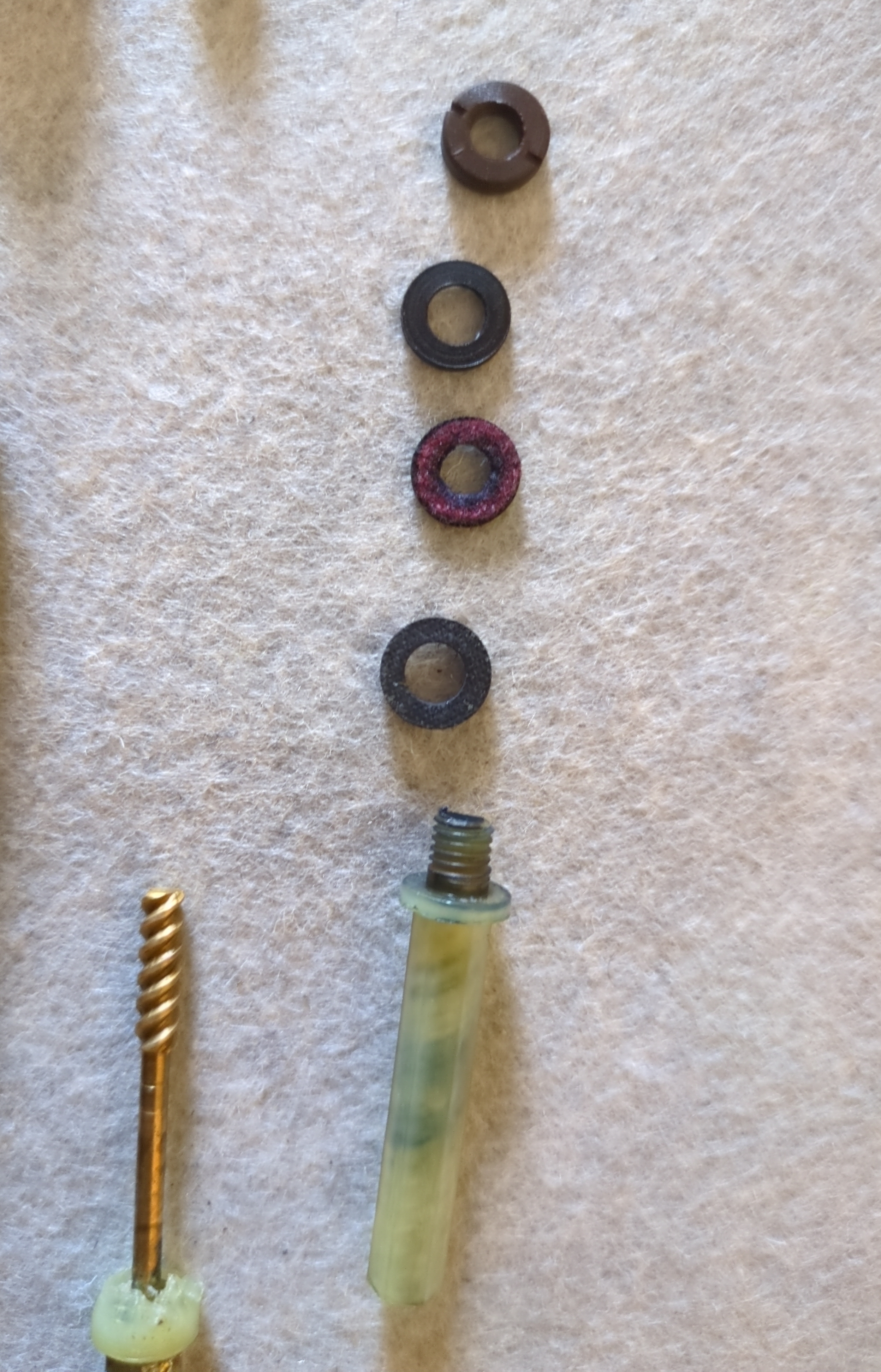 Per il sistema di carica, ho riutilizzato lo stantuffo originale, sostituendo l'alberino e il dado con relativa spinetta (praticamente "saldati" tra loro e che non sono riuscito a smontare) con anche la la molla della vite di bloccaggio (che mancava); per il gruppo guarnizioni ho scelto, tra tutte le disponibili (originali e ricambi), quelle che si presentavano in condizioni di maggiore elasticità.