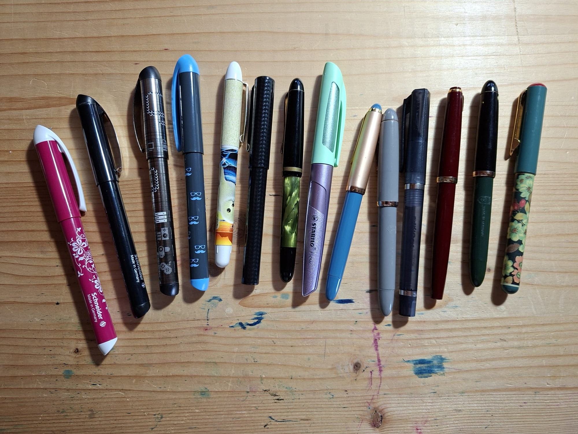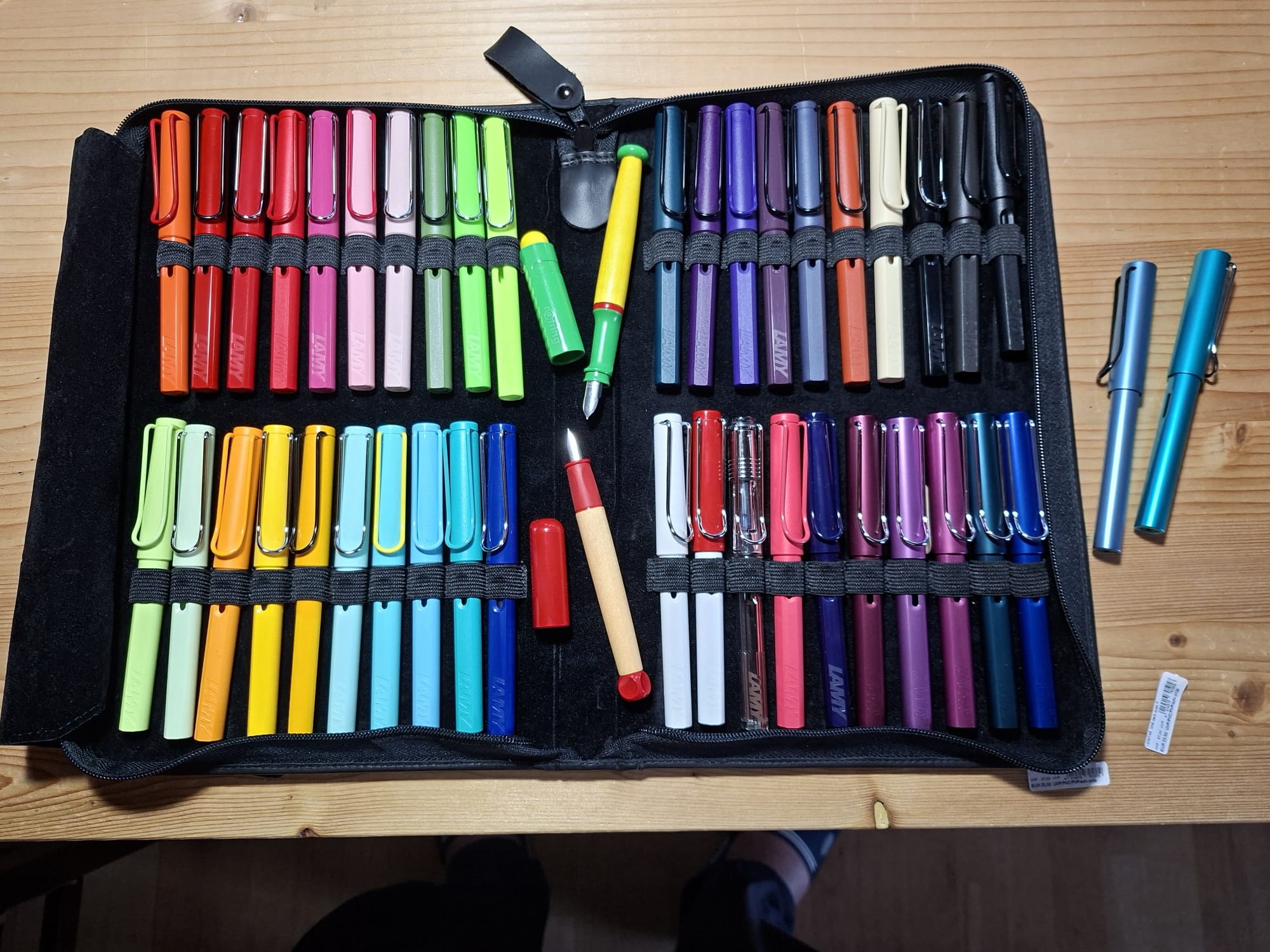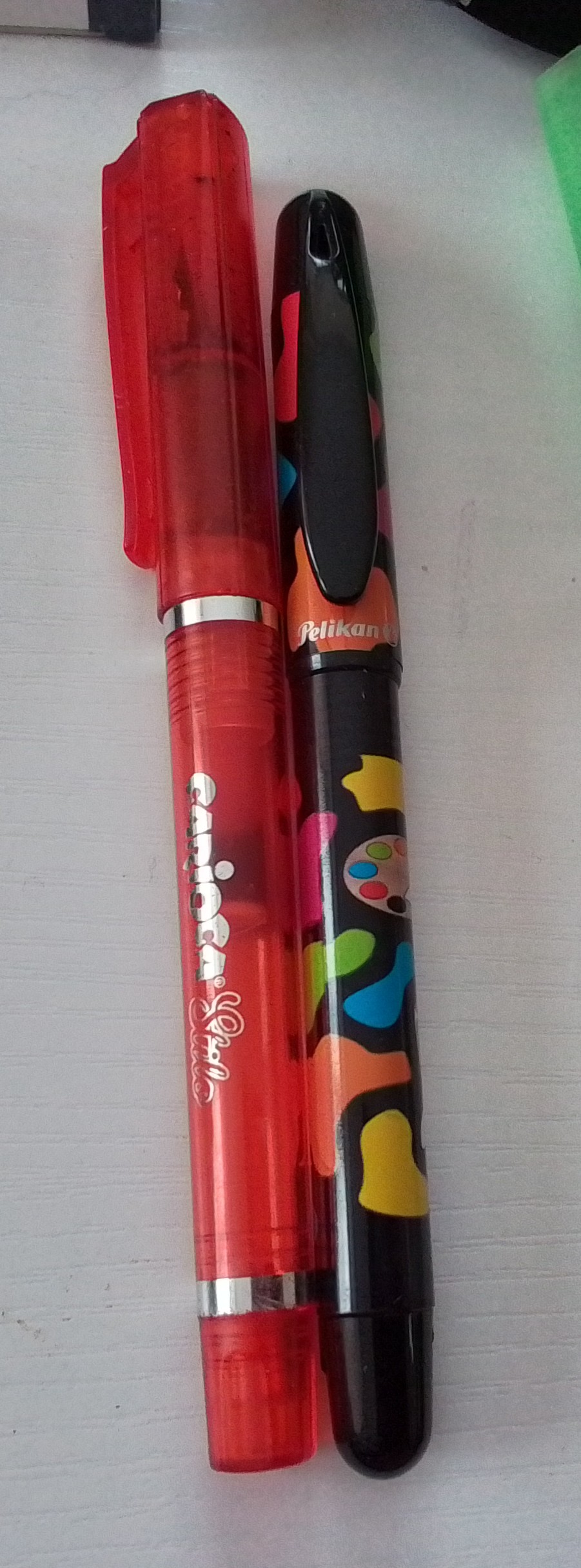 Capita poi che in quinta si appassionano, d'altronde vedono anche me che per correggere uso vari inchiostri colorati a seconda del momento; dunque qualcuno che cambia penna dall'anno precedente poi usa la "vecchia" con cartucce colorate per i titoli e va a scovare in qualche negozio del centro qualche altro tipo di cartucce - qualcuno ha scovato addirittura le cartucce Herbin