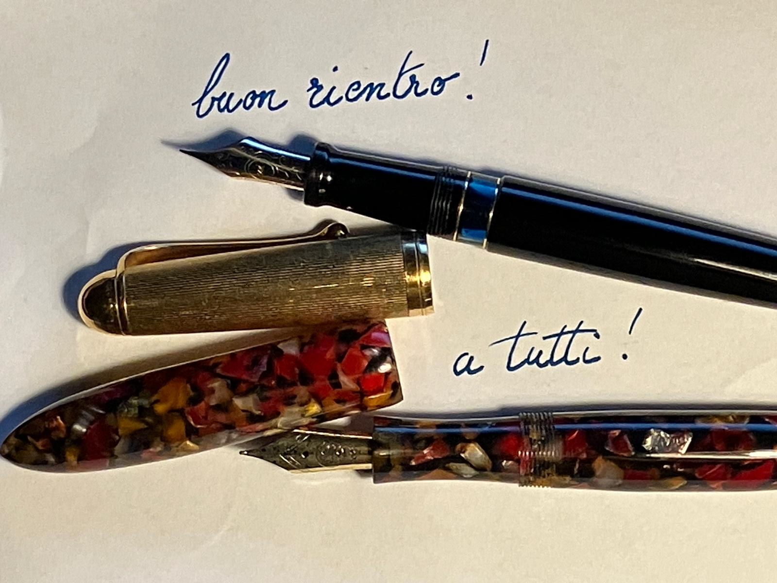 dopo una meritata pausa, una penna mi attende già inchiostrata (da 3 settimane) e una, che ha scritto poco e niente, torna con me. Entrambe scrivono al primo colpo, il ché mi rallegra
