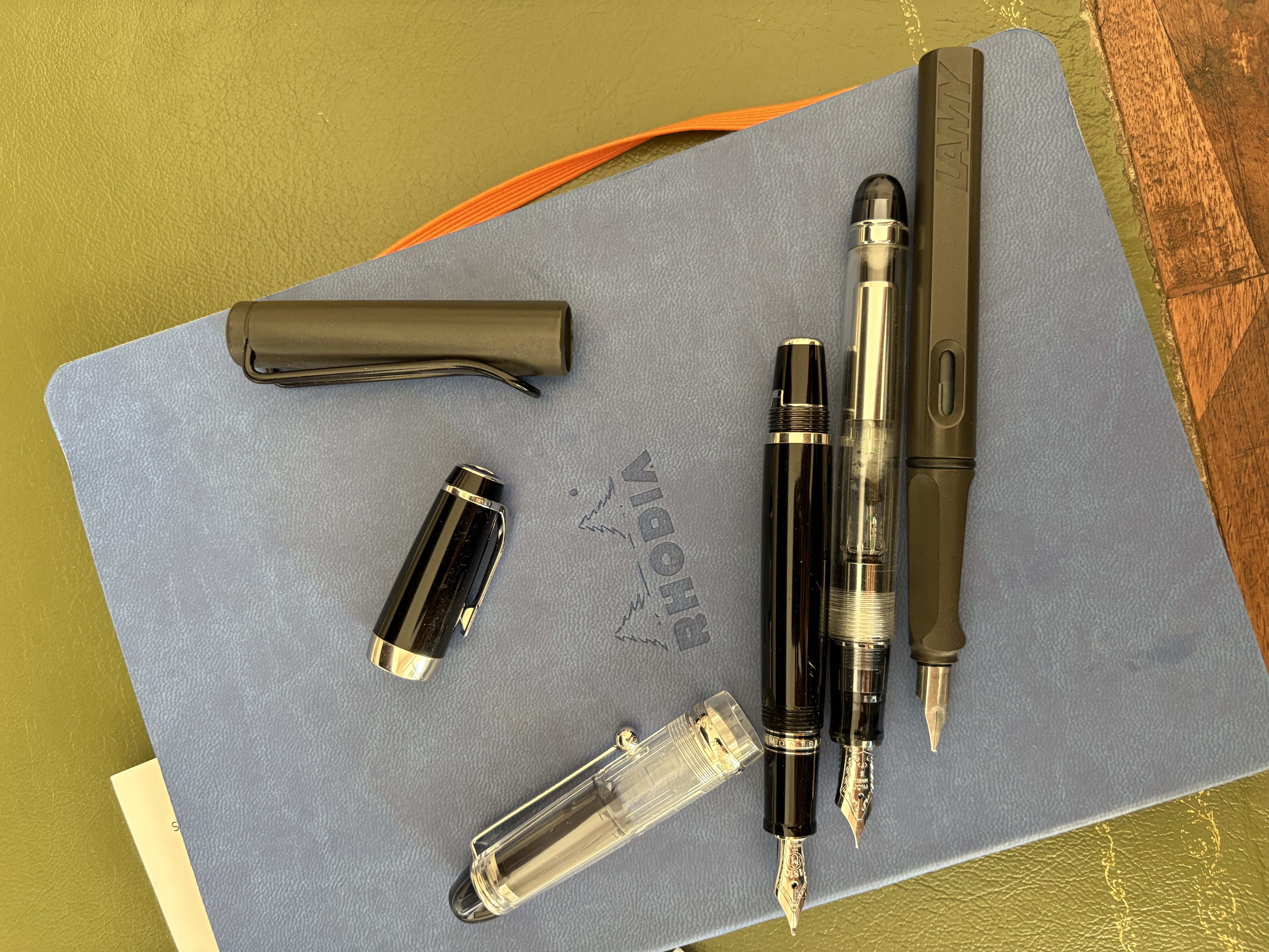 Oggi sono in uso Aurora Optima Colombo, Visconti Ragtime, Sheaffer Imperial Sovereign e le due che son sempre nel taschino o sulla scrivania, la Parker Duofold Centennial Mandarin yellow e l’Aurora Talentum Full metal black, entrambe con pennino Italic.