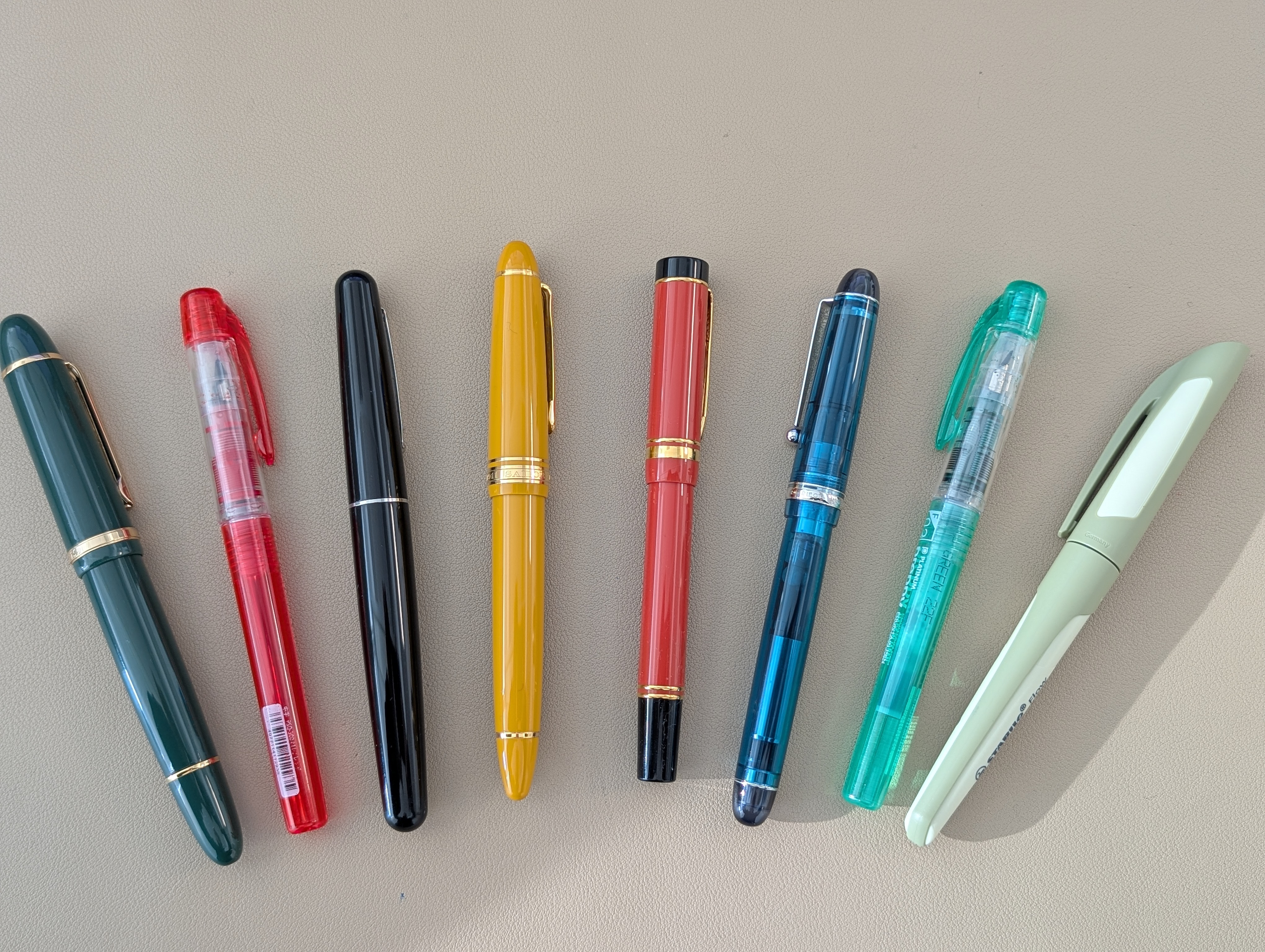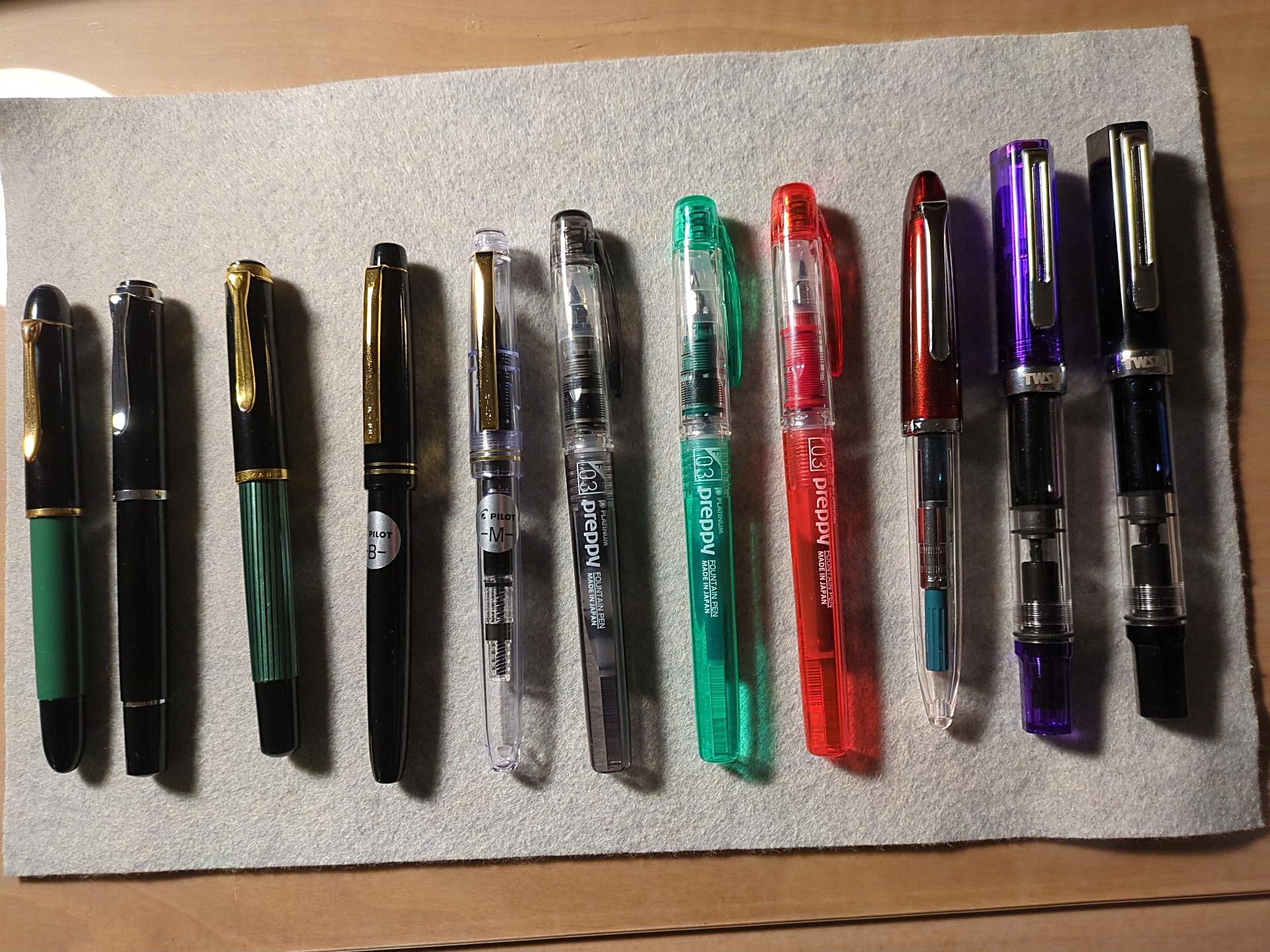 Non sono tutte stilografiche, ad eccezione dei due portamine a destra il resto sono stilografiche Pelikan.