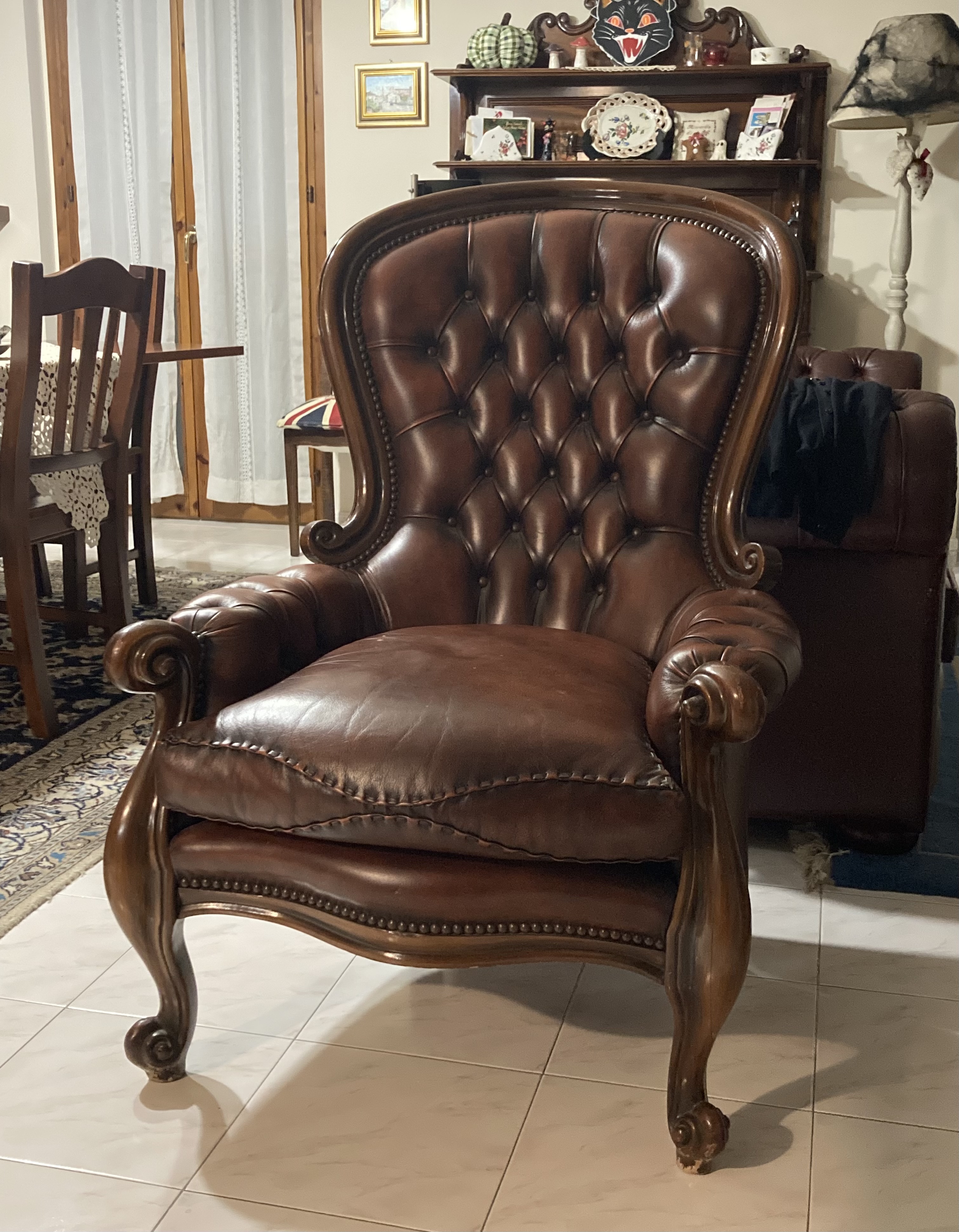 Pagata un prezzo molto onesto! Circa come una 742. Artigianale in cuoio e senza danni o tarli. Adesso le cercheremo il pouff