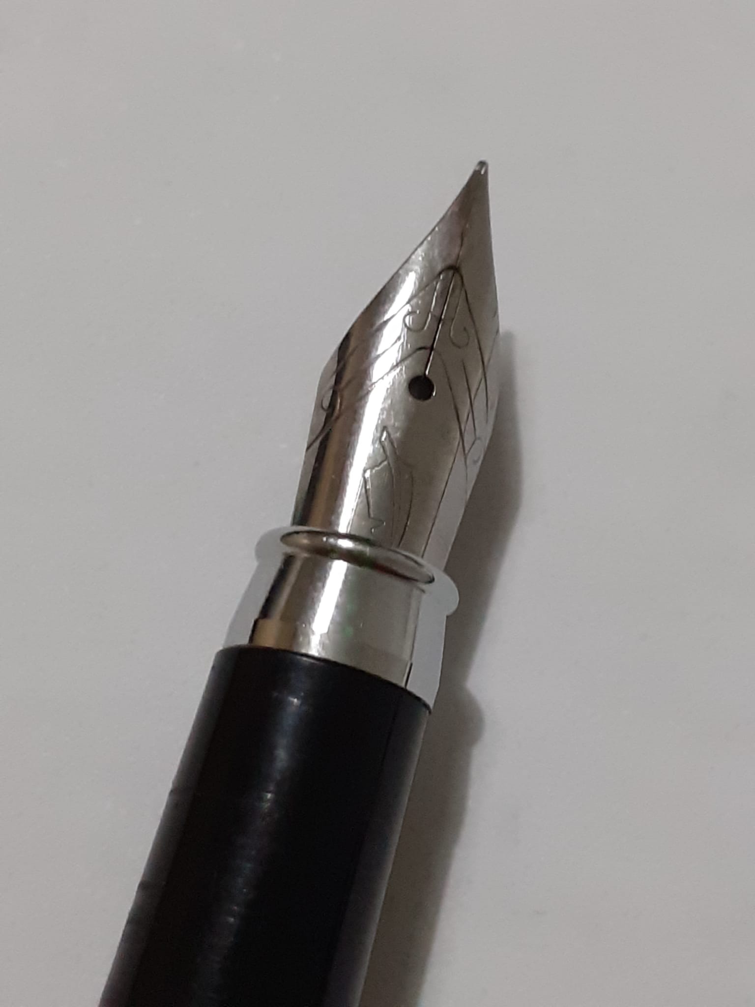 Il pennino è molto fine, forse è un EF, sicuramente più fine dell’altro pennino F montato sulla penna che utilizzo a casa. Il pennino è in acciaio inox (credo) con rebbi di lunghezza standard. Su di esso, al limite con il corpo della stilografica è incisa una piuma e sotto il foro di sfiato vi sono due volute.
