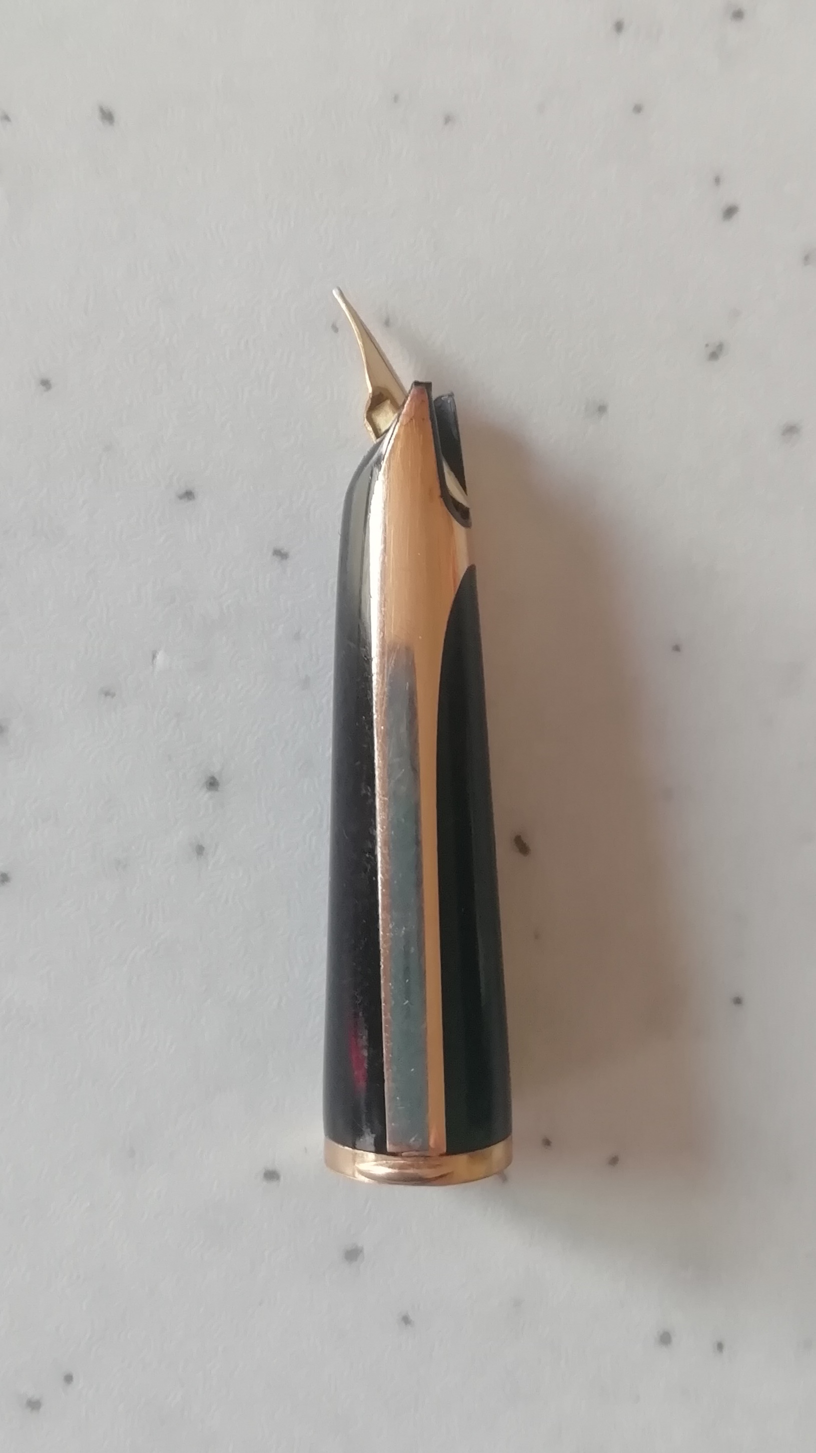 Buongiorno a tutti. Come da titolo, mi sono trovato una CF con l'inserto della sezione rotto nella parte che, passando dietro al pennino, congiunge i due inserti laterali, ho evidenziato il punto nella foto sotto di una CF sana (scusate la qualità, sono in ufficio con mezzi di fortuna).