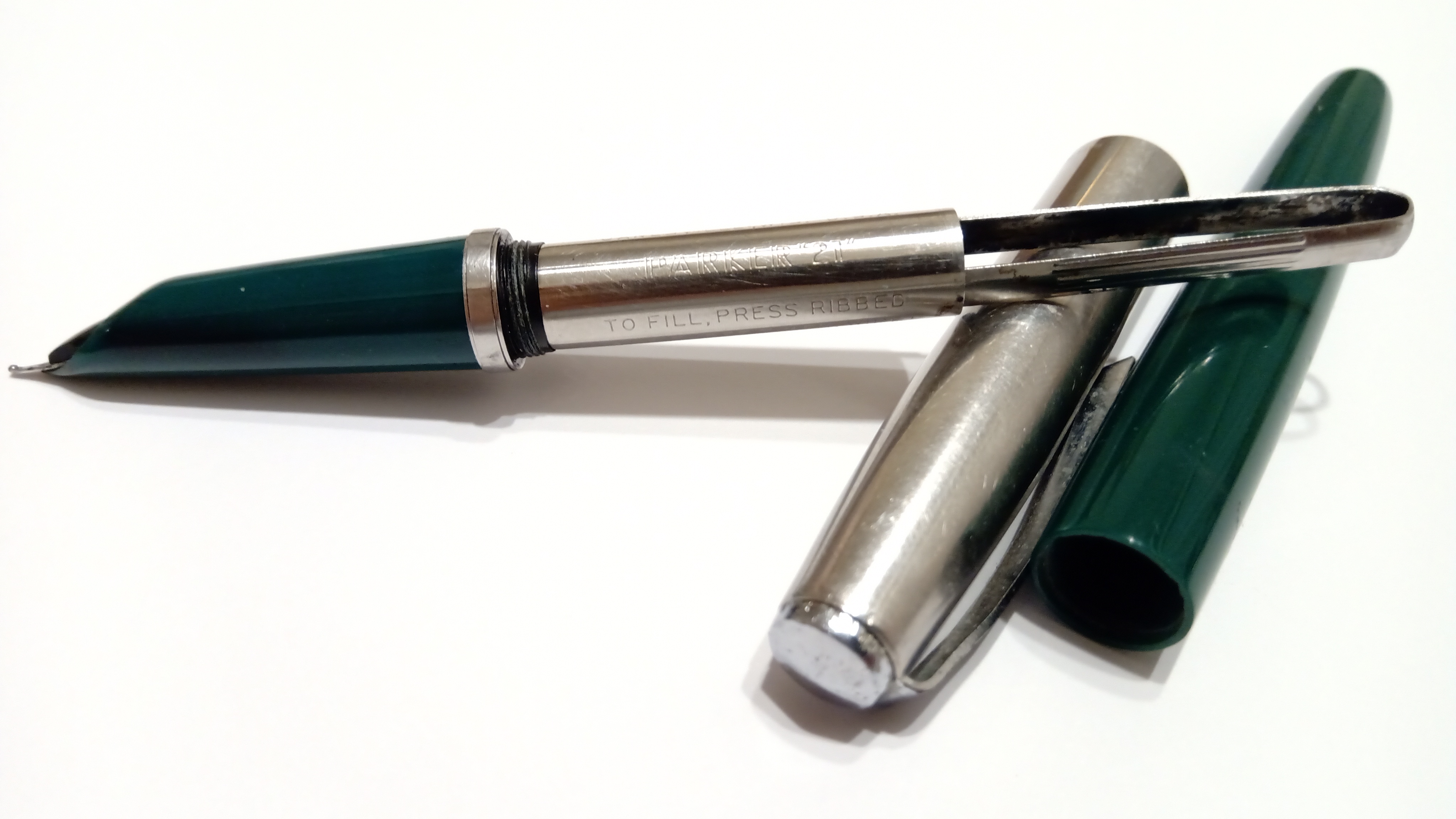 Queridos amigos, hace tiempo atrás junto con otros ejemplares, y con la esperanza de devolverle su inicial belleza, me habían obsequiado una Parker 21 MKI de color verde.
