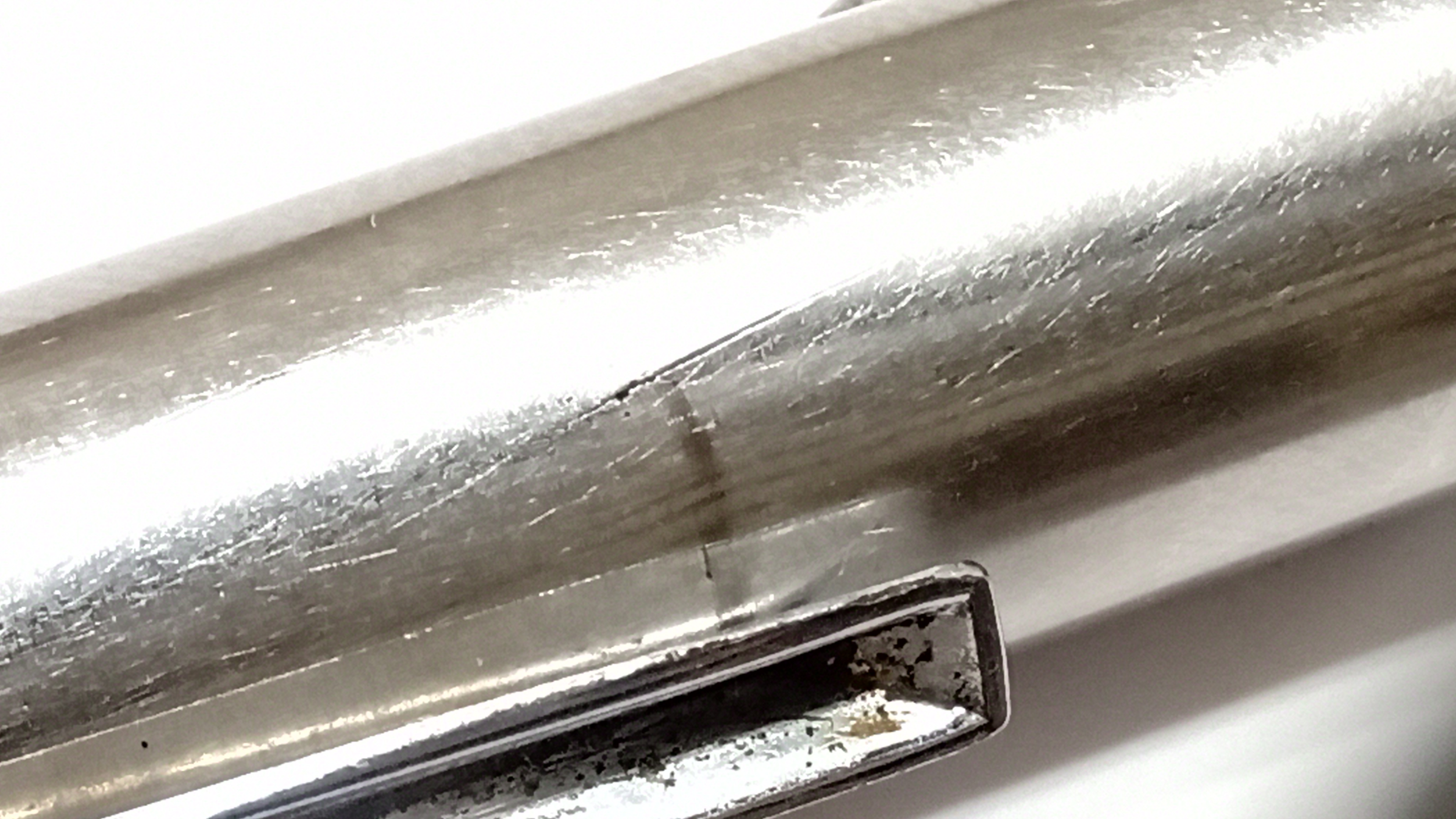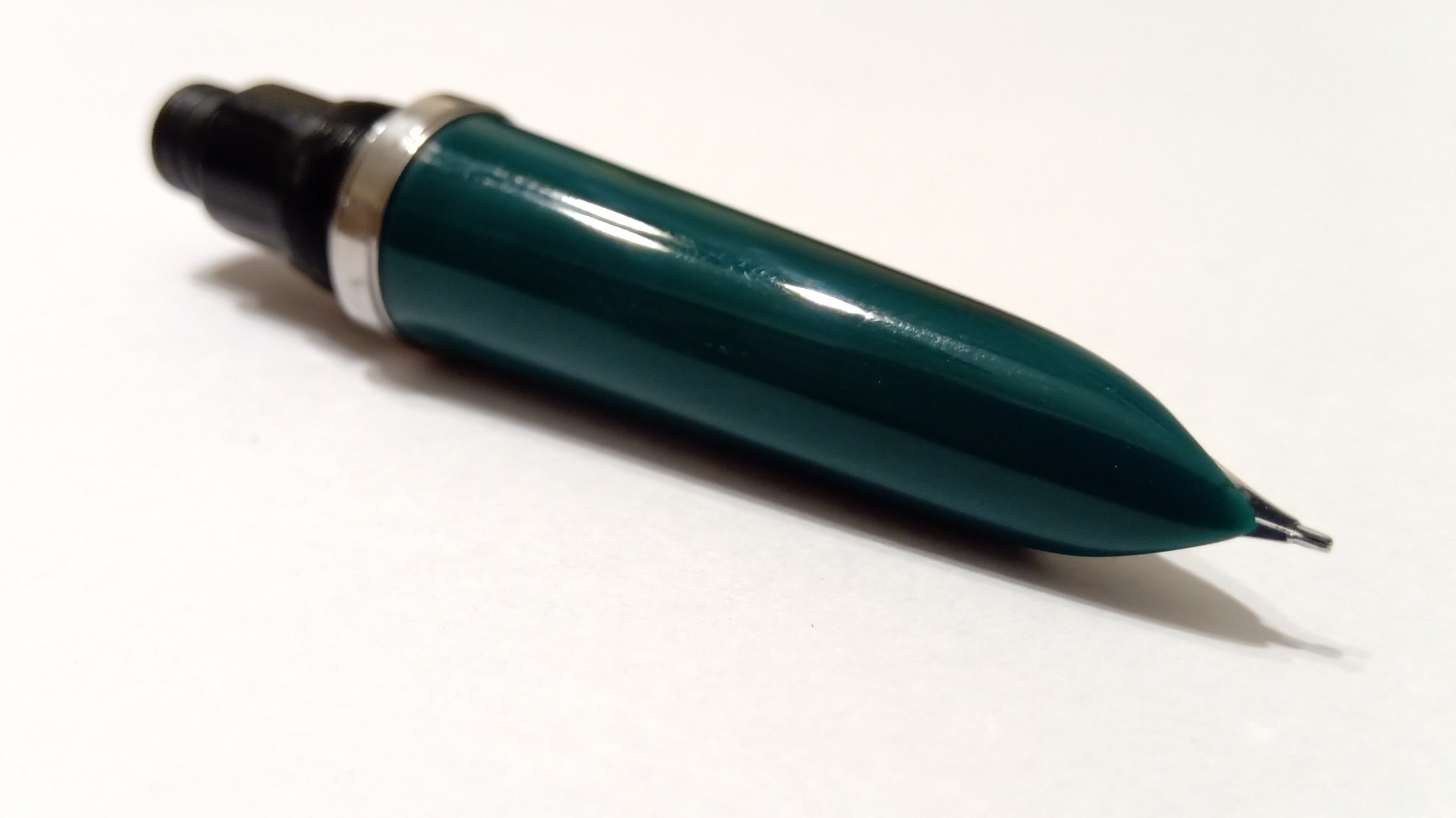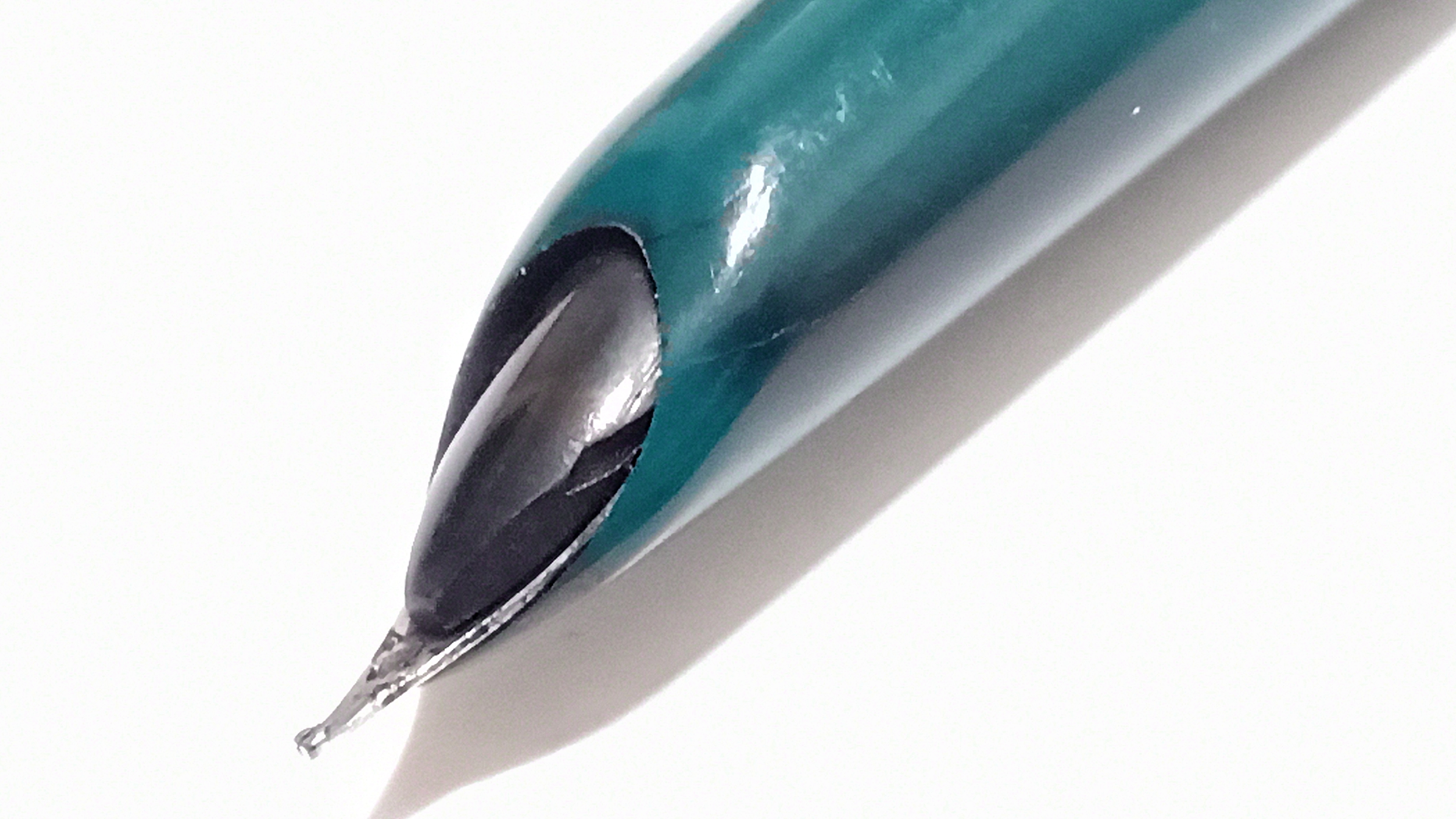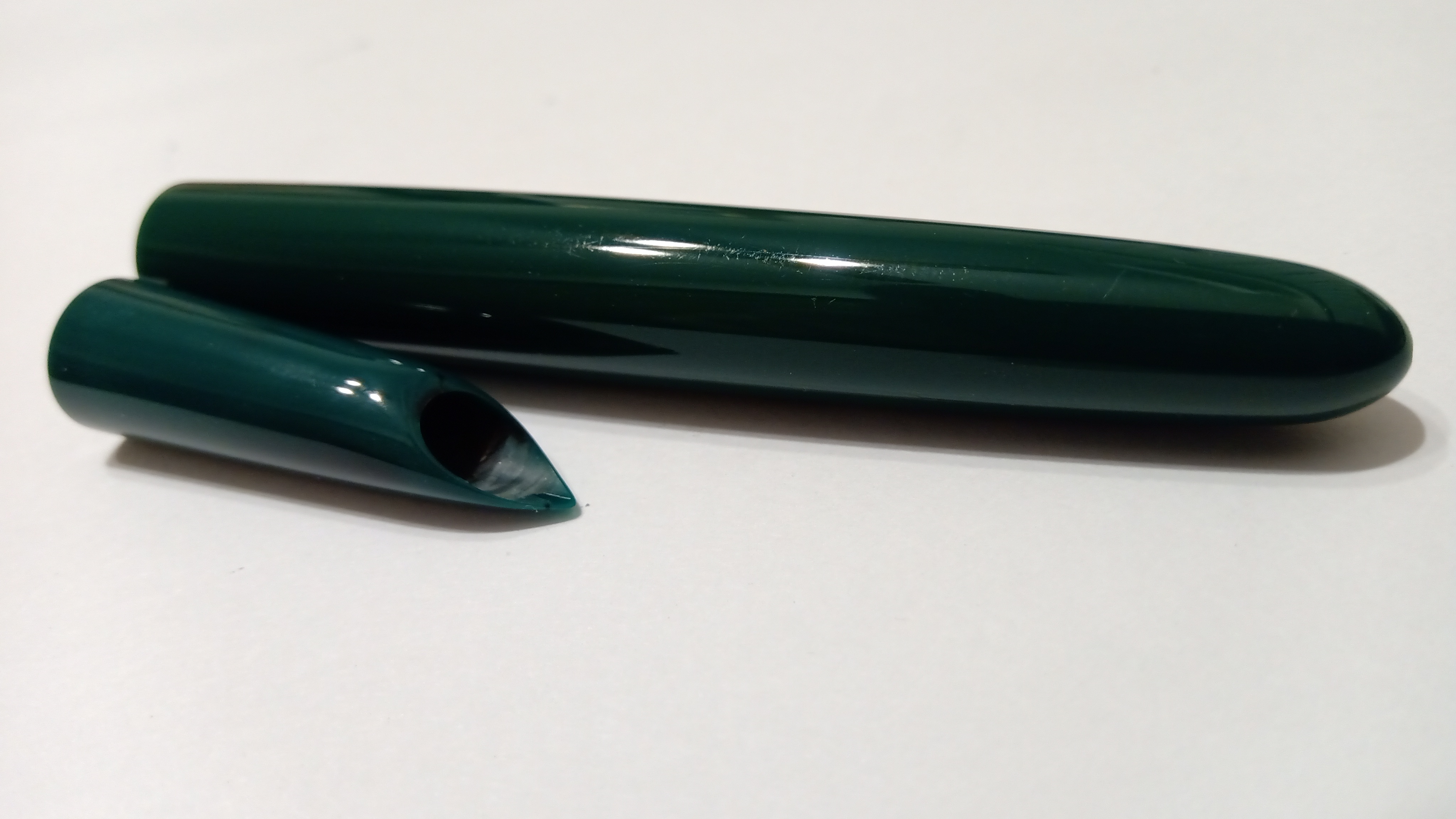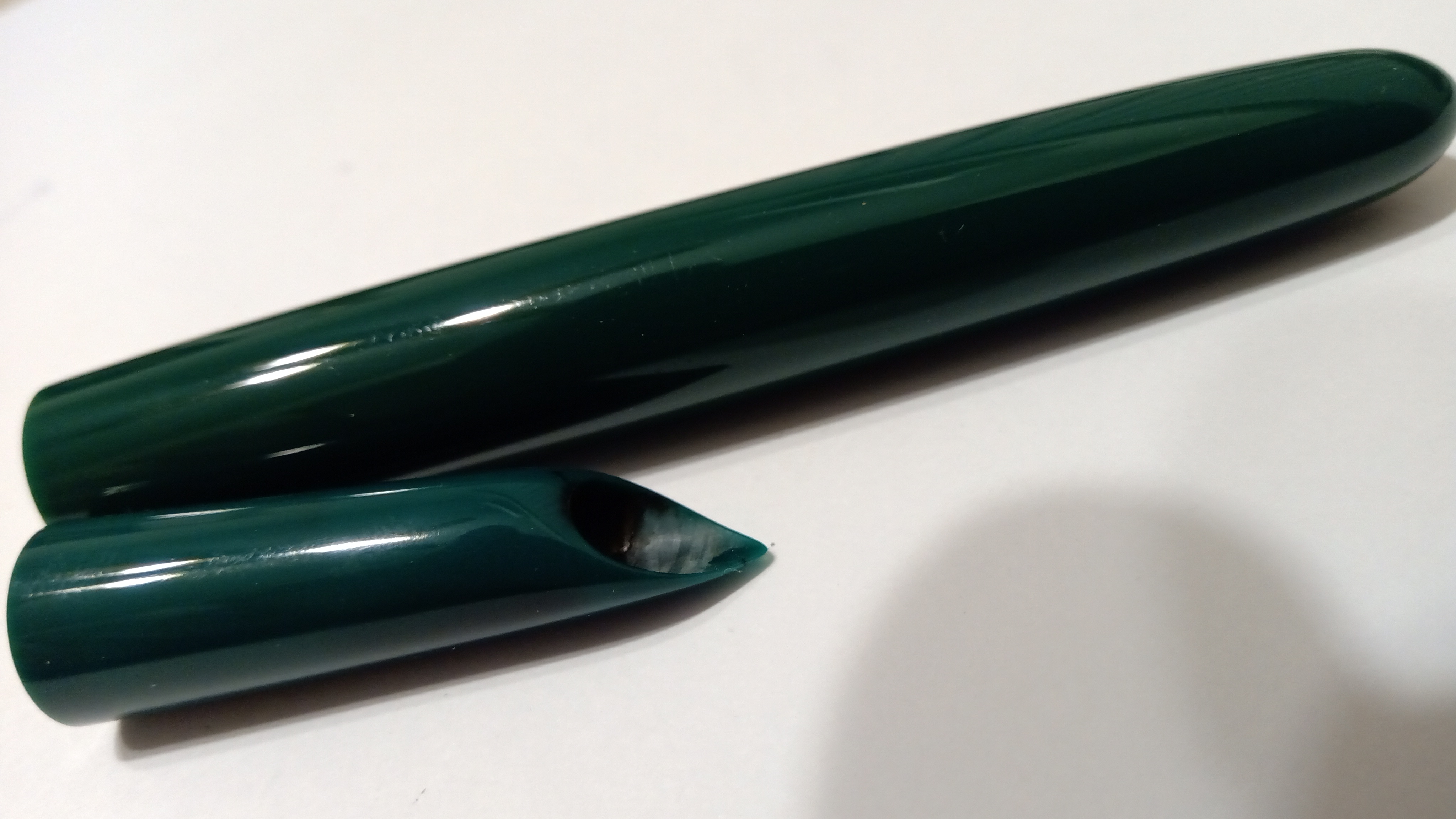 Pueden notarse dos cosas, primero el escaso espesor de la pared del barril, y segundo el acabado en un labio estrecho, que normalmente al roscar con un torque excesivo, o al palanquear en el momento de la escritura con un barril no muy bien ajustado, daba comienzo al inicio de una grieta. Cuando se escuchaba el "click" del acrílico partiéndose ya era demasiado tarde.
