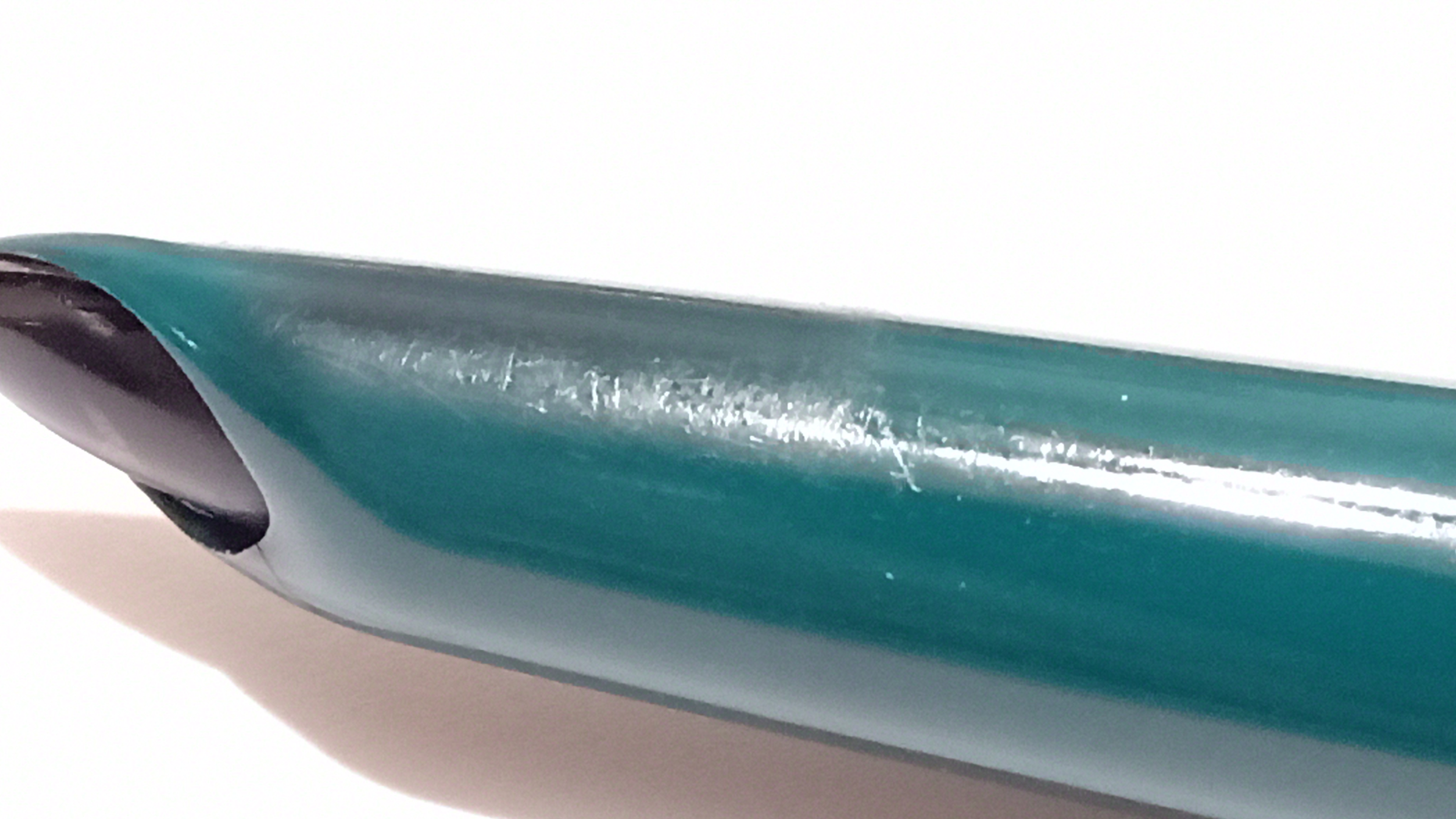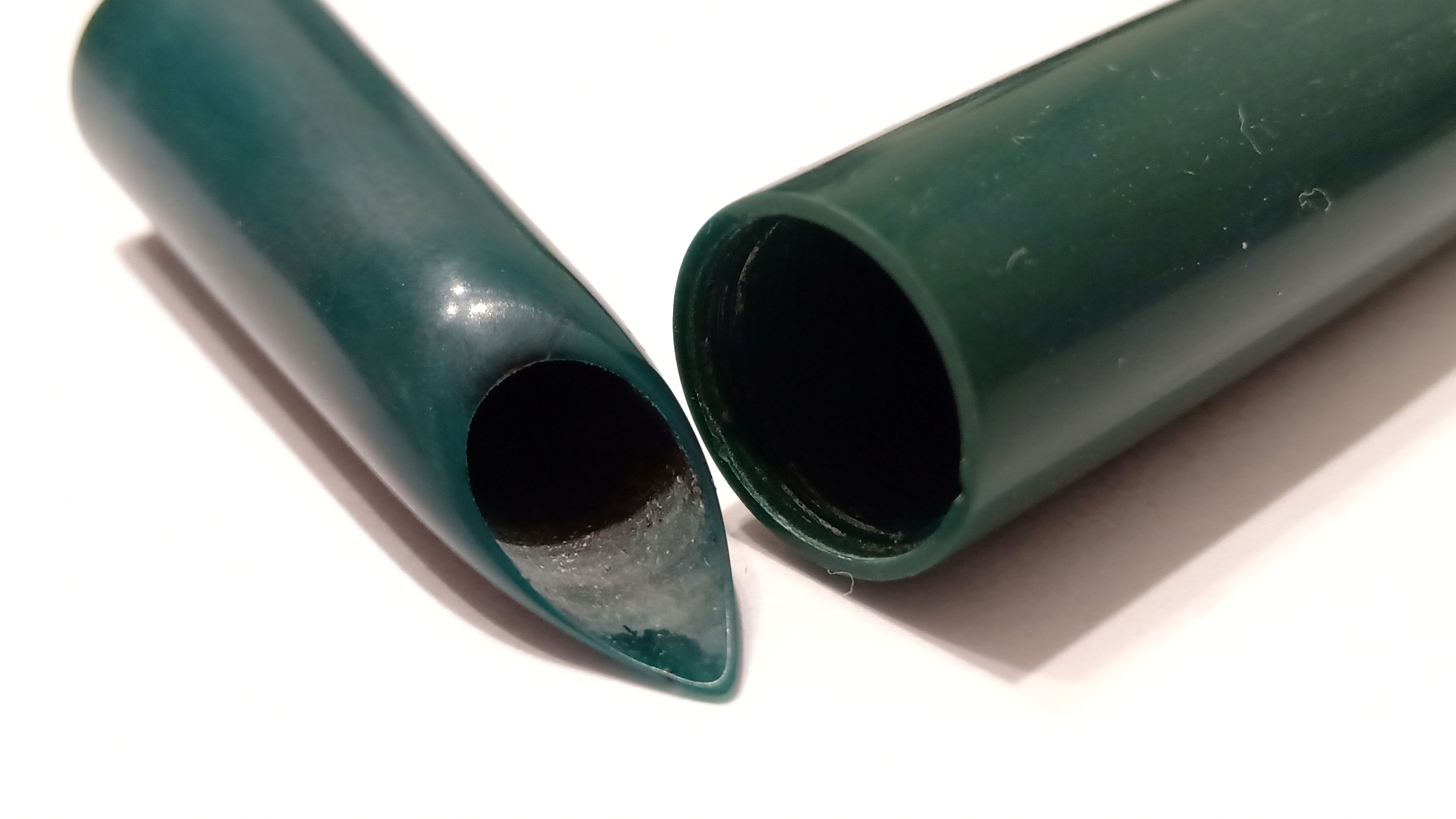 Si possono notare due cose: innanzitutto lo spessore ridotto della parete del fusto e, in secondo luogo, la finitura con un bordo stretto che, normalmente, quando si avvitava con una coppia eccessiva o si faceva leva durante la scrittura con un fusto non ben fissato, dava inizio alla formazione di una crepa. Quando si sentiva il “clic” dell'acrilico che si rompeva, era ormai troppo tardi.