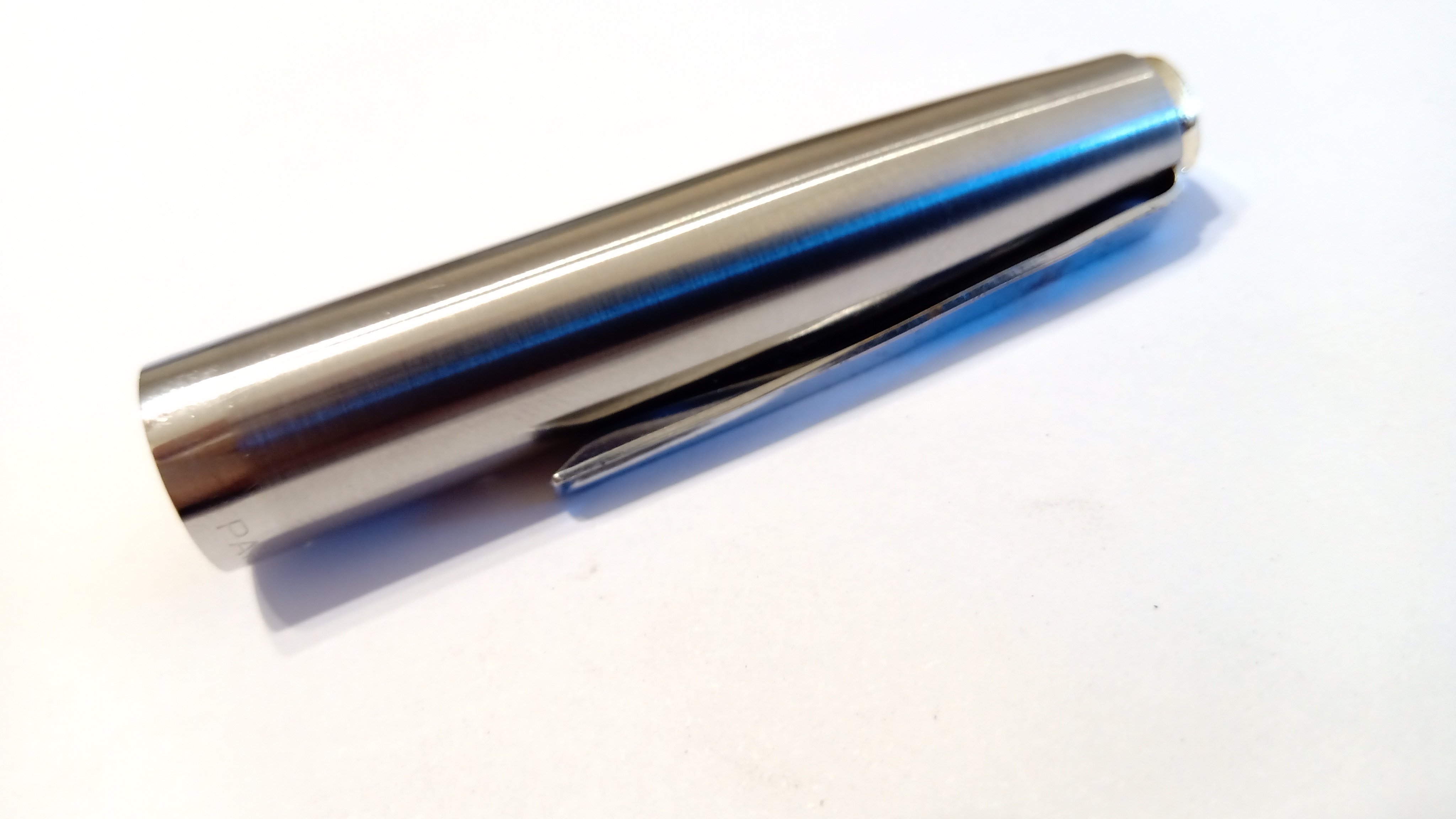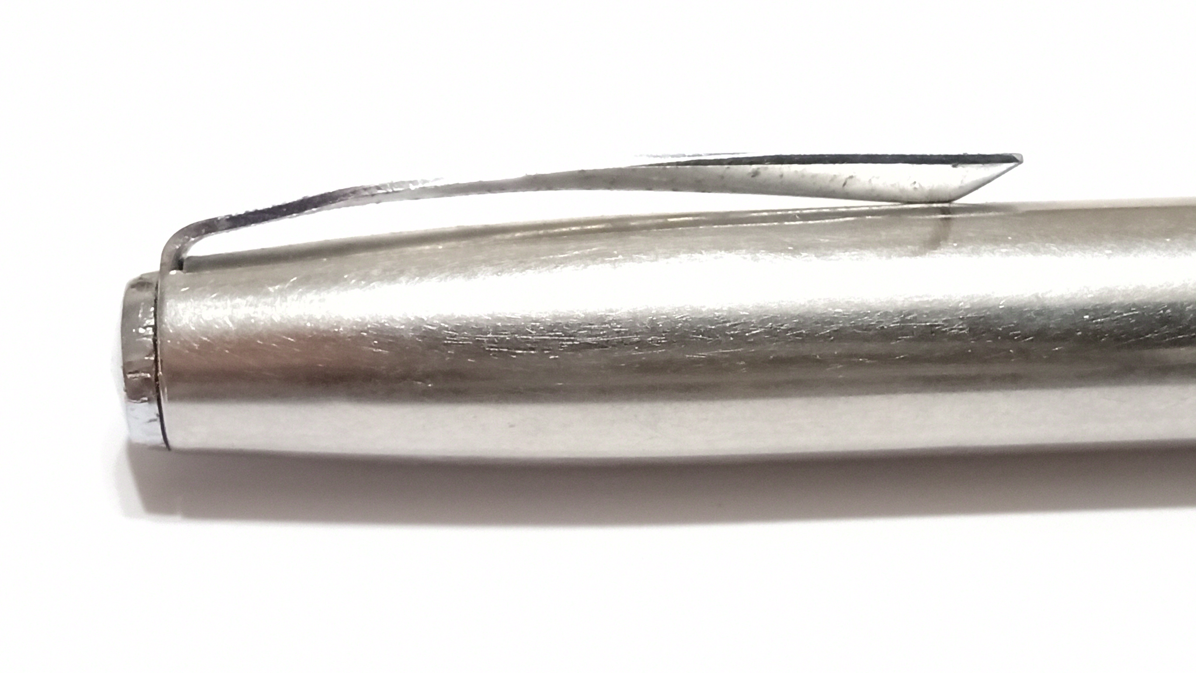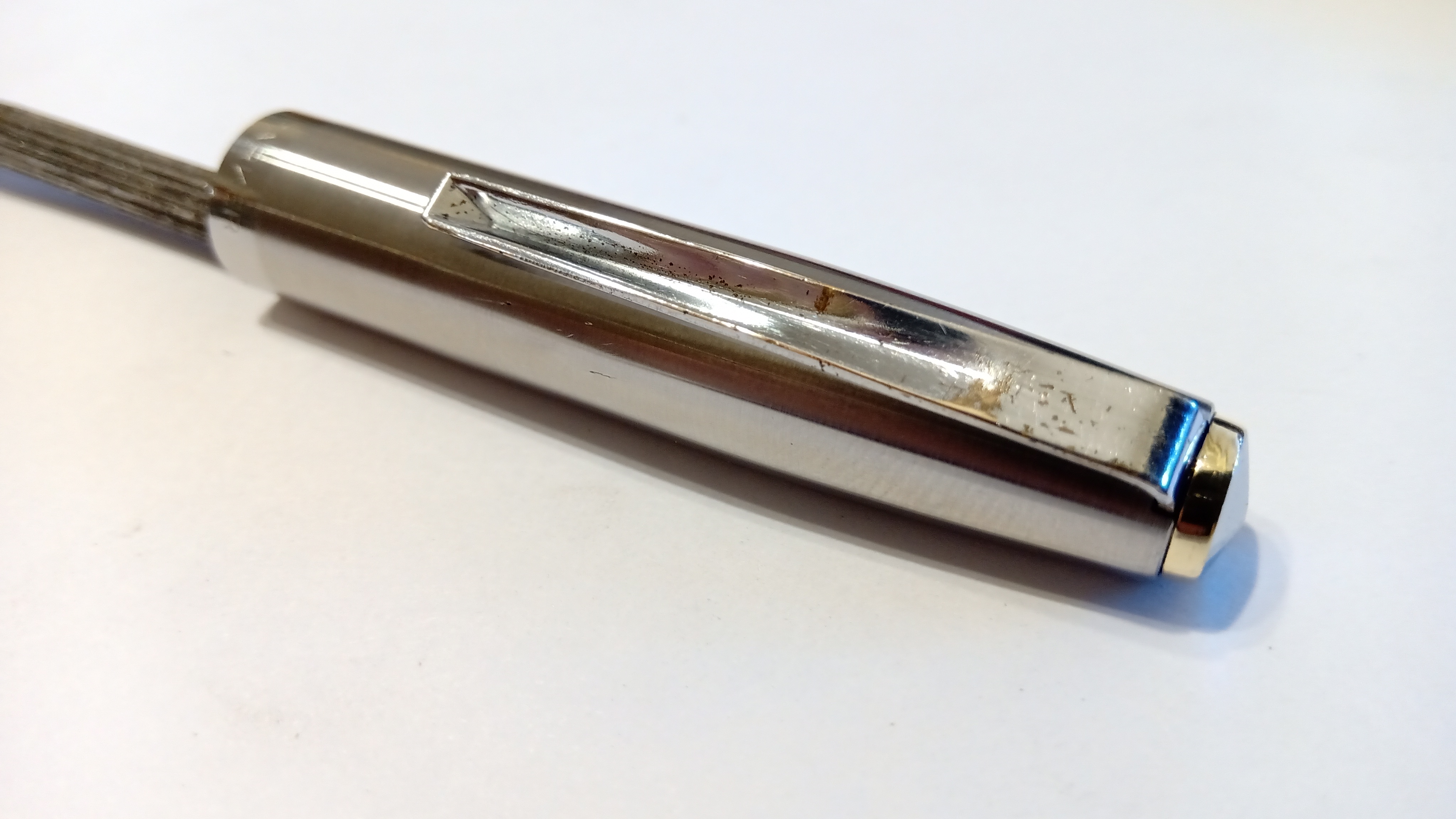 Llegamos así al capuchón, normalmente construído en Lustraloy, un acero inoxidable austenítico sin propiedades magnéticas en algunas versiones cepillado y en versiones posteriores arenado, con una joya o botón de latón cromado al igual que el clip. La joya va roscada en el inner-cap asegurando el clip, y seguramente acabó mellada y el clip deformado en una tentativa de ser desenroscada...