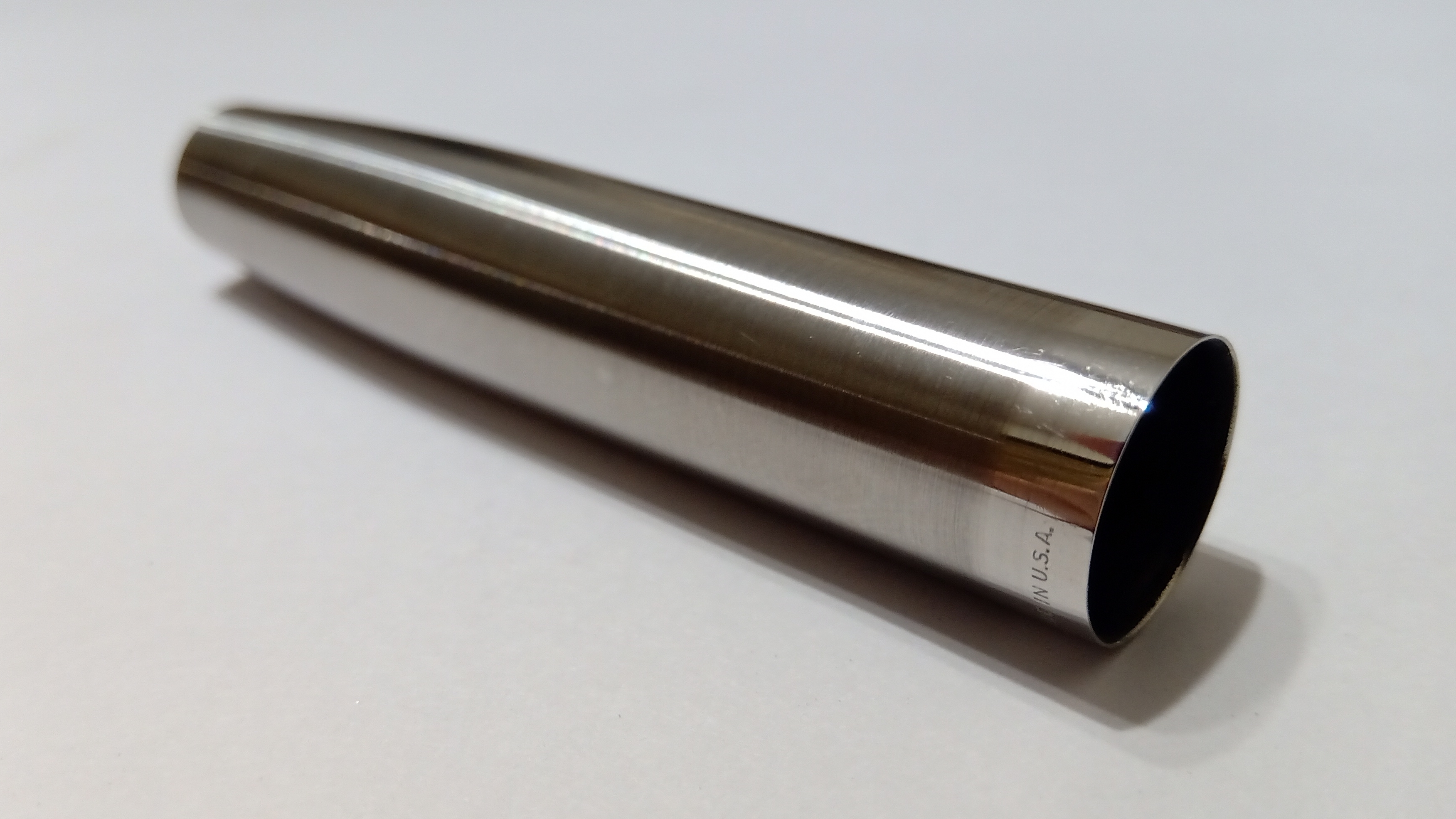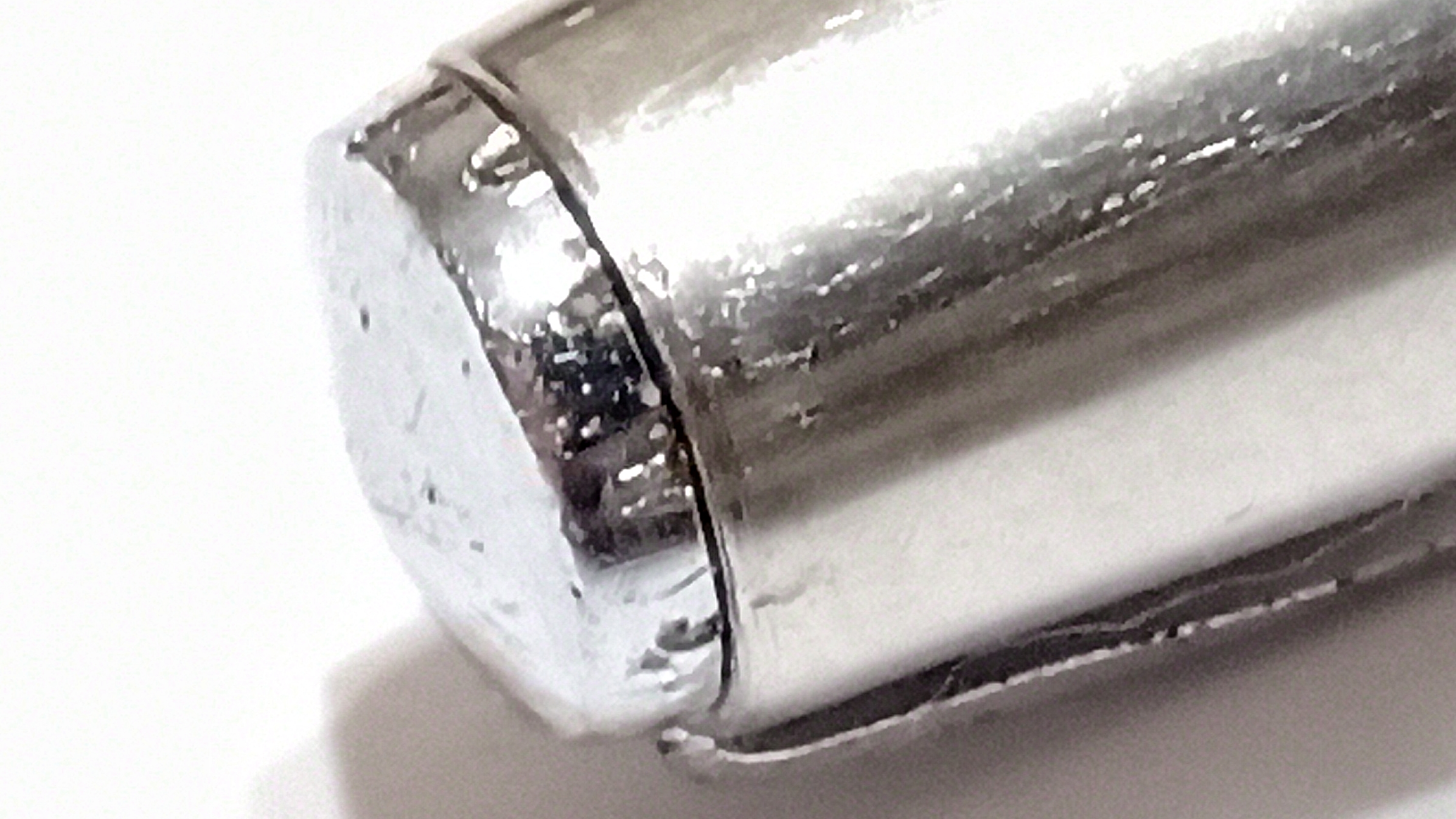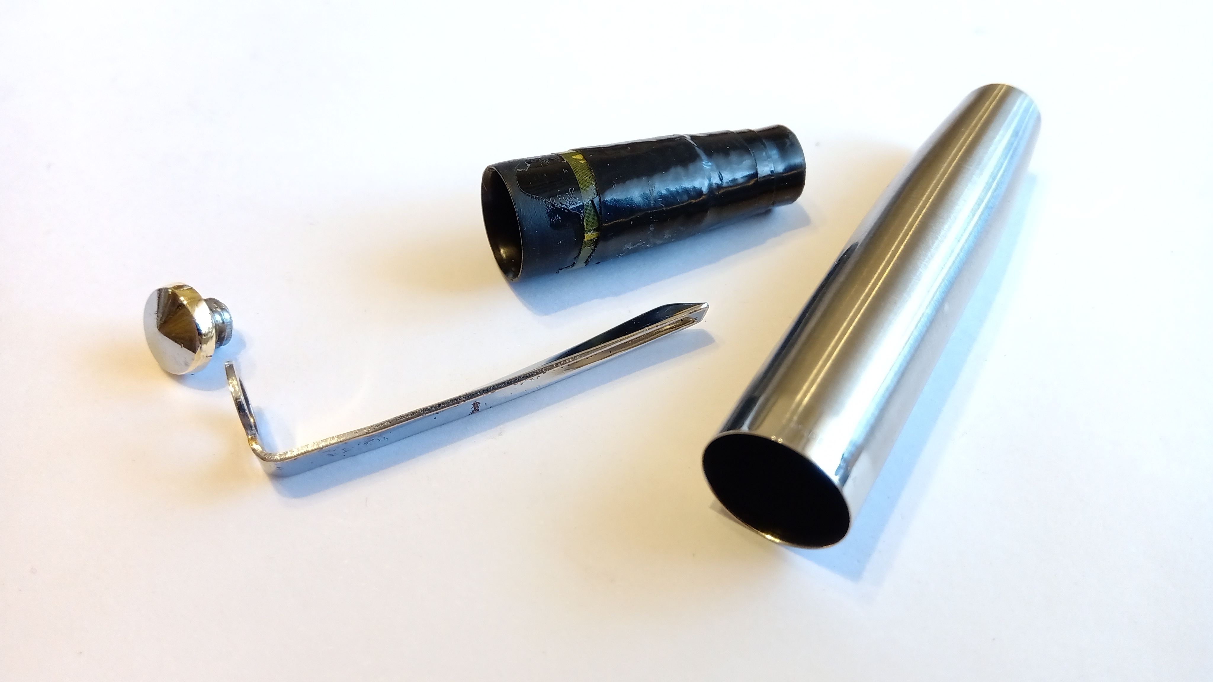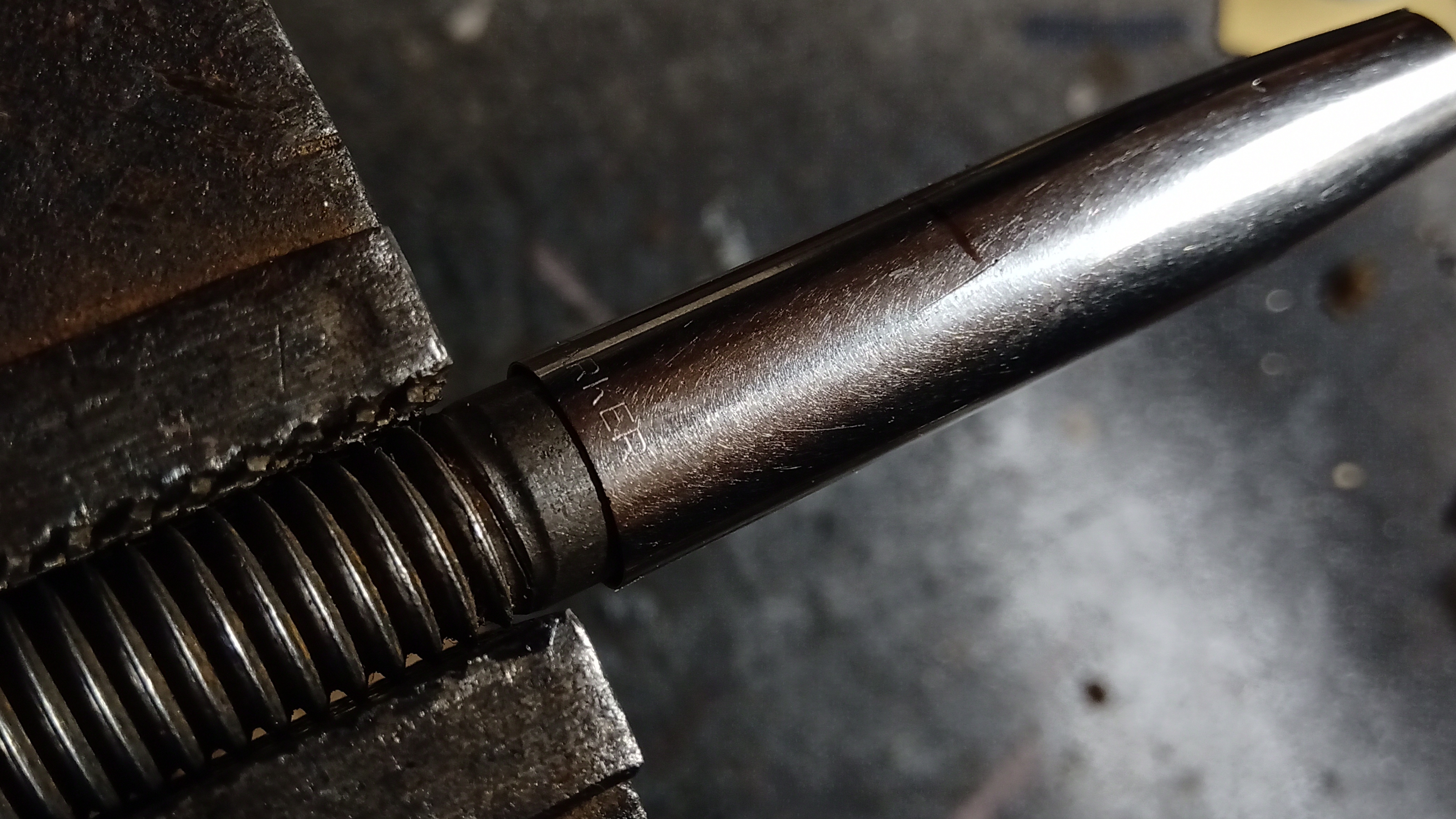 Llegamos así al capuchón, normalmente construído en Lustraloy, un acero inoxidable austenítico sin propiedades magnéticas en algunas versiones cepillado y en versiones posteriores arenado, con una joya o botón de latón cromado al igual que el clip. La joya va roscada en el inner-cap asegurando el clip, y seguramente acabó mellada y el clip deformado en una tentativa de ser desenroscada...