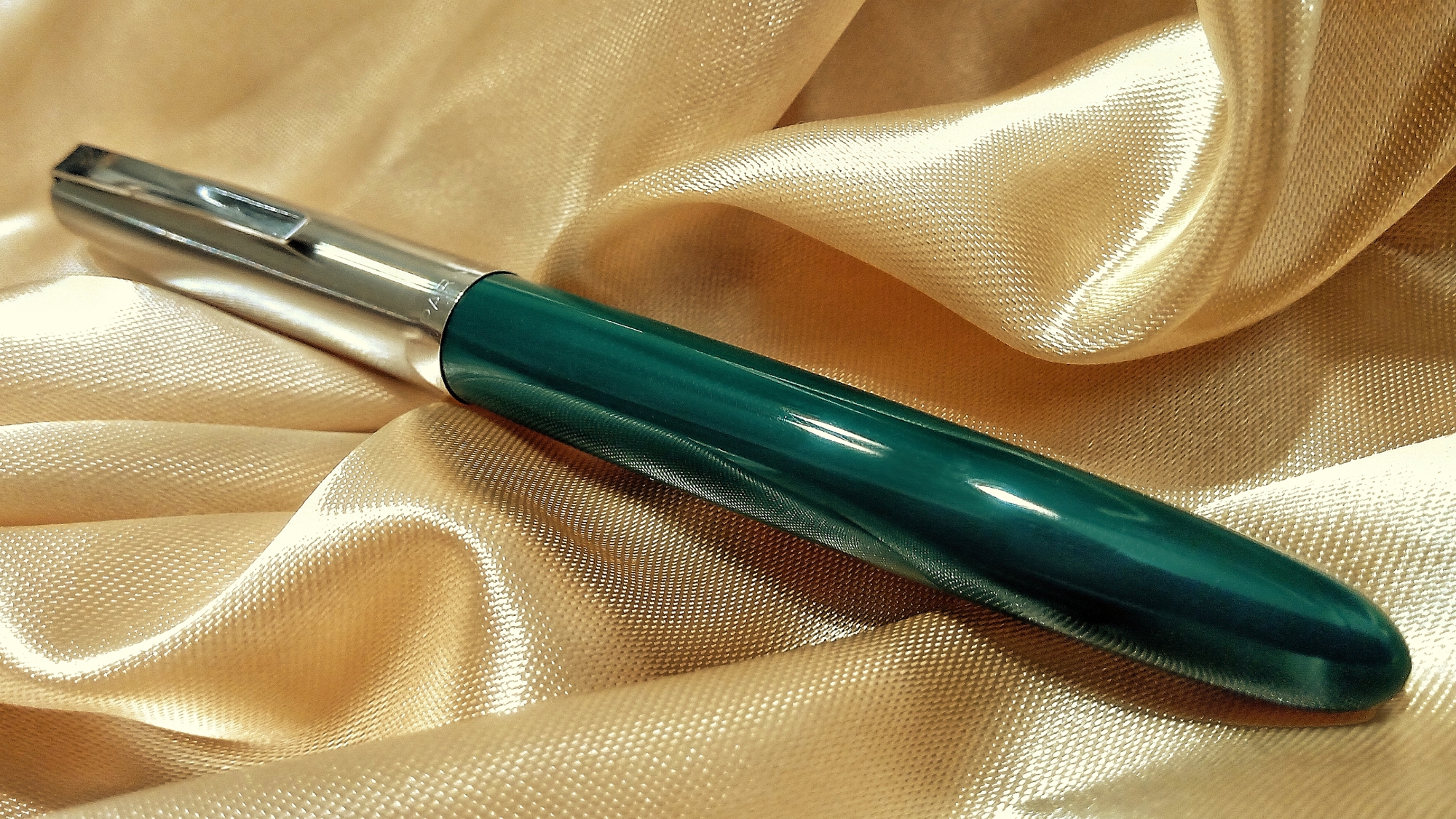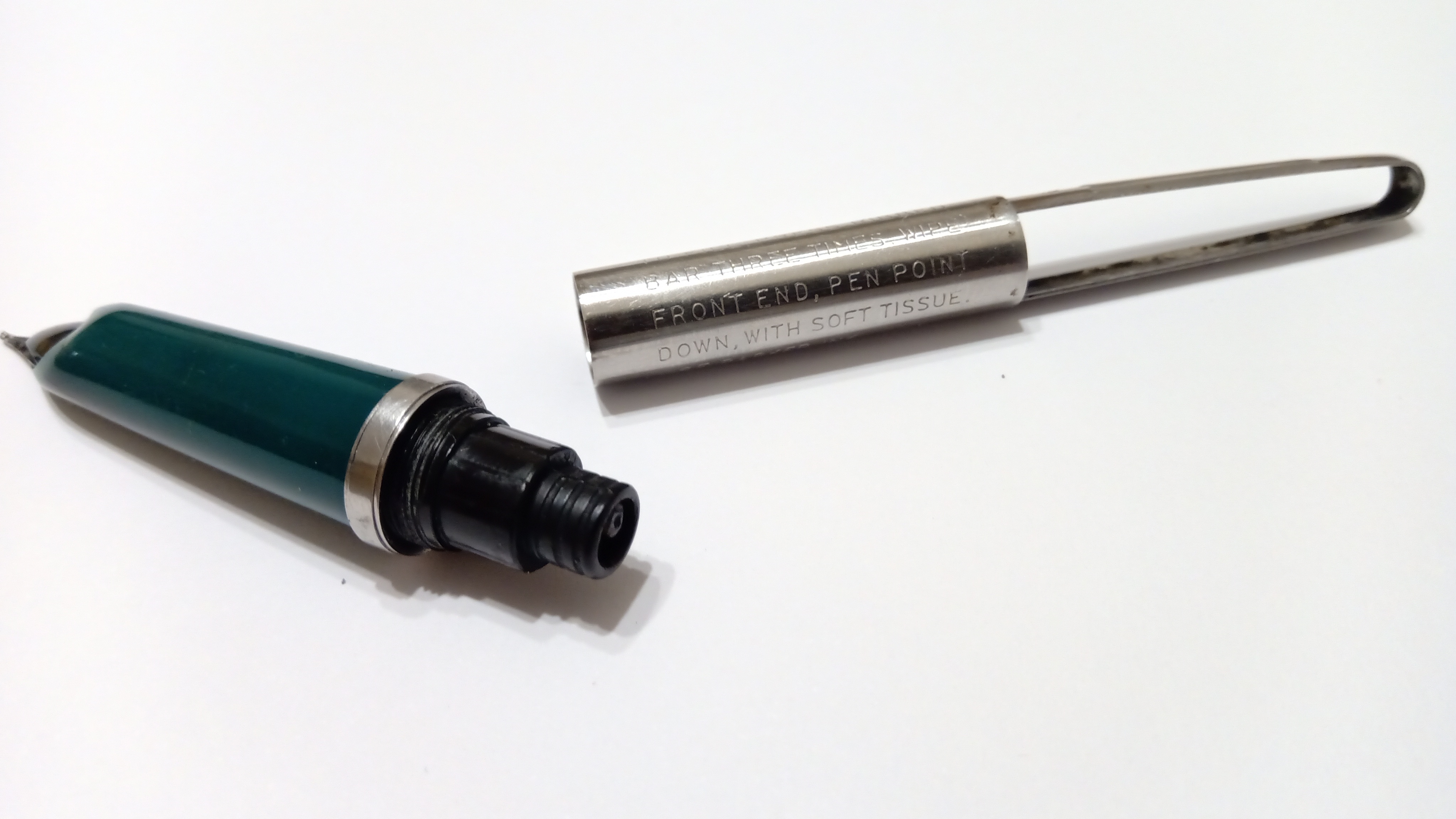 con un capuchón con cierre slip fabricado en Lustraloy, un clip muy práctico e interesante de latón cromado, y un sistema ingenioso de arandela elástica flotante para cerrar y anclar el conjunto grip/barril en el capuchón, con lo cual reemplazaban el anillo rígido de acero y la jaula elástica interna colocada en el capuchón de la 51...