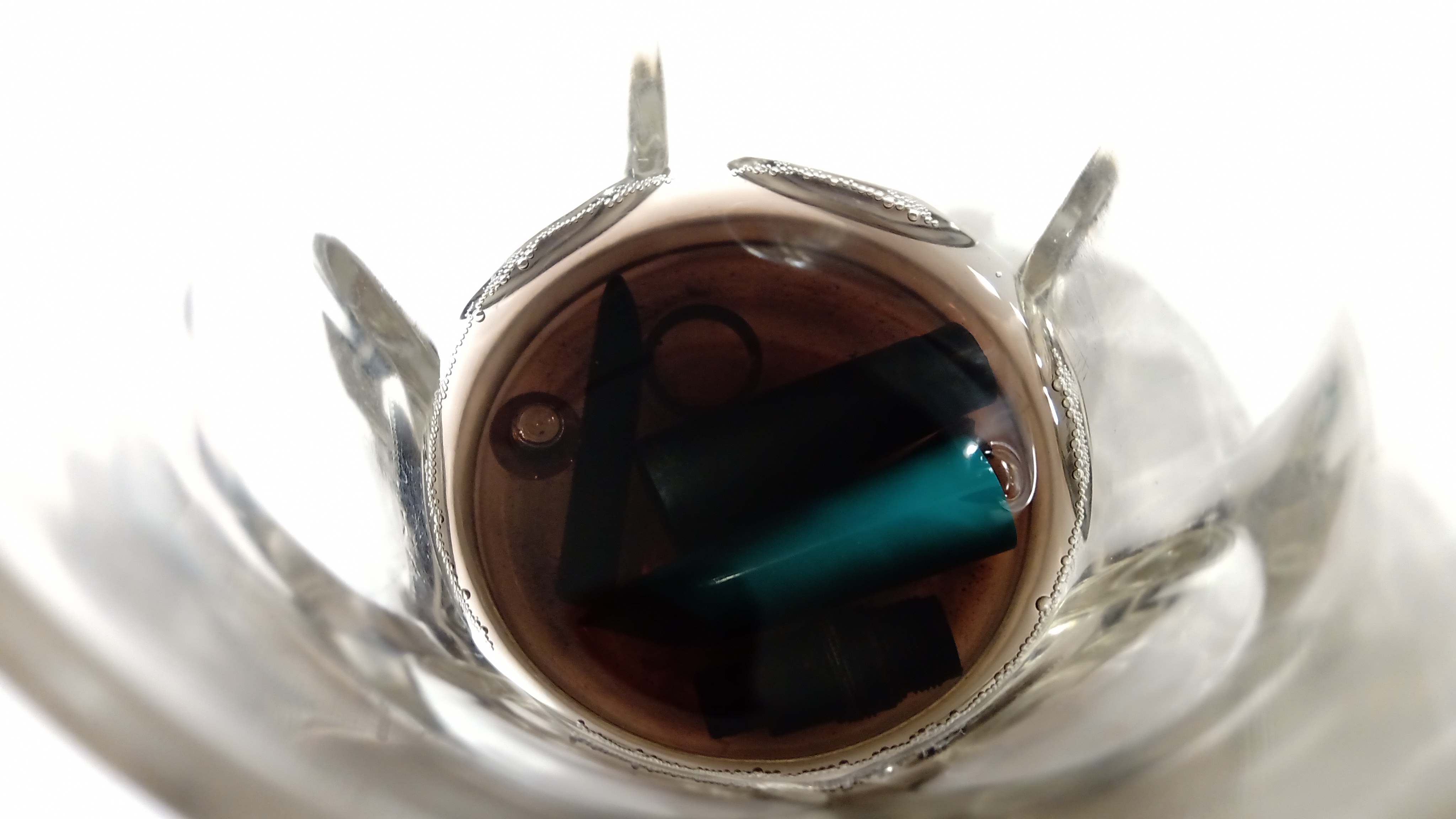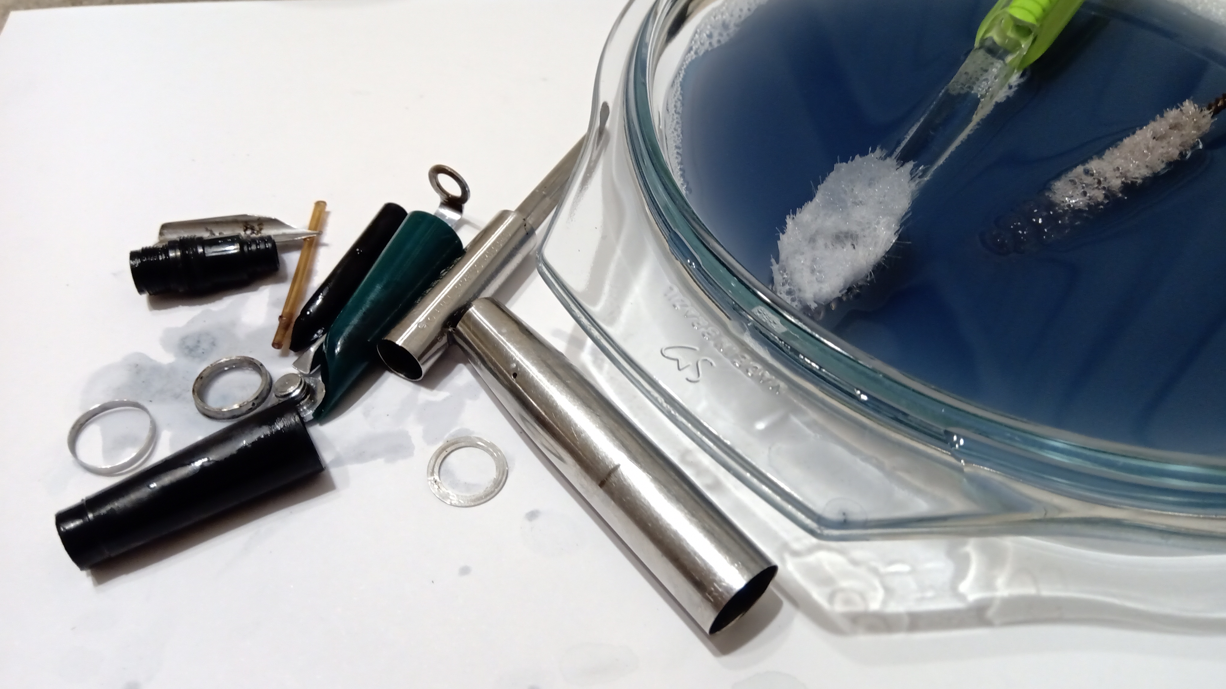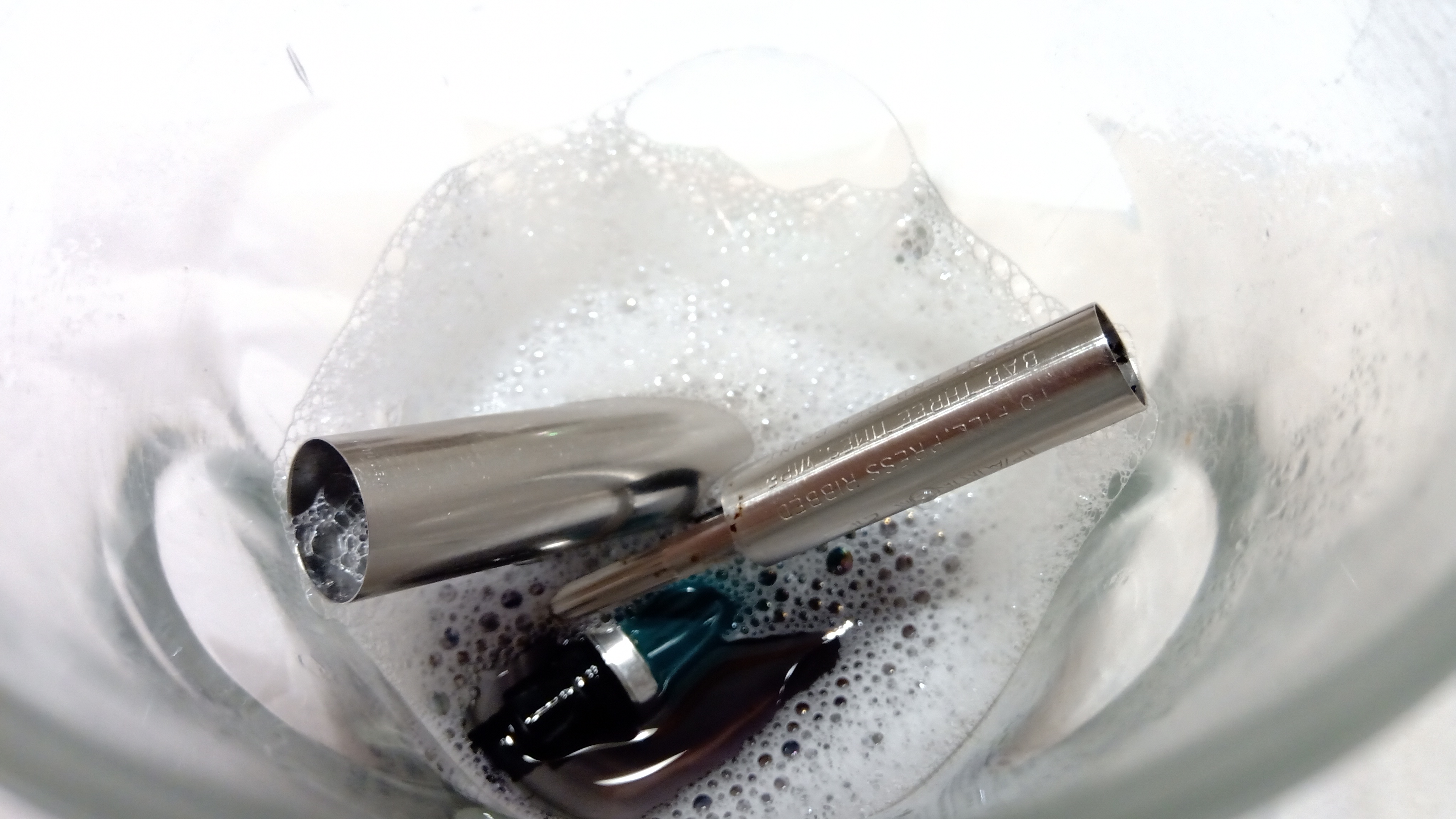 Ho quindi messo sia il cappuccio che l'impugnatura assemblata in una soluzione tensioattiva per cercare di rimuovere tutto l'inchiostro secco e facilitare lo smontaggio...