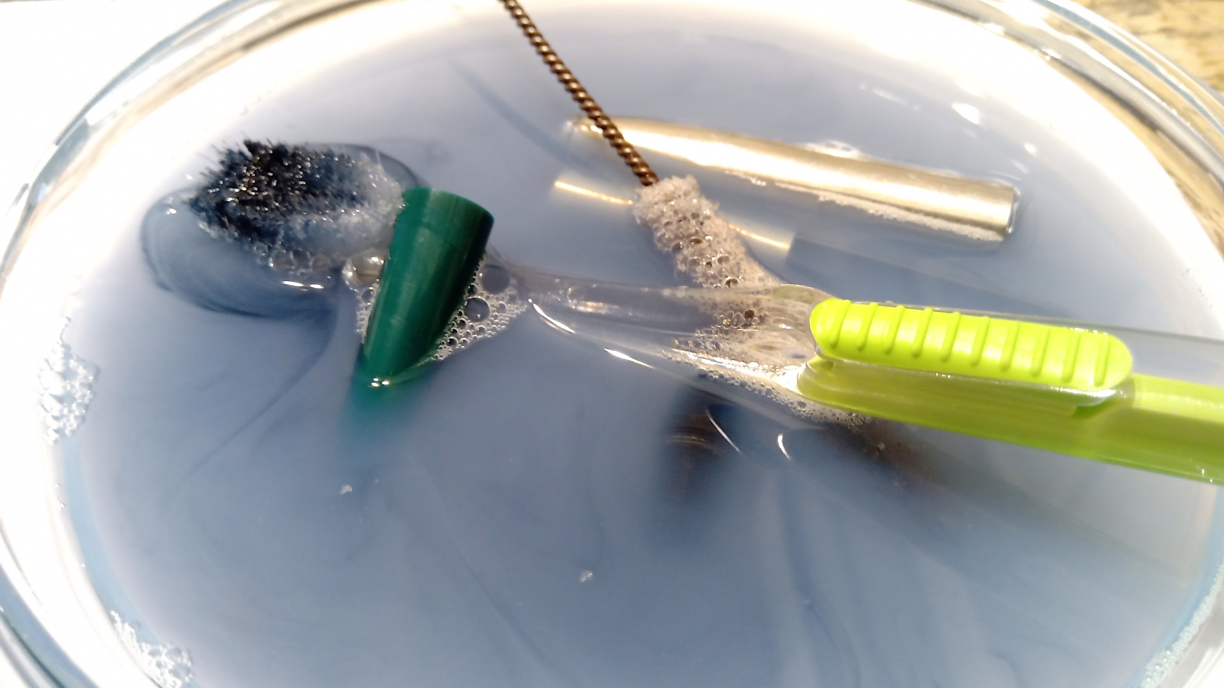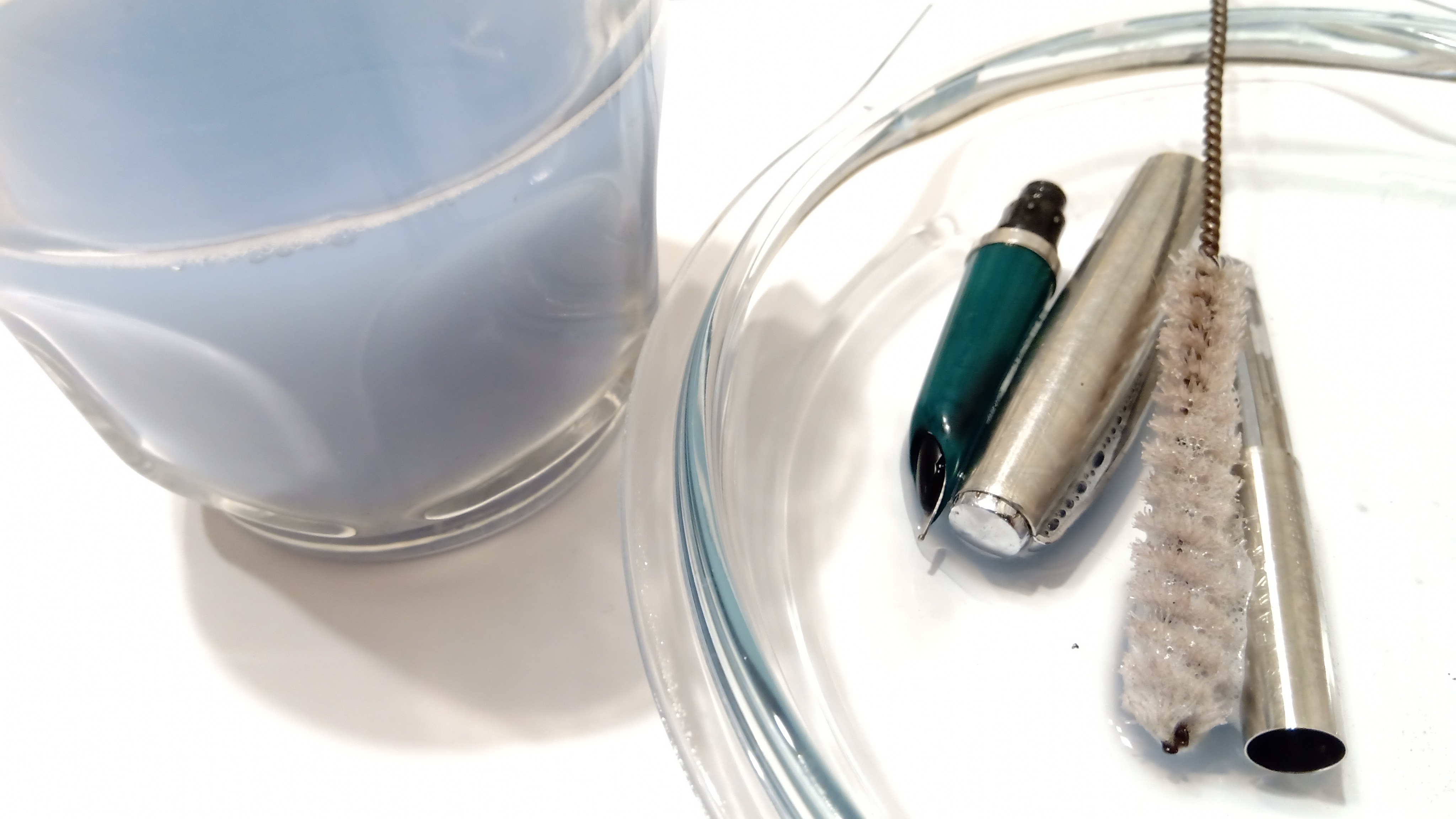 e di nuovo l'impugnatura, ora con solo il pennino, da pulire con detergente e una spazzolina cilindrica,
