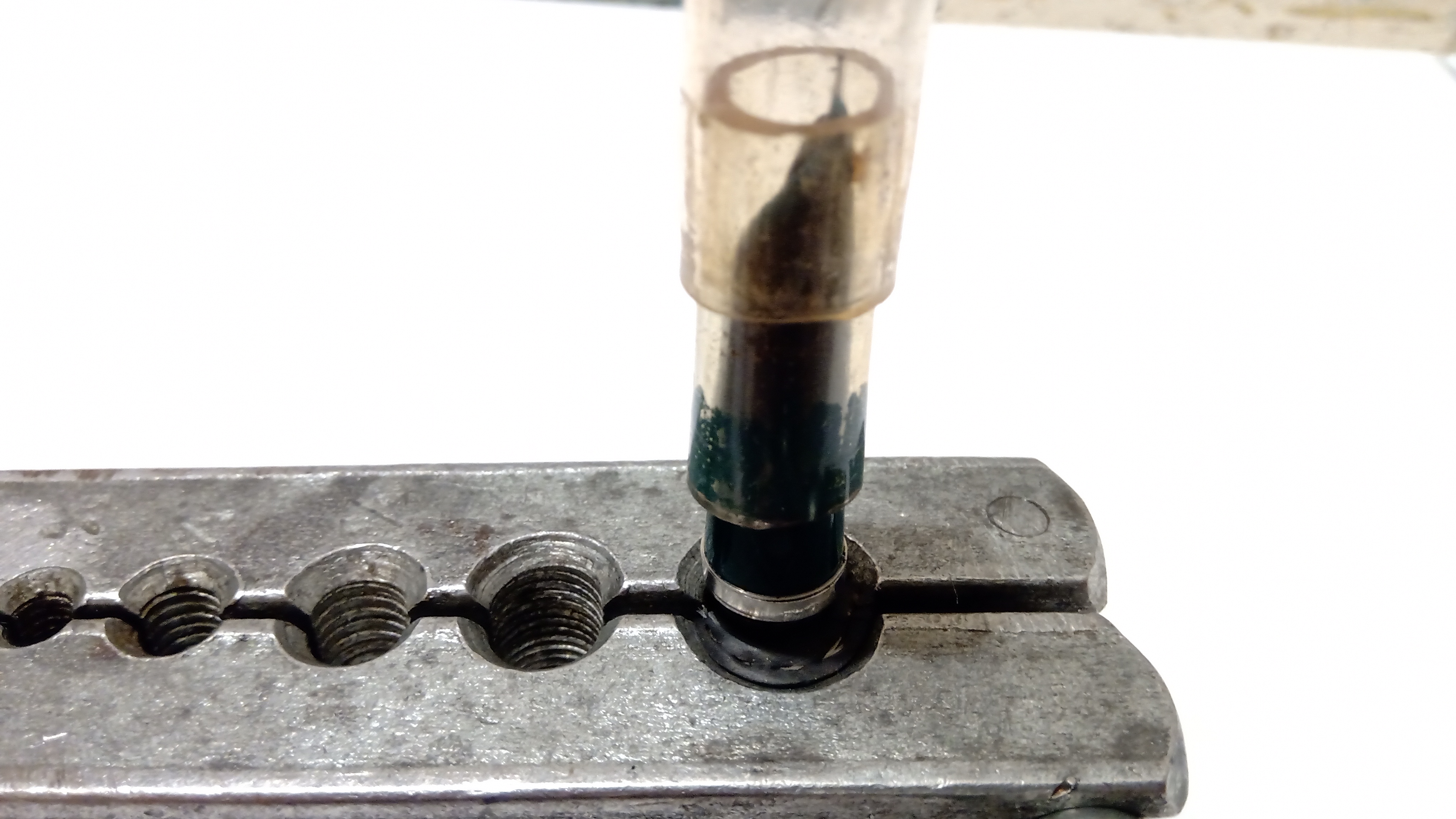 Aproveché también para desarmar el capuchón, asegurando el inner-cap con una barra de acero para evitar su rotación, y desenroscando la joya calzando la misma en un cañito de PVC para no continuar mellándola...