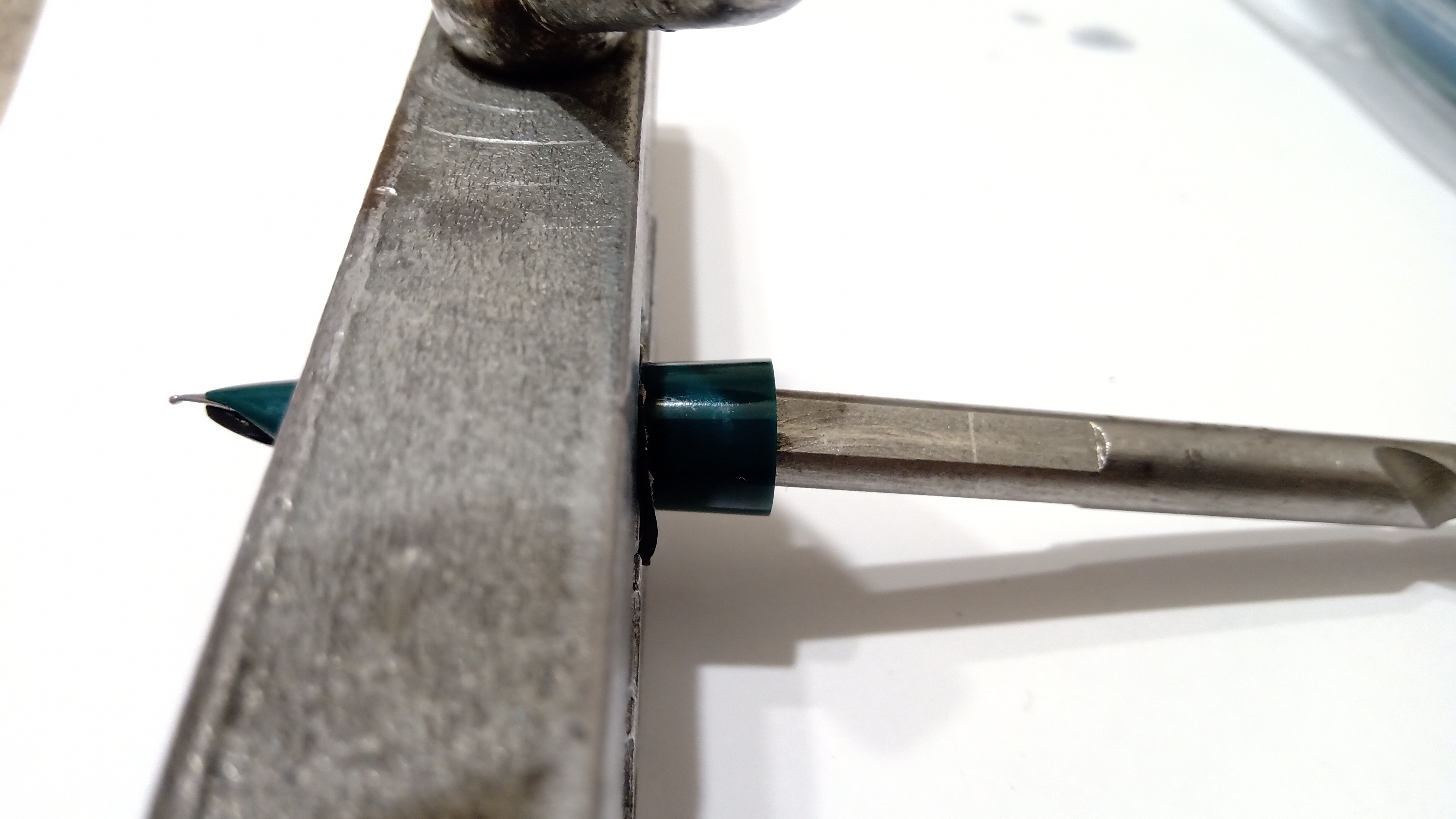Ho quindi posizionato la parte dell'impugnatura su cui è fissato l'alimentatore con il pennino nella morsa cilindrica con sede in gomma, ho rimosso la cannula di respirazione fissata all'alimentatore e, una volta fissata l'impugnatura, ho spinto l'alimentatore con una bacchetta di acciaio e piccoli colpi, facendolo uscire dalla parte anteriore...