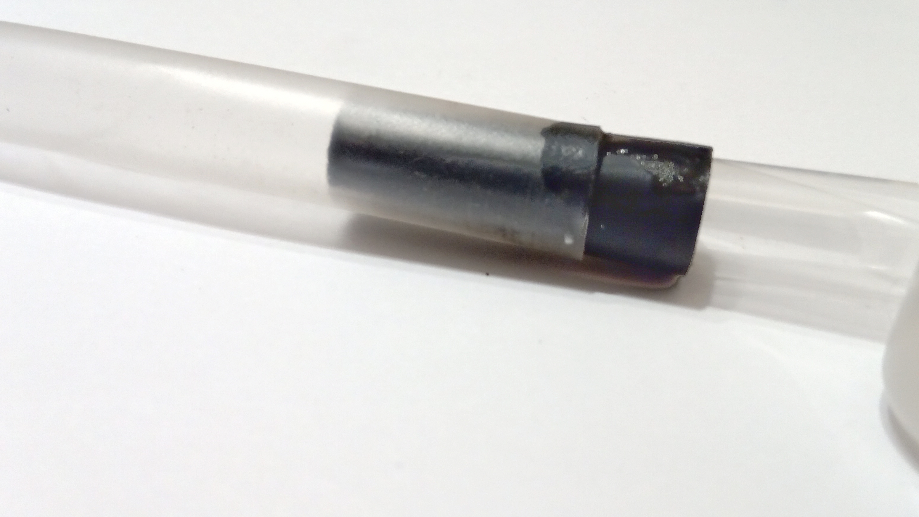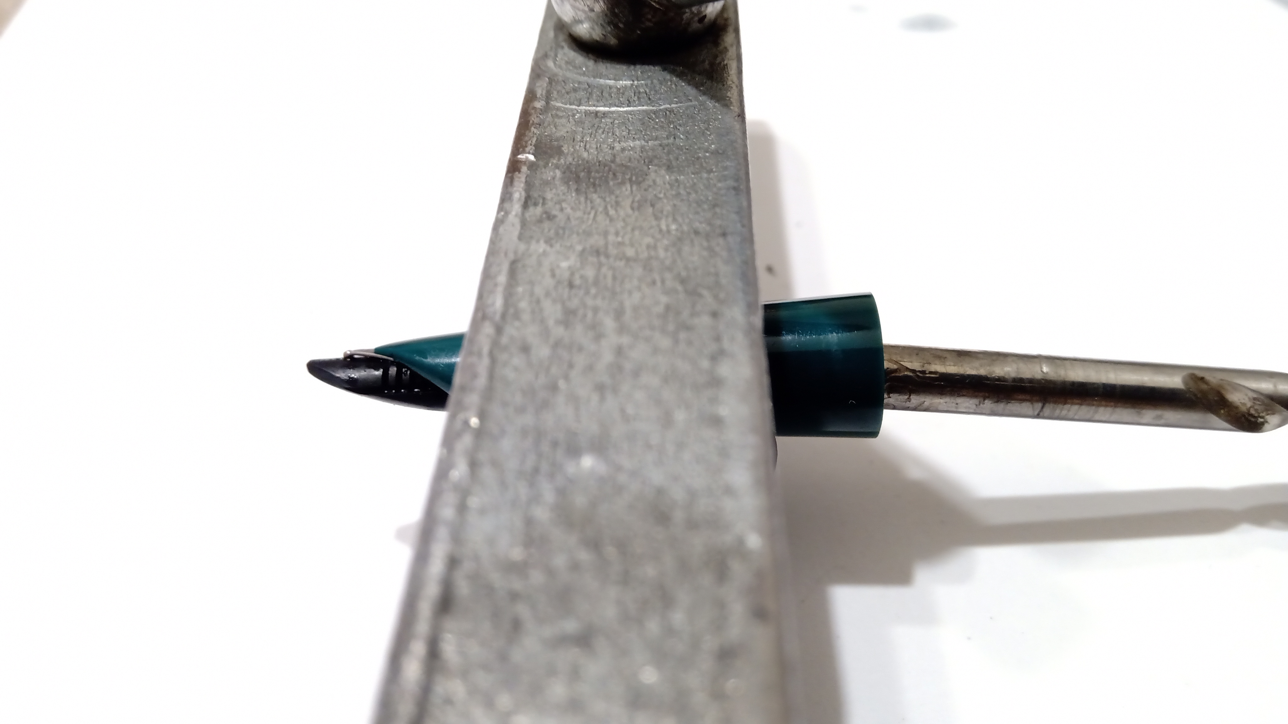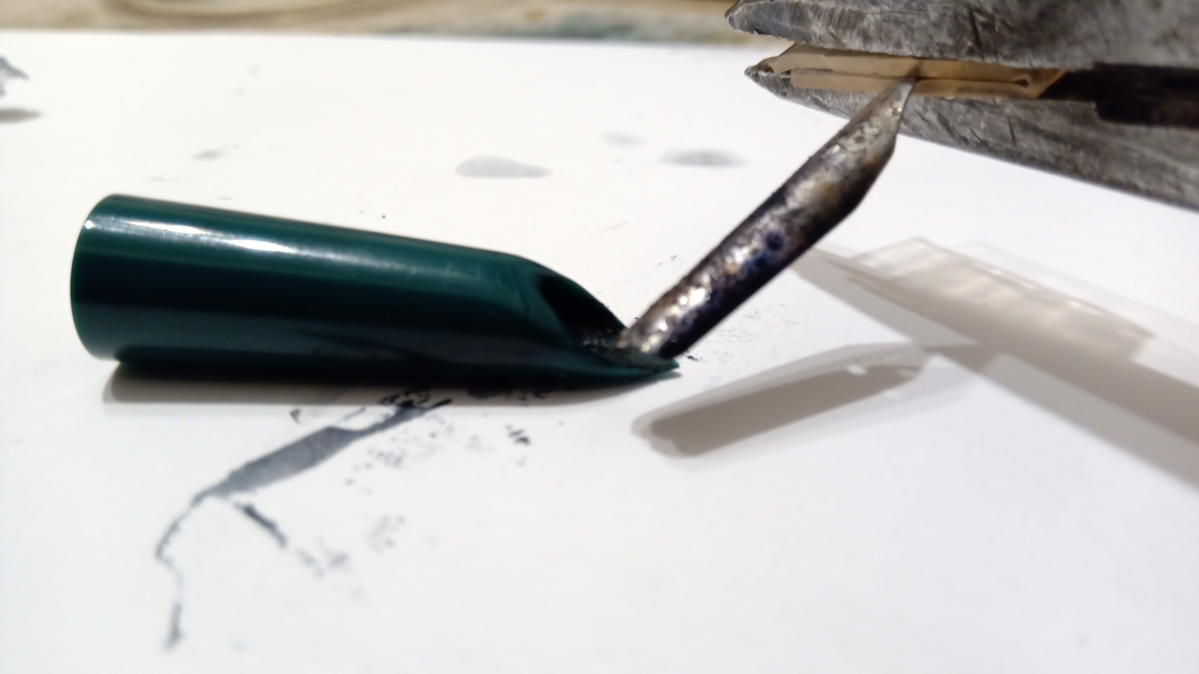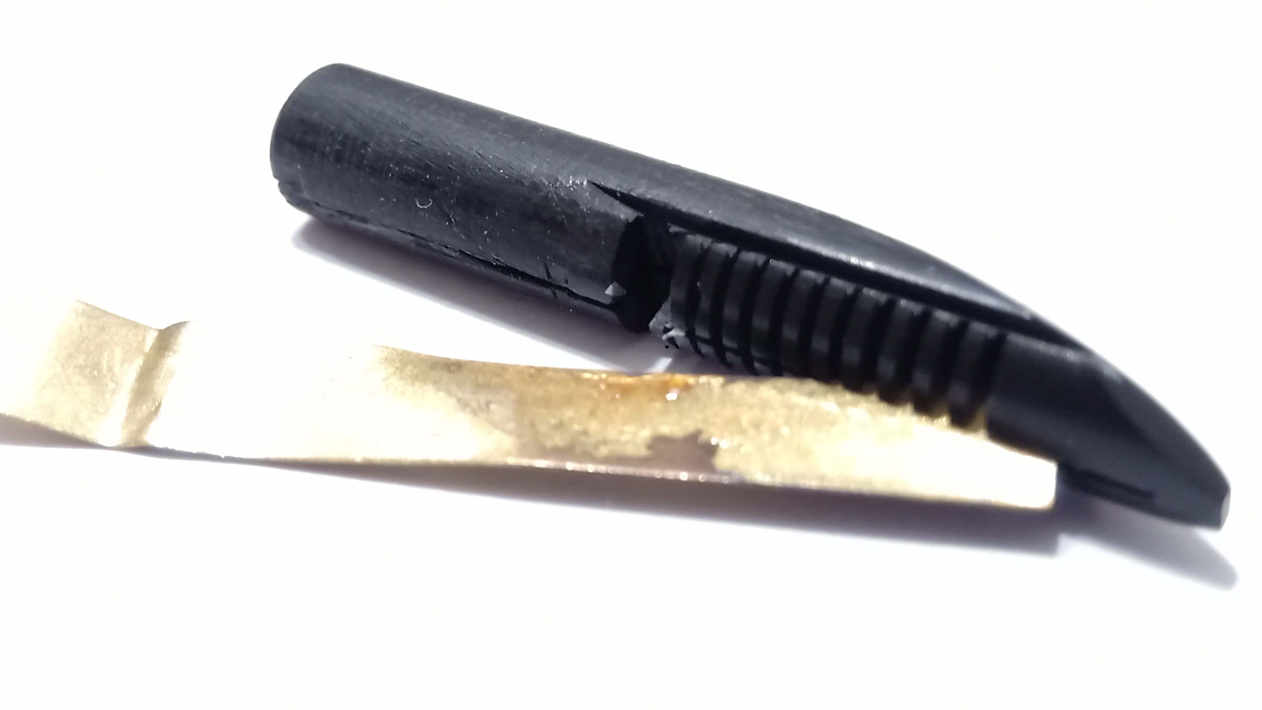 Per estrarre il pennino, che era ancora attaccato all'acrilico della parete interna dell'impugnatura, ho dovuto fissarne la punta con due pezzi di PVC, notando che era completamente corroso, come se fosse stato attaccato da un acido (o un alcali, superchrome?)...