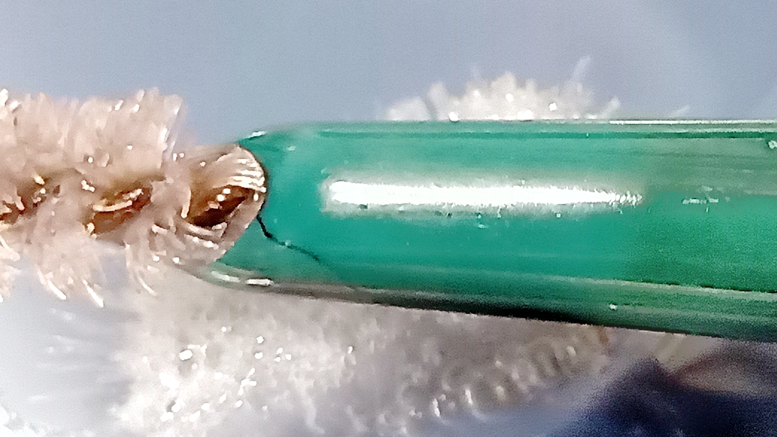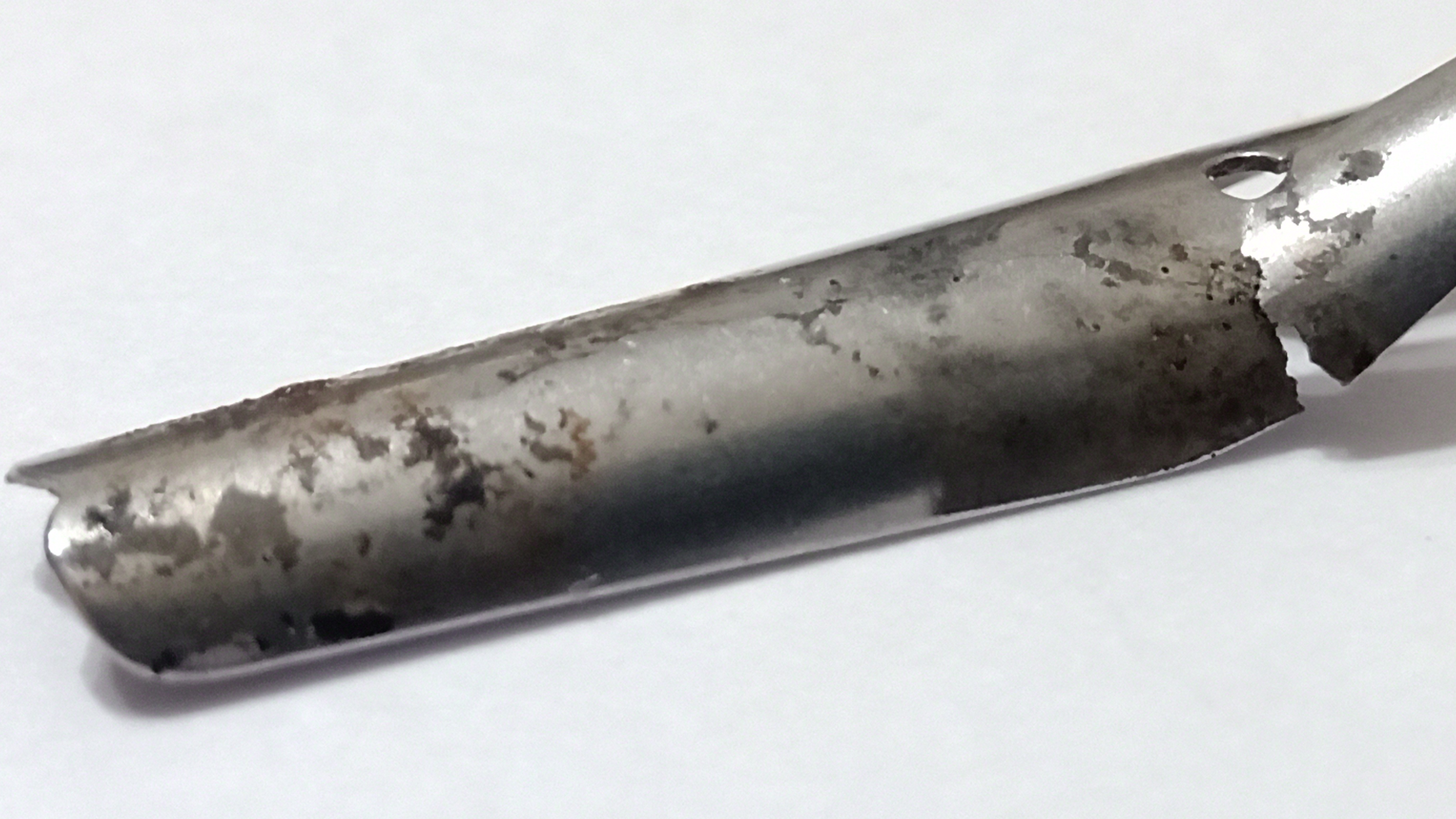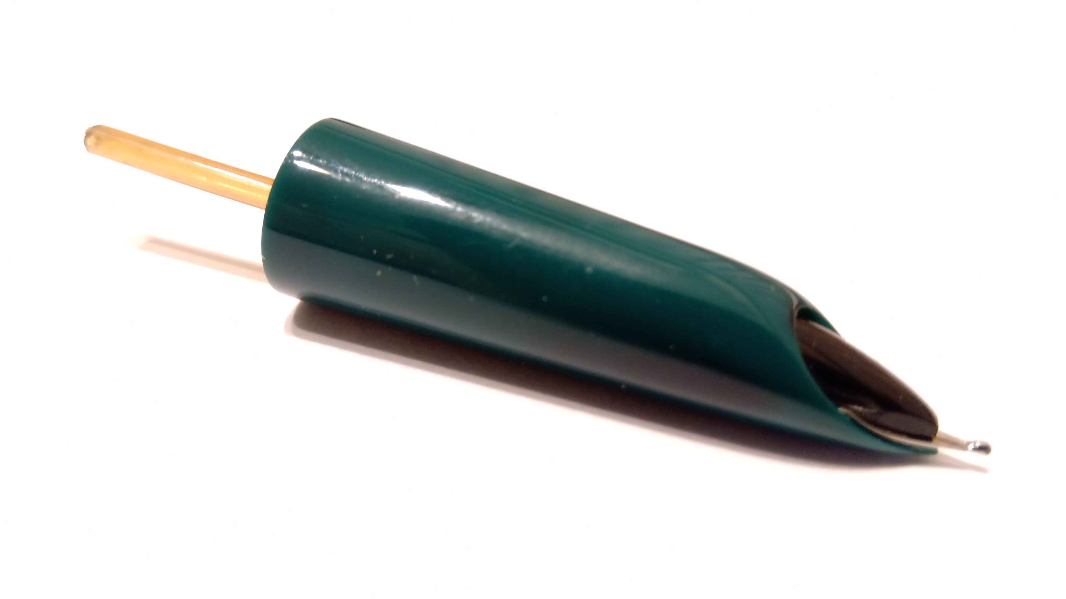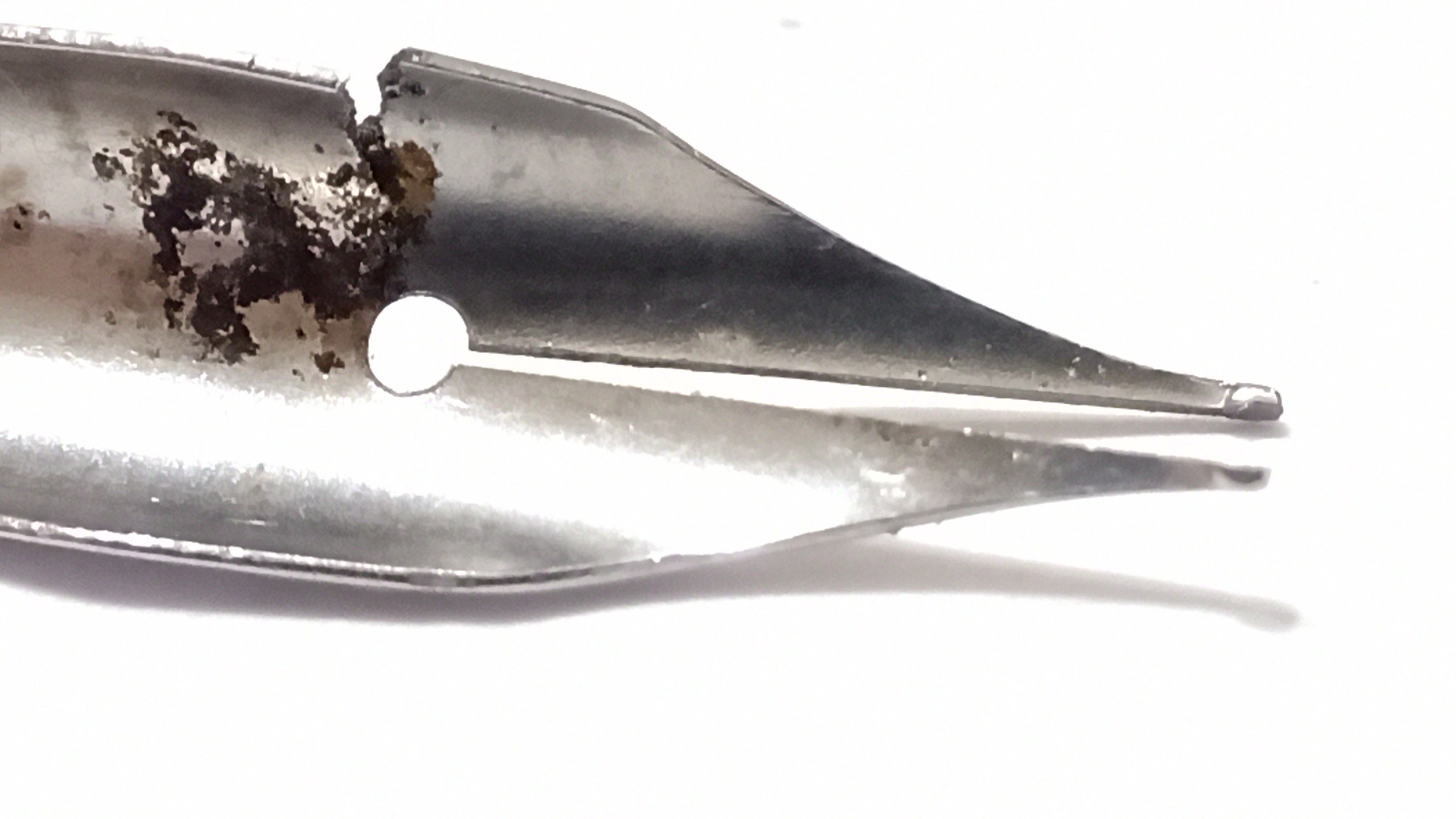 Per estrarre il pennino, che era ancora attaccato all'acrilico della parete interna dell'impugnatura, ho dovuto fissarne la punta con due pezzi di PVC, notando che era completamente corroso, come se fosse stato attaccato da un acido (o un alcali, superchrome?)...