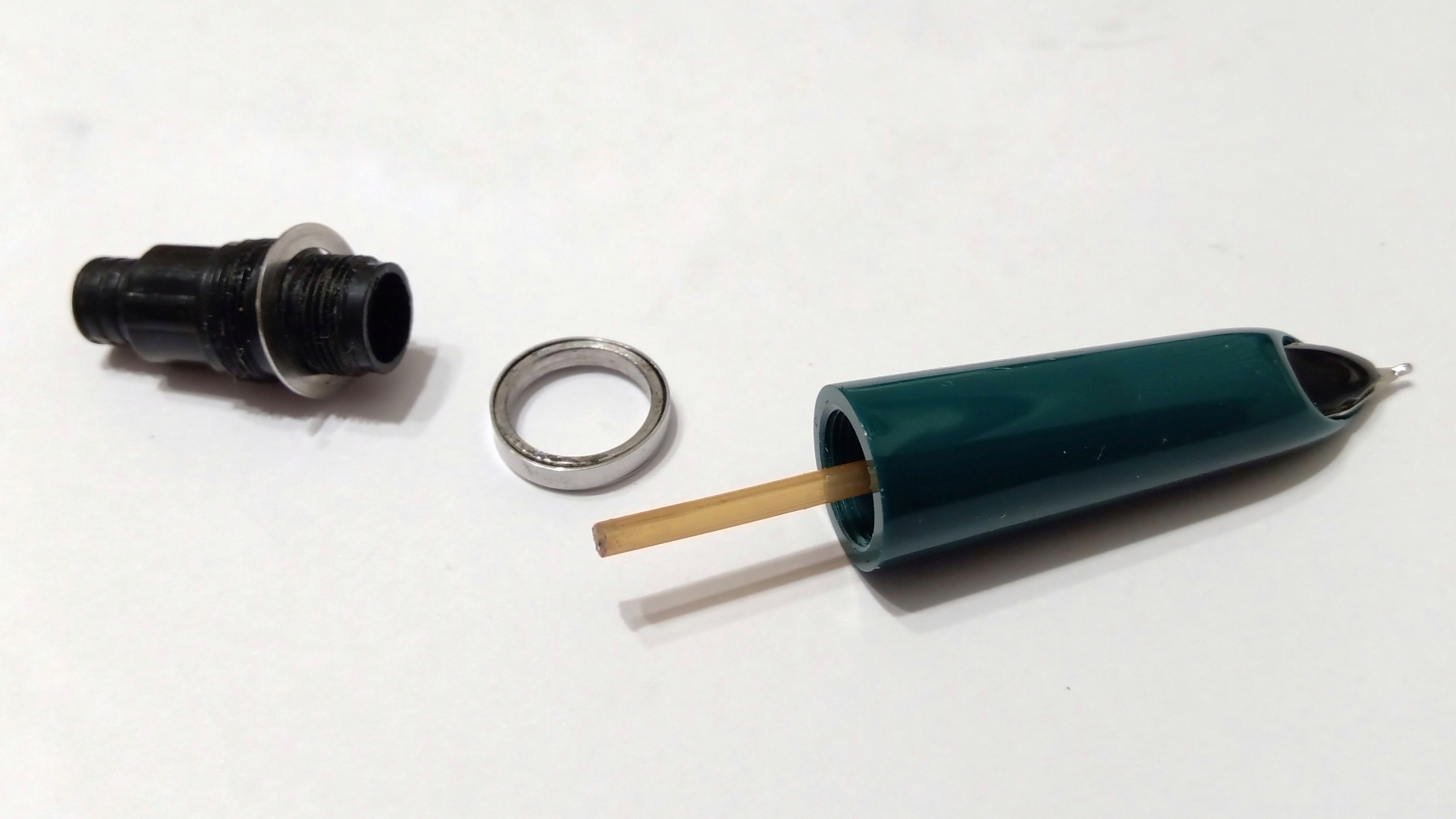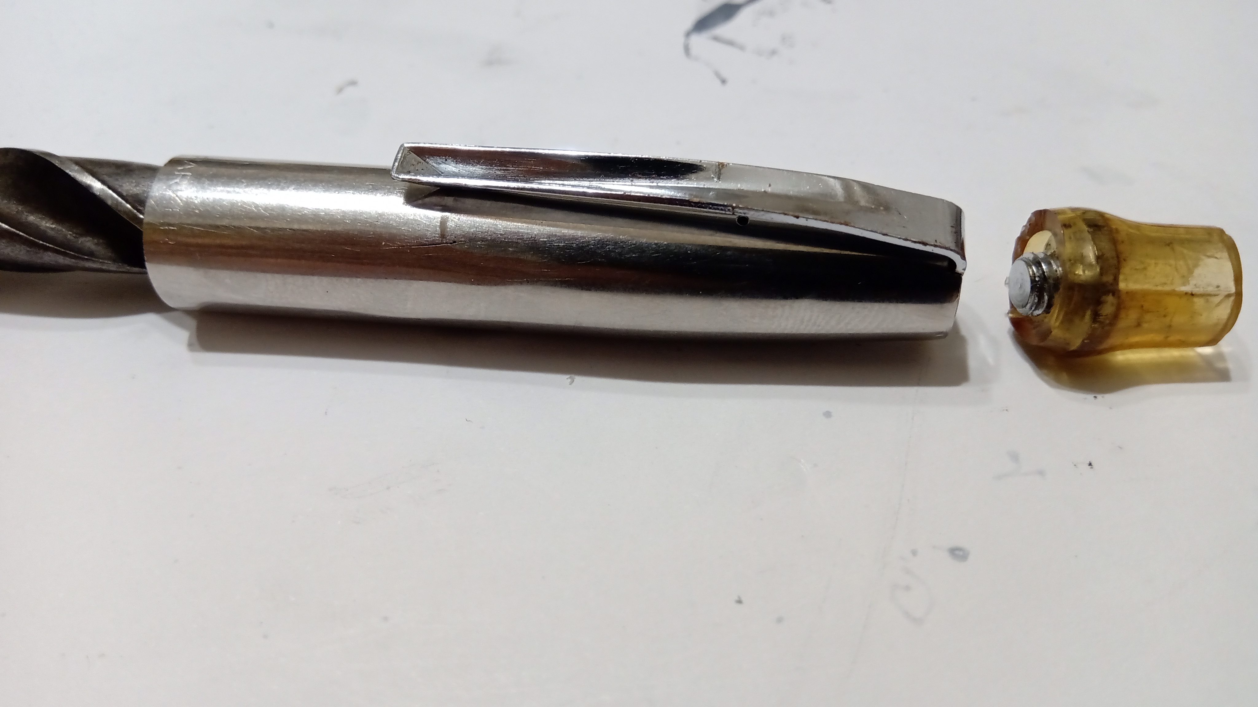 Para extraer el plumín, que aún se encontraba pegado al acrílico de la pared interna del grip, tuve que asegurar su punta con dos pedazos de pvc, observando que se encontraba completamente corroído, como atacado por un ácido (o un álcali, superchrome?)...
