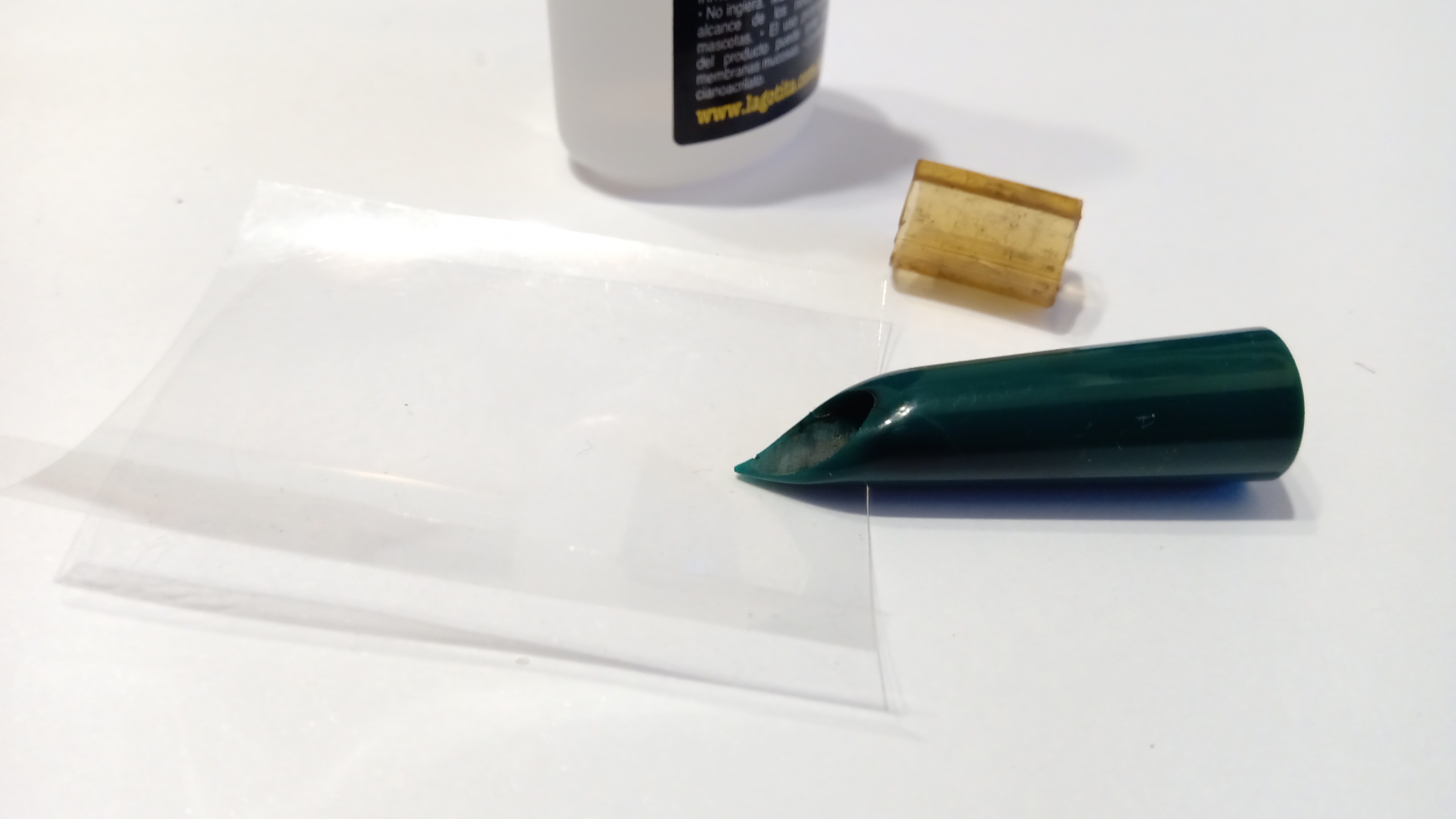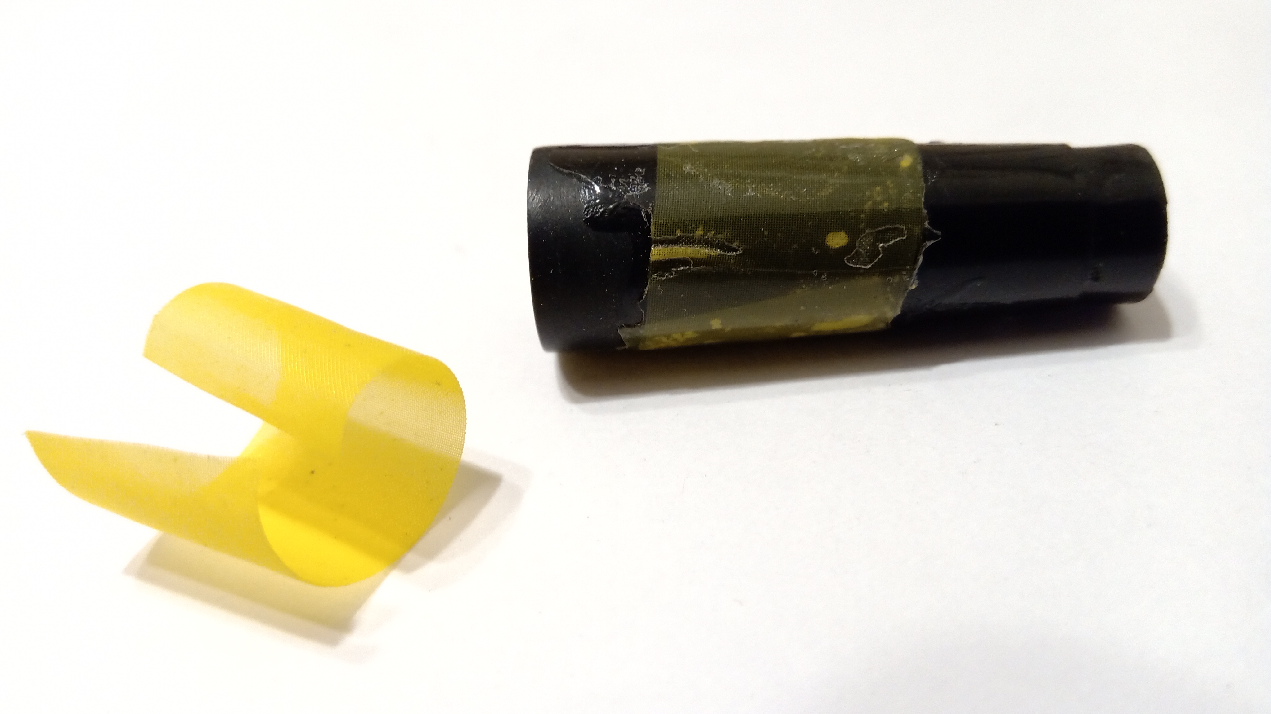 Dopo alcune ore ho rimosso il rotolino interno di mylar e il tubicino di PVC, ho levigato con carta abrasiva grana 500 l'interno e l'esterno dell'inner-cap, ho avvolto il pezzo con una sottile rete di poliestere e ho fatto cadere diverse gocce di cianoacrilato per poi avvolgerlo con un foglio di mylar che avrei rimosso alcune ore dopo...