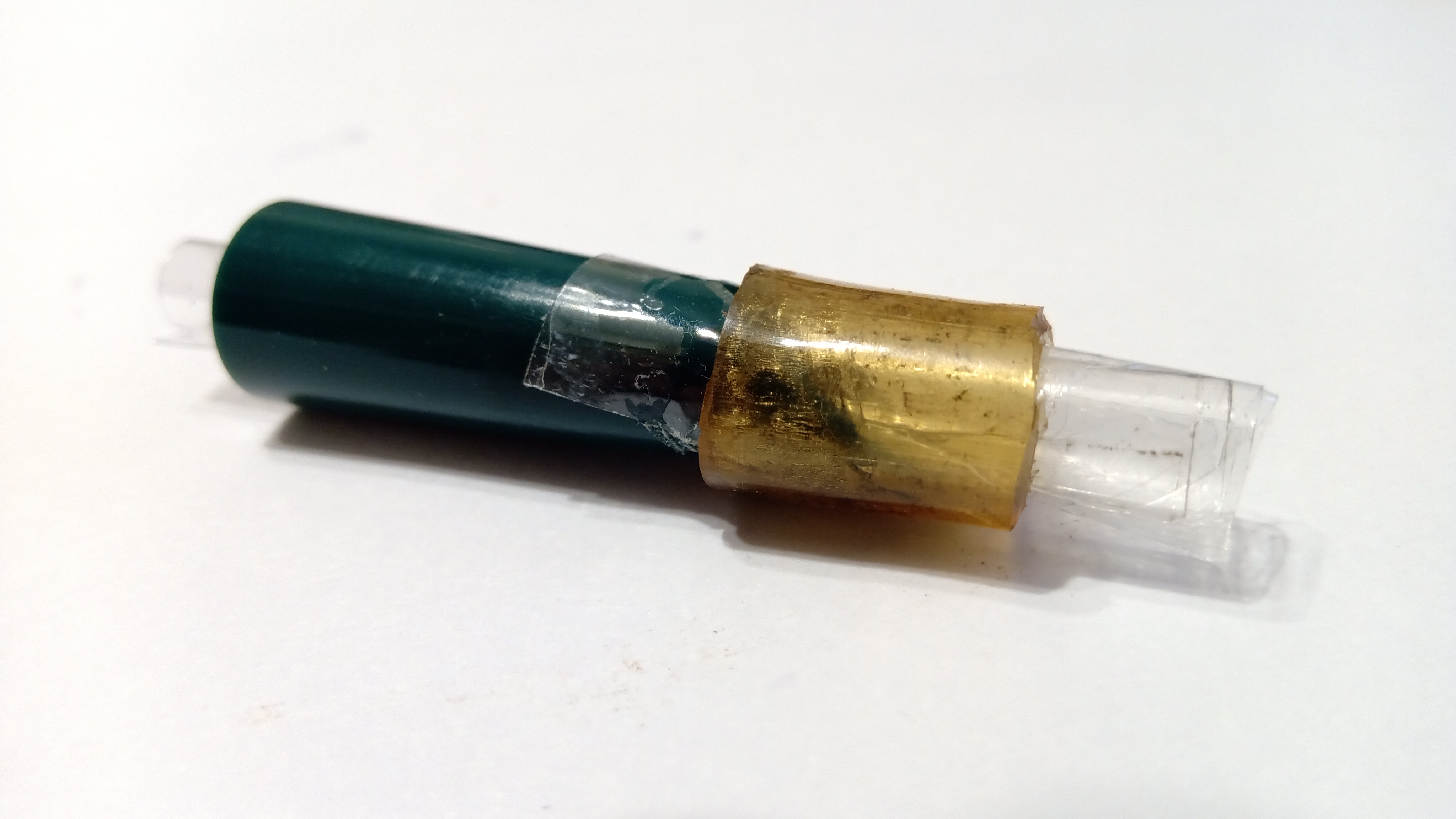 Al cabo de unas horas retiré el rollito interno de mylar y el cañito de PVC, emparejé con lija grano 500 el interior y exterior del inner-cap, abracé con una fina malla de poliester la pieza, y dejé caer varias gotas de cianoacrilato para luego envolver con una lámina de mylar que retiraría horas más tarde...
