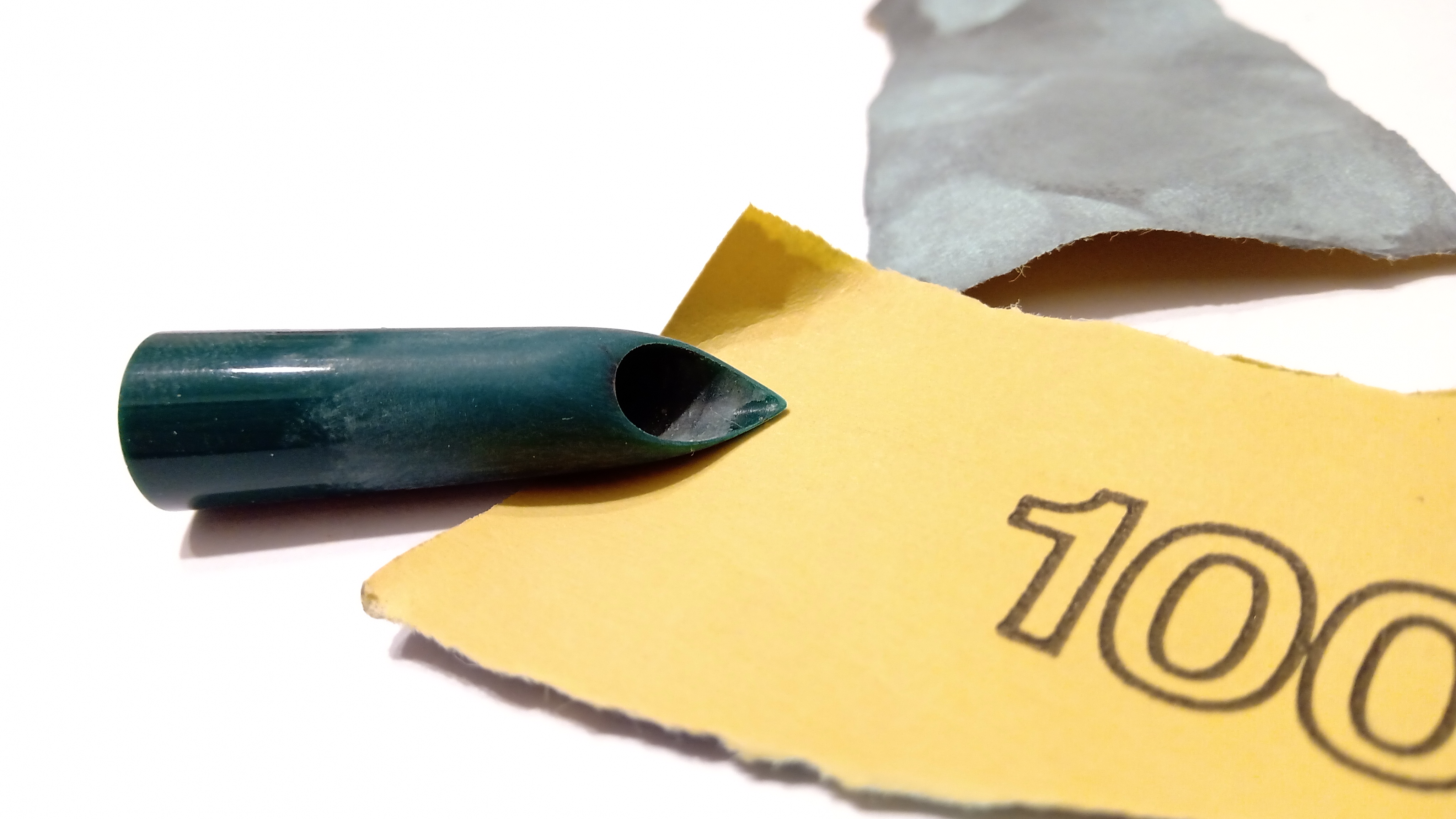 Ho approfittato anche per passare la stessa carta abrasiva grana 2000 sul fusto e levigare l'estremità dello stesso con grana 500, eliminando quel bordo pericoloso e fragile per lasciarlo come uno smusso quadrato invece che arrotondato...
