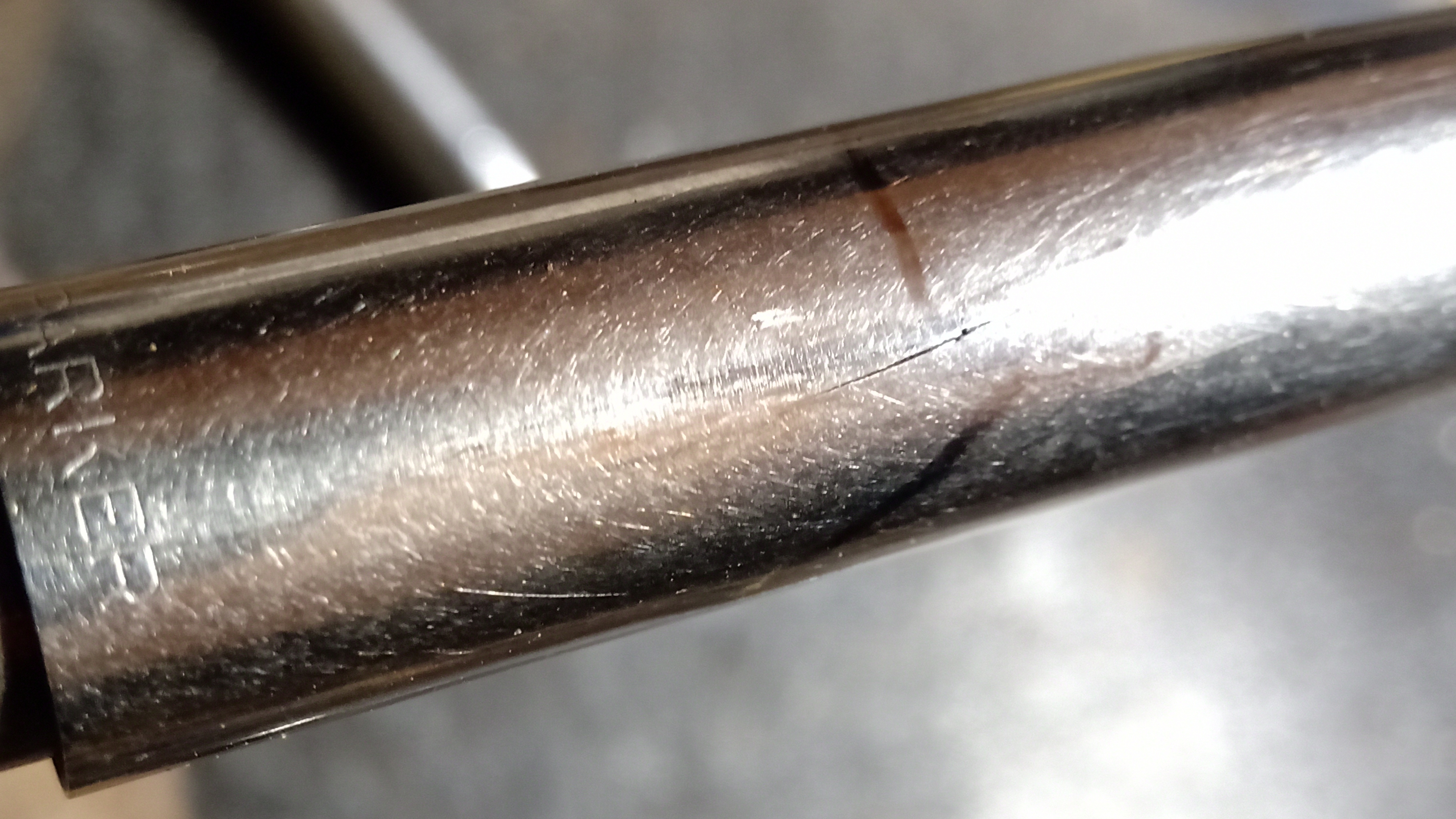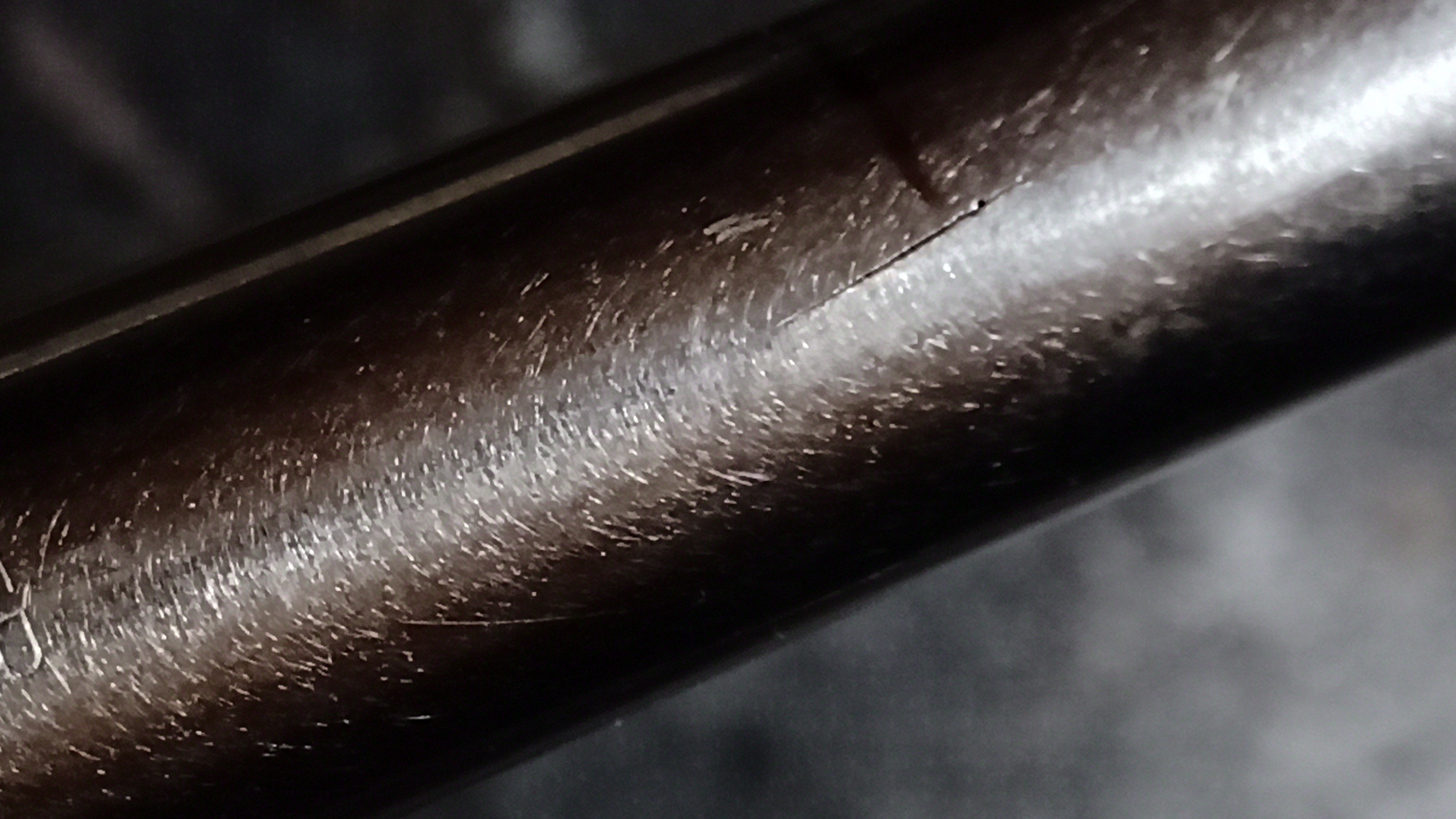 Come si poteva osservare, si era già verificata un'interessante fessura nell'ancoraggio dell'insieme nell'impugnatura, causata da due fattori... Il materiale utilizzato sia nell'impugnatura che nel fusto era un acrilico ben lontano dall'essere Lucite. Questo, sommato al costante effetto di espansione dell'insieme di alimentazione fissato con forza nell'impugnatura, oltre al passare degli anni, ha inevitabilmente provocato la rottura e la fessurazione del materiale.
