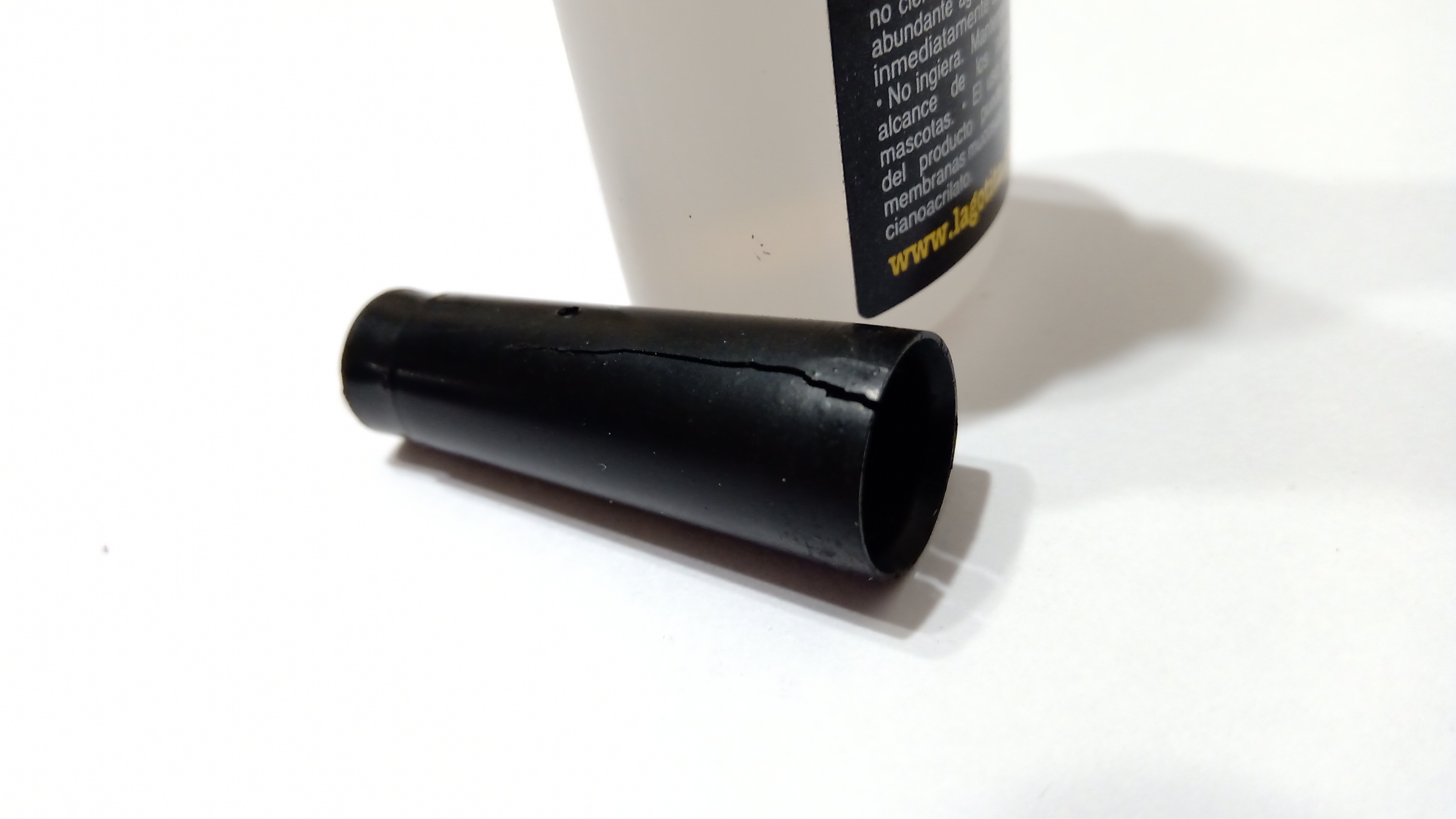 Con el mylar ya expandido dentro, dejé caer una gota de cianoacrilato líquido en la grieta, e inmediatamente enrollé el grip externamente con mylar, para rápidamente asegurar el conjunto y cerrar la grieta con un tubito de PVC calzado en la punta del grip y siempre con la fisura mirando hacia abajo...