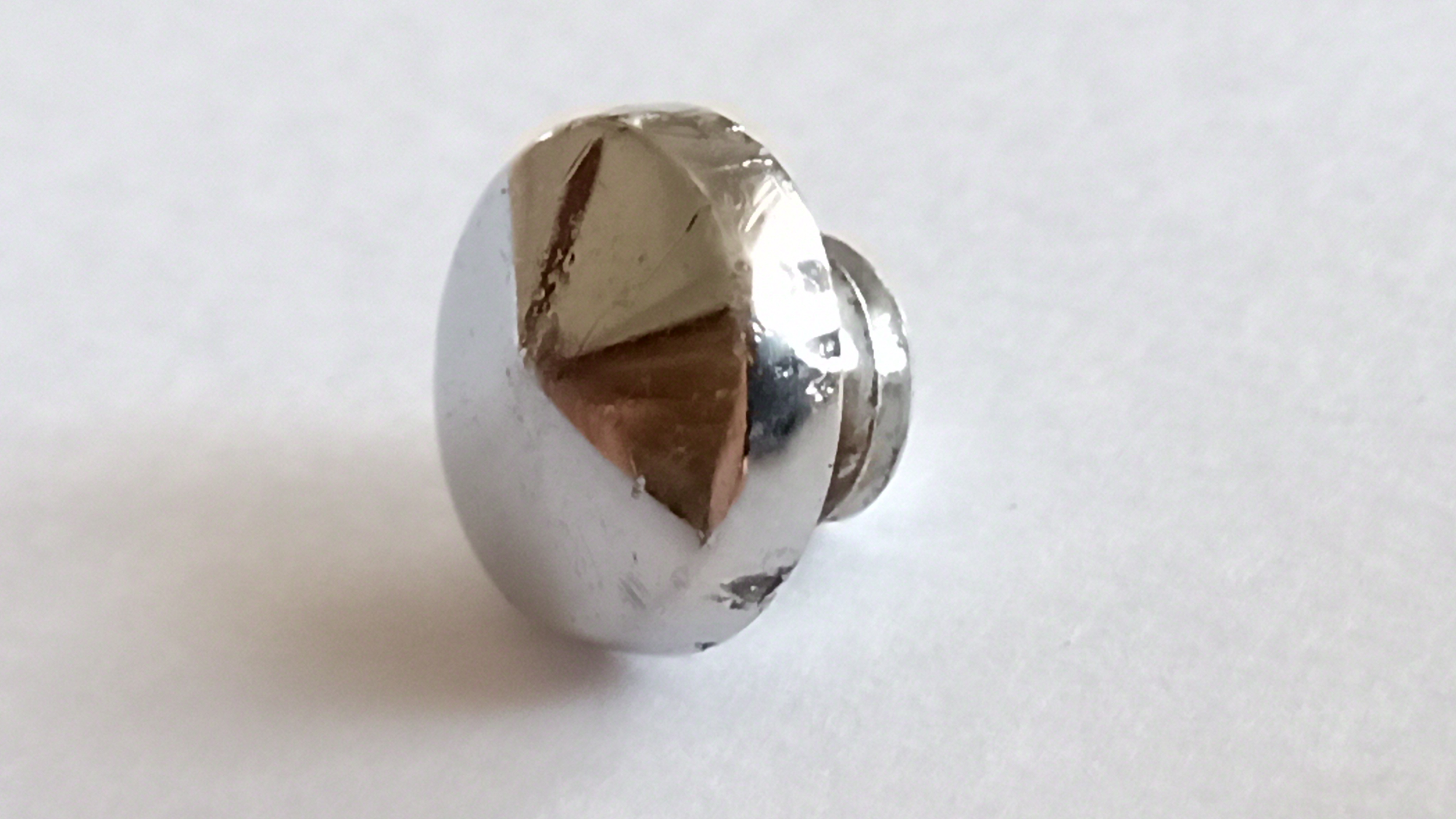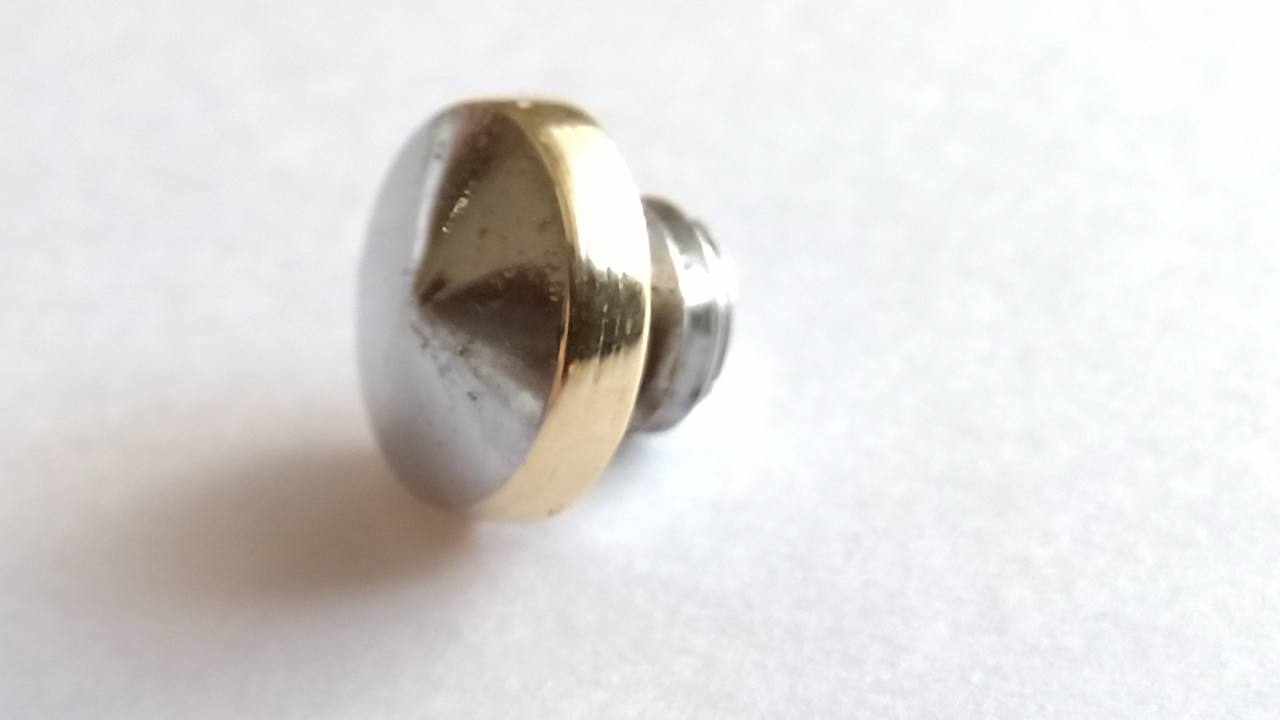 Arriviamo così al cappuccio, normalmente realizzato in Lustraloy, un acciaio inossidabile austenitico senza proprietà magnetiche, in alcune versioni spazzolato e in versioni successive sabbiato, con un gioiello o un bottone in ottone cromato come la clip. Il gioiello è avvitato nell'inner-cap fissando la clip, e sicuramente si è scheggiato e la clip si è deformata nel tentativo di svitarlo...