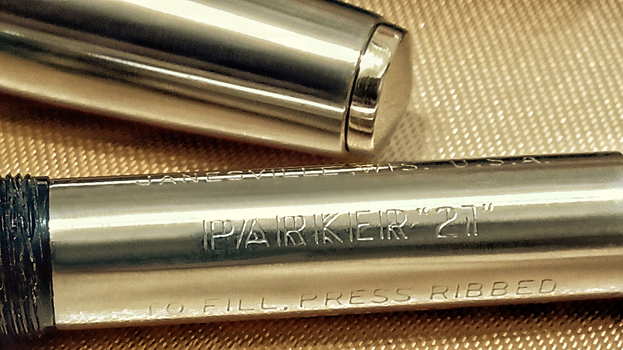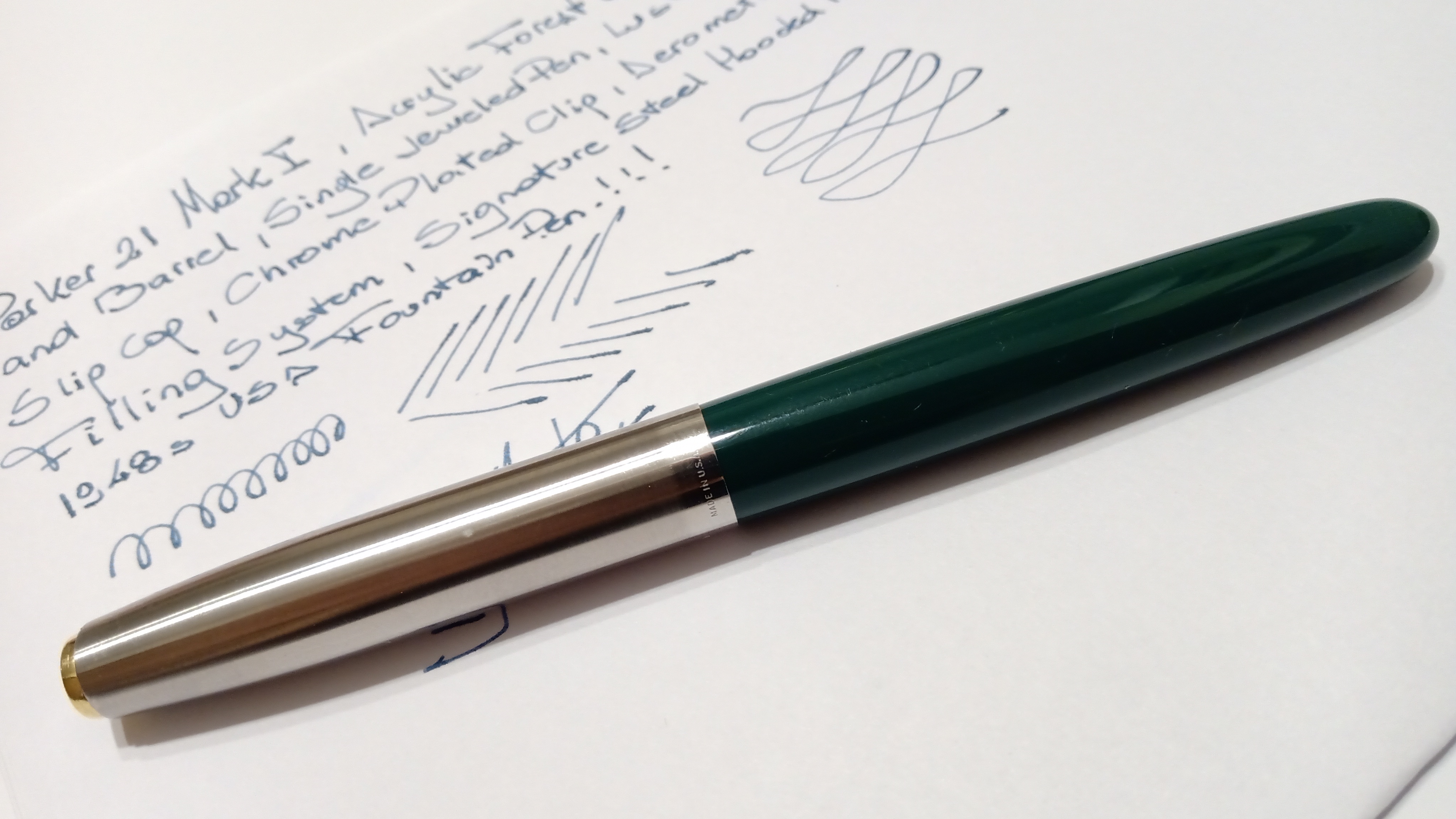 Esta pluma fue creada por Parker en 1948 ( https://parkerpens.net/parker21.html ) como una alternativa económica a su modelo 51, utilizando acrilico, acero inoxidable y latón cromado en su construcción.