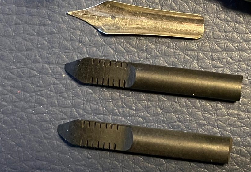 Per quanto riguarda l'aumento di flusso a penna quasi scarica, preciso che mi sto riferendo a stilografiche vecchie e nuove con alimentatore in ebanite e il canale/i capillari esposti (quindi senza un eventuale perforatore per cartuccia), tipo questo: