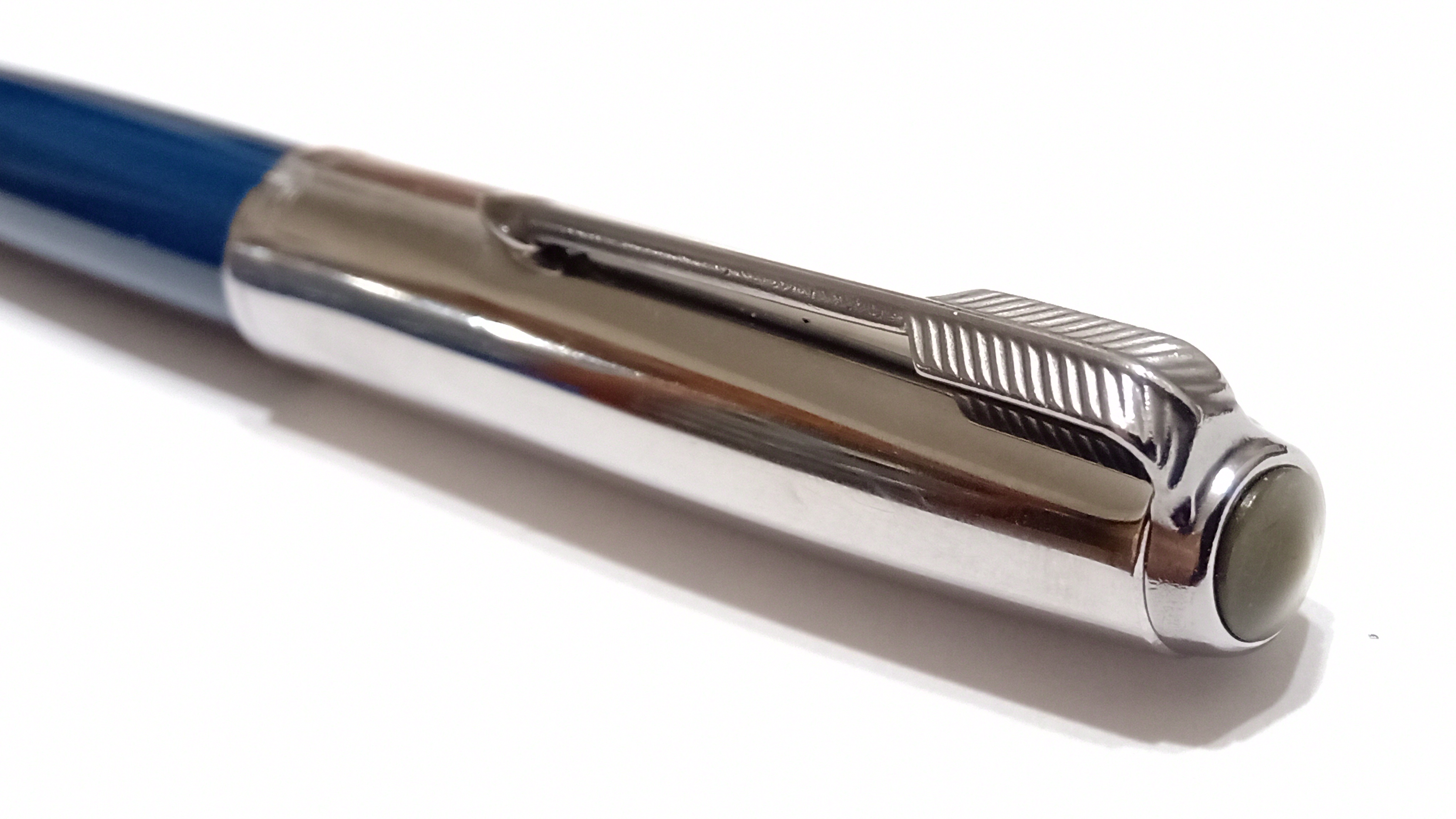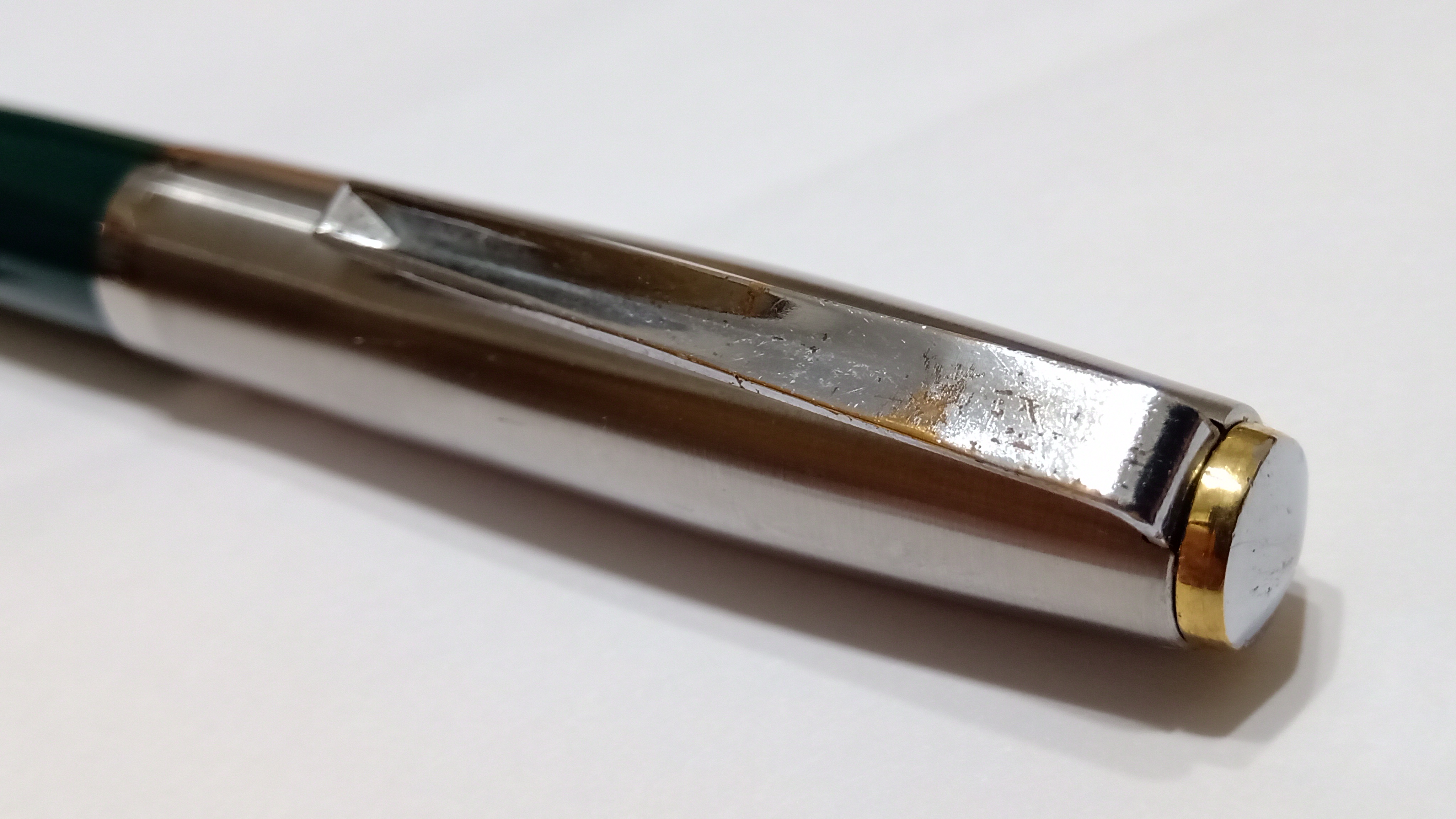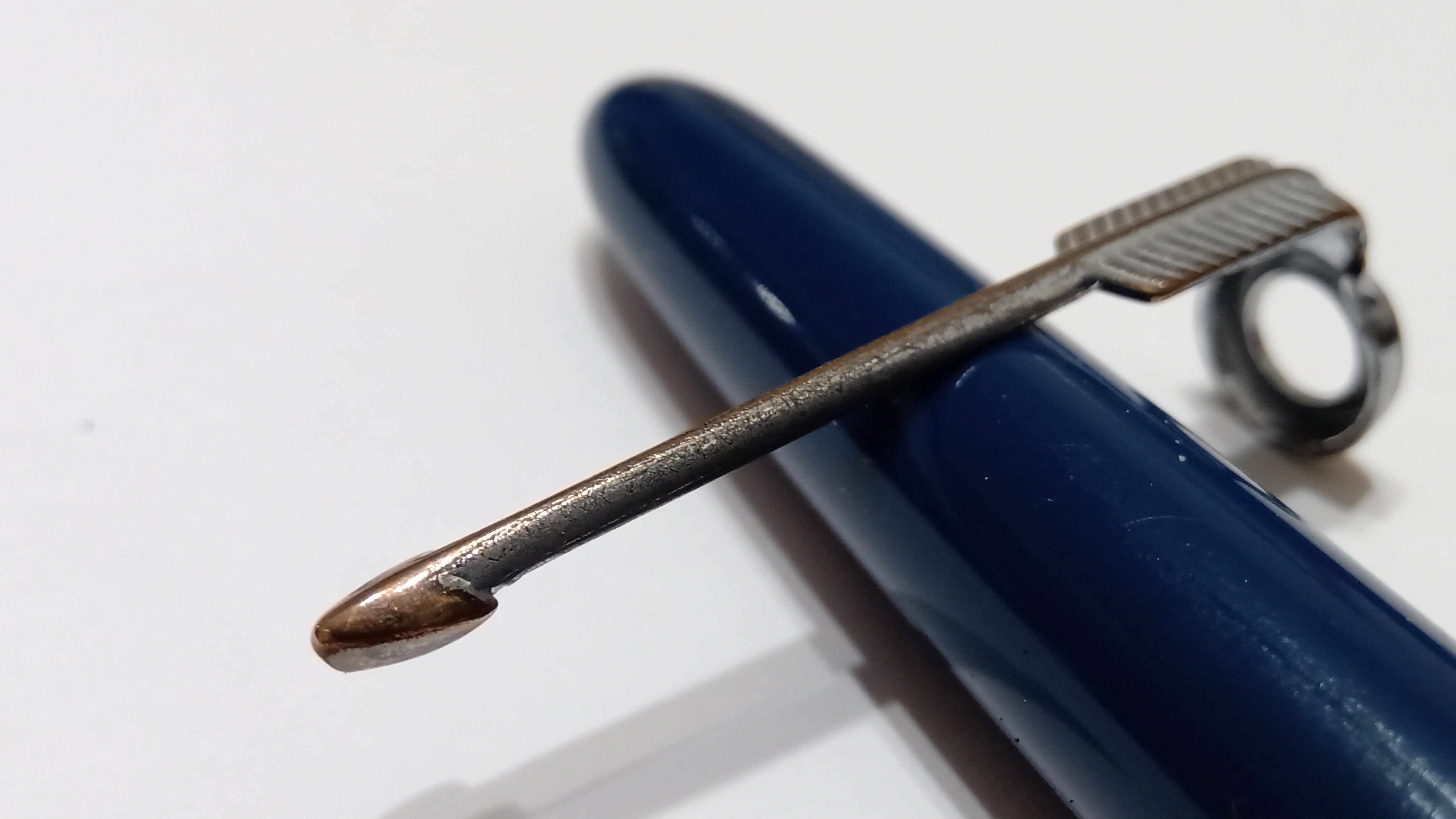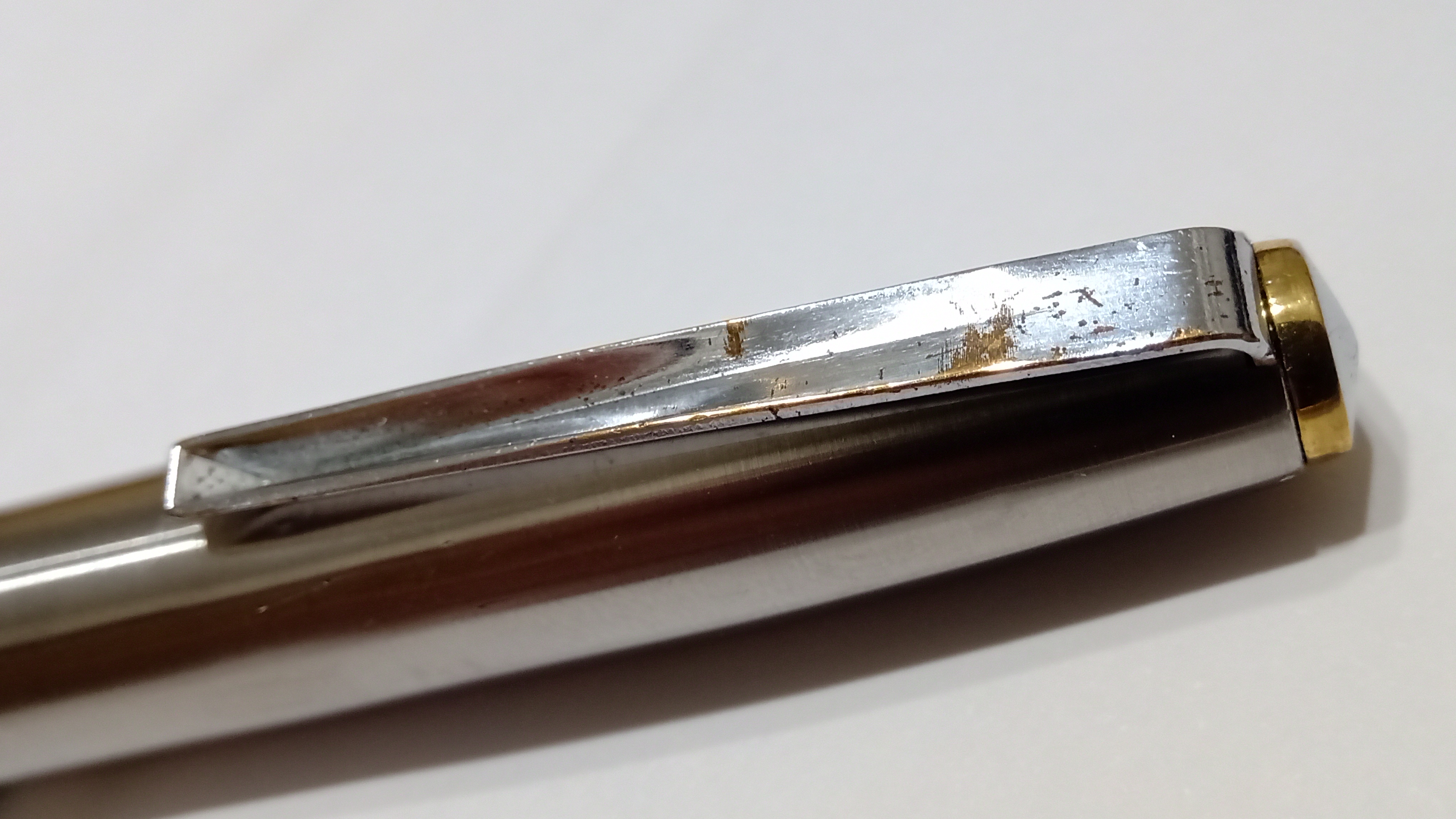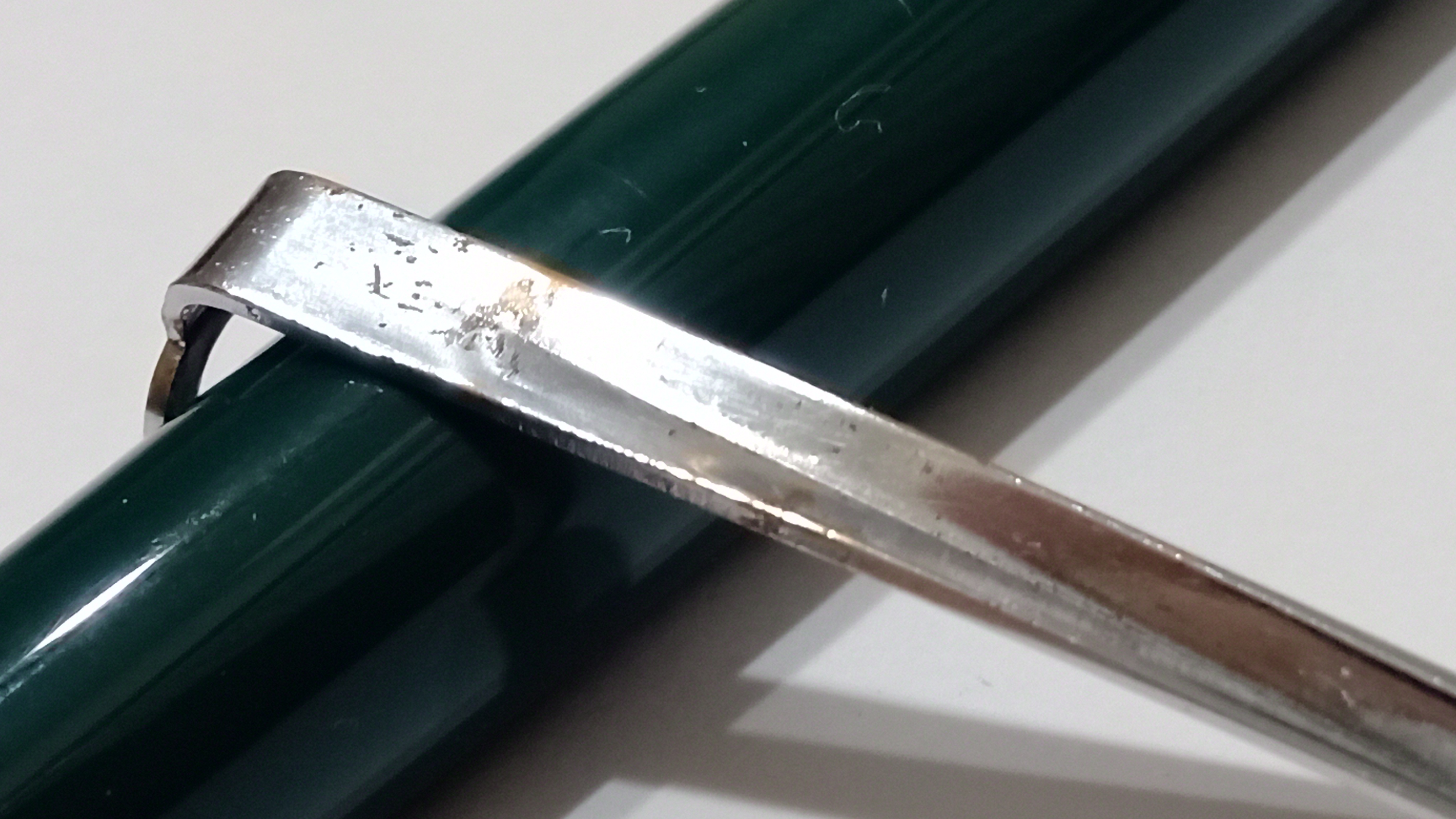 y también un clip de una Parker 51 aerométrica que por el mismo rozamiento había perdido su cromo llegando hasta el cobreado de base...