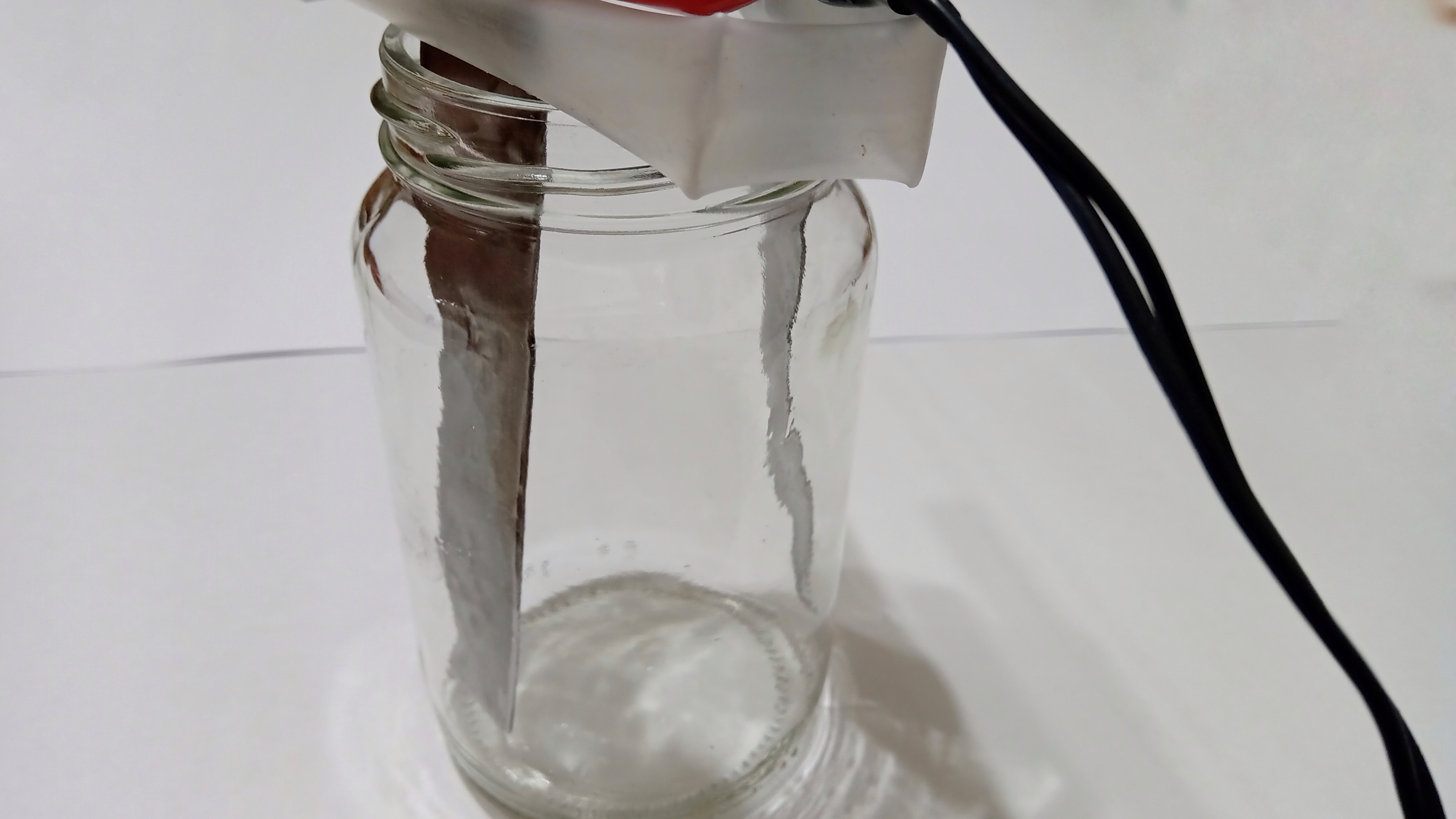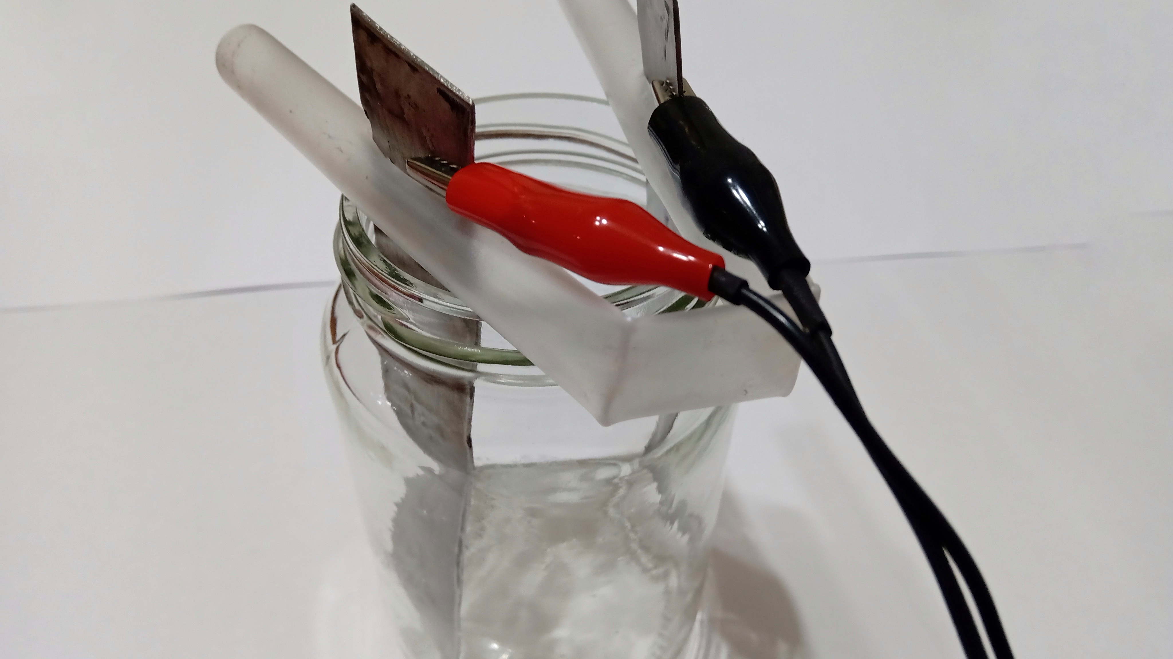 Uno degli elettrodi è stato collegato al polo positivo (+) della fonte, mentre l'altro al polo negativo (--).