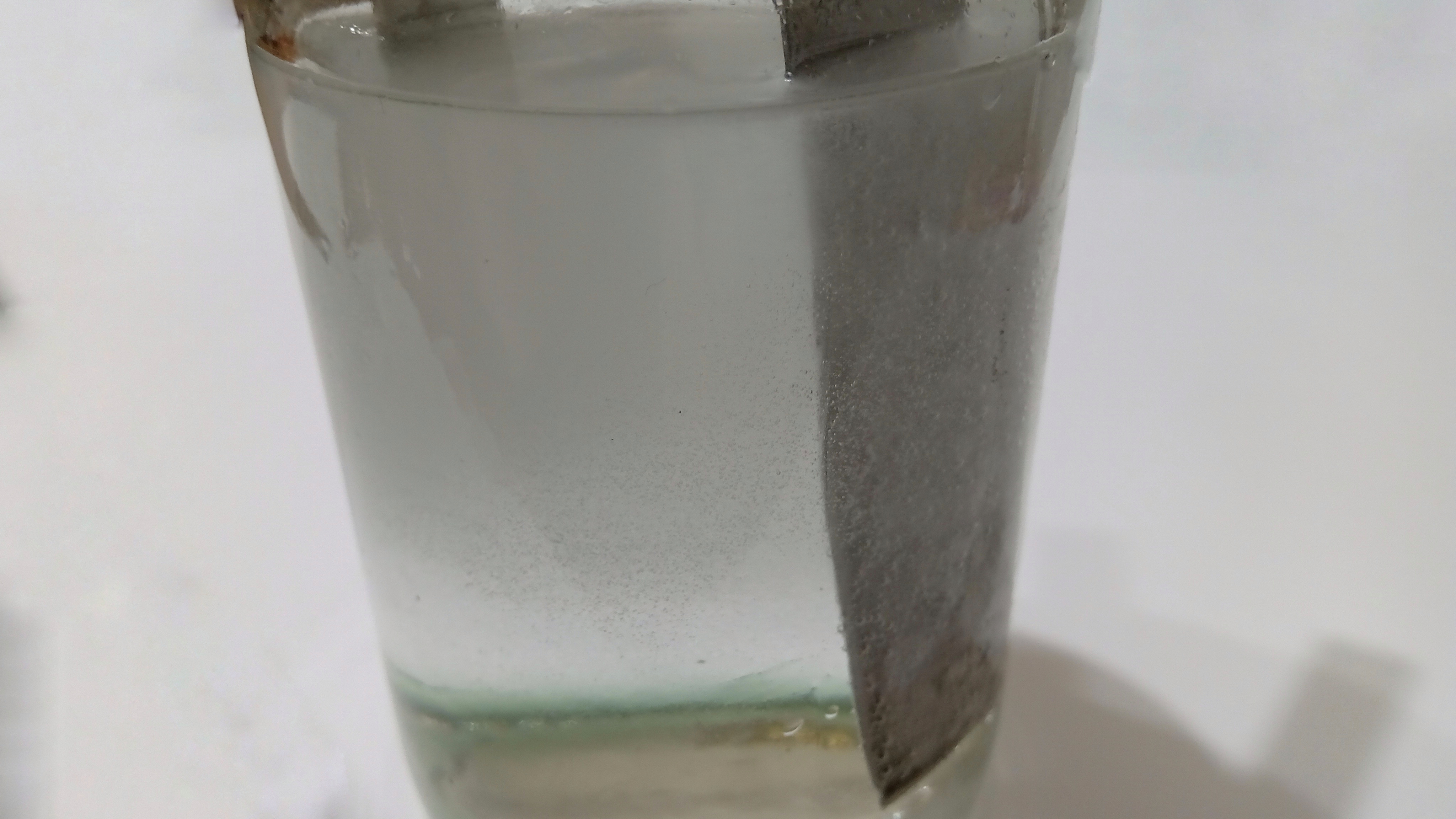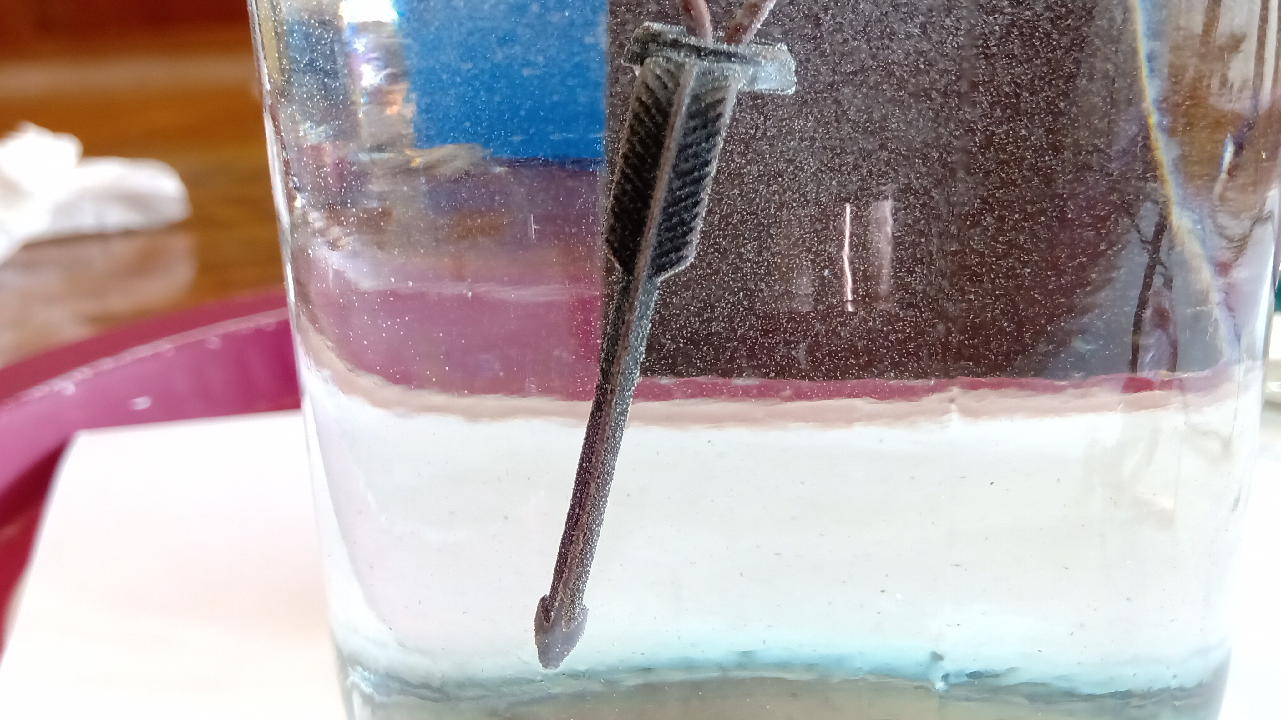 y al igual que en la generación del electrolito para el niquelado, coloqué ambas piezas de acero en un vidrio, el cual llené completamente con vinagre blanco en el cual disolví previamente dos cucharas soperas de cloruro de sodio...
