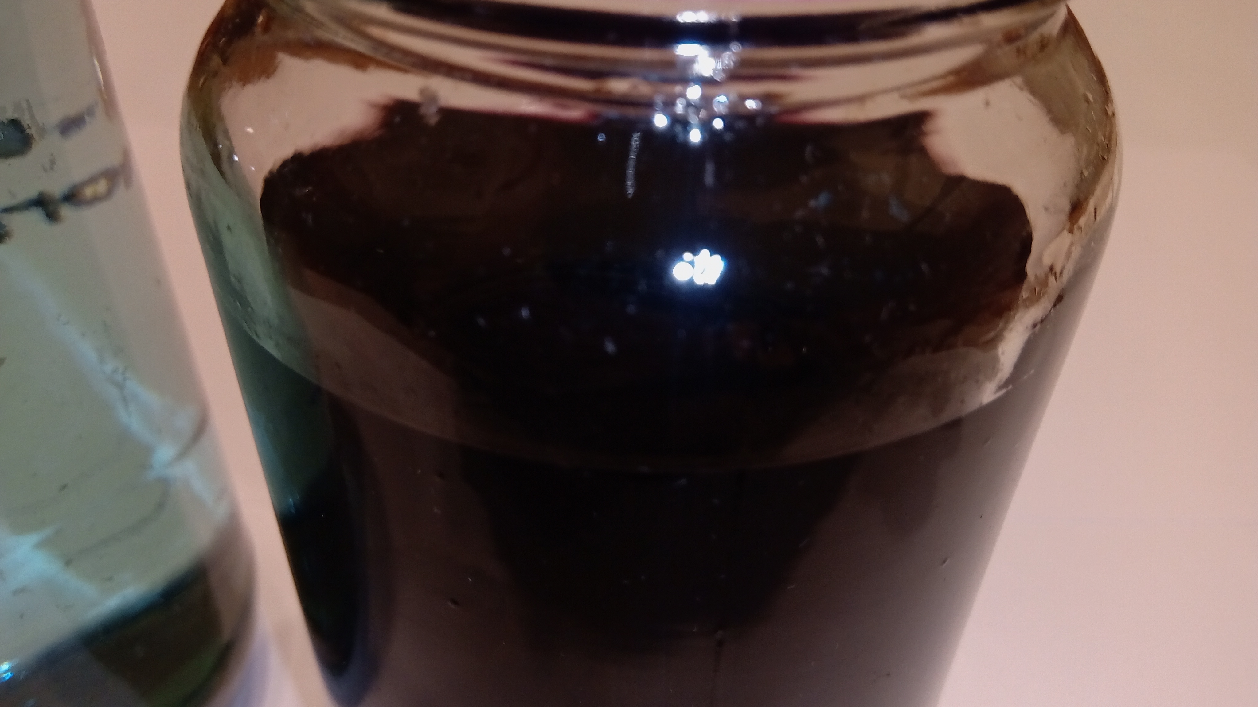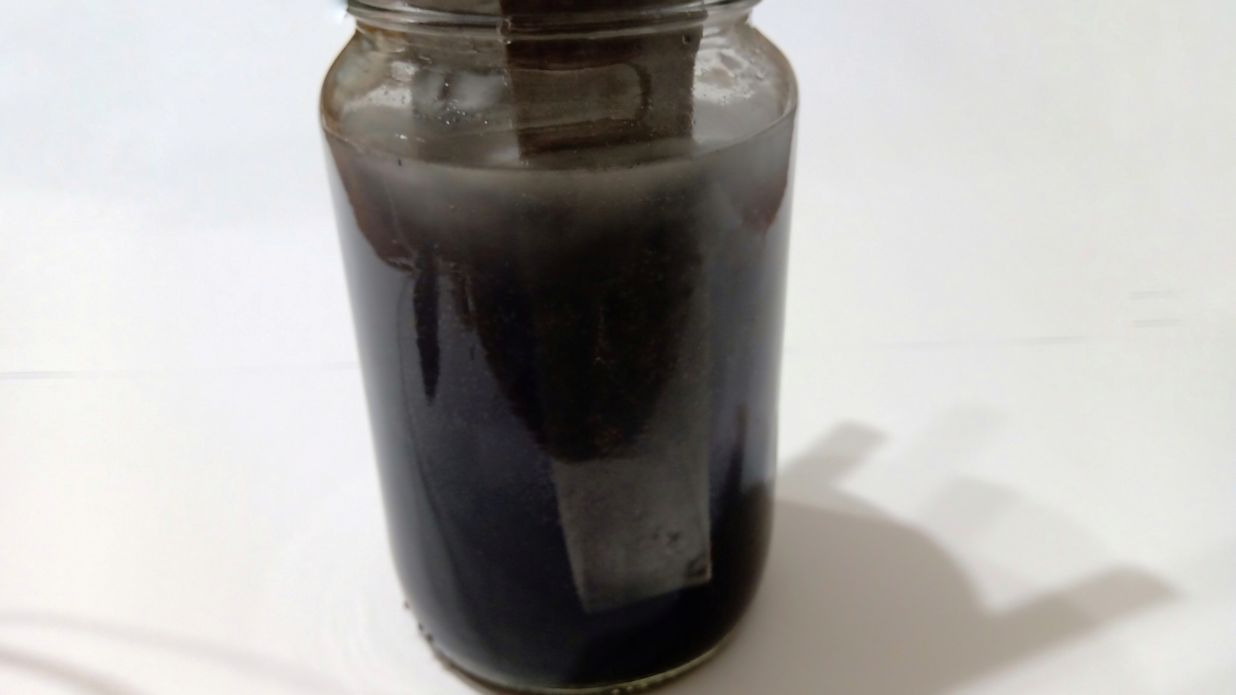 Así entonces dejé generando por aproximadamente 2.30 hs el electrolito para el cromado, viéndose que del electrodo positivo se iban desprendiendo los iones cromo, los cuales son los que generan un líquido oscuro con una coloración entre marrón y parduzca...