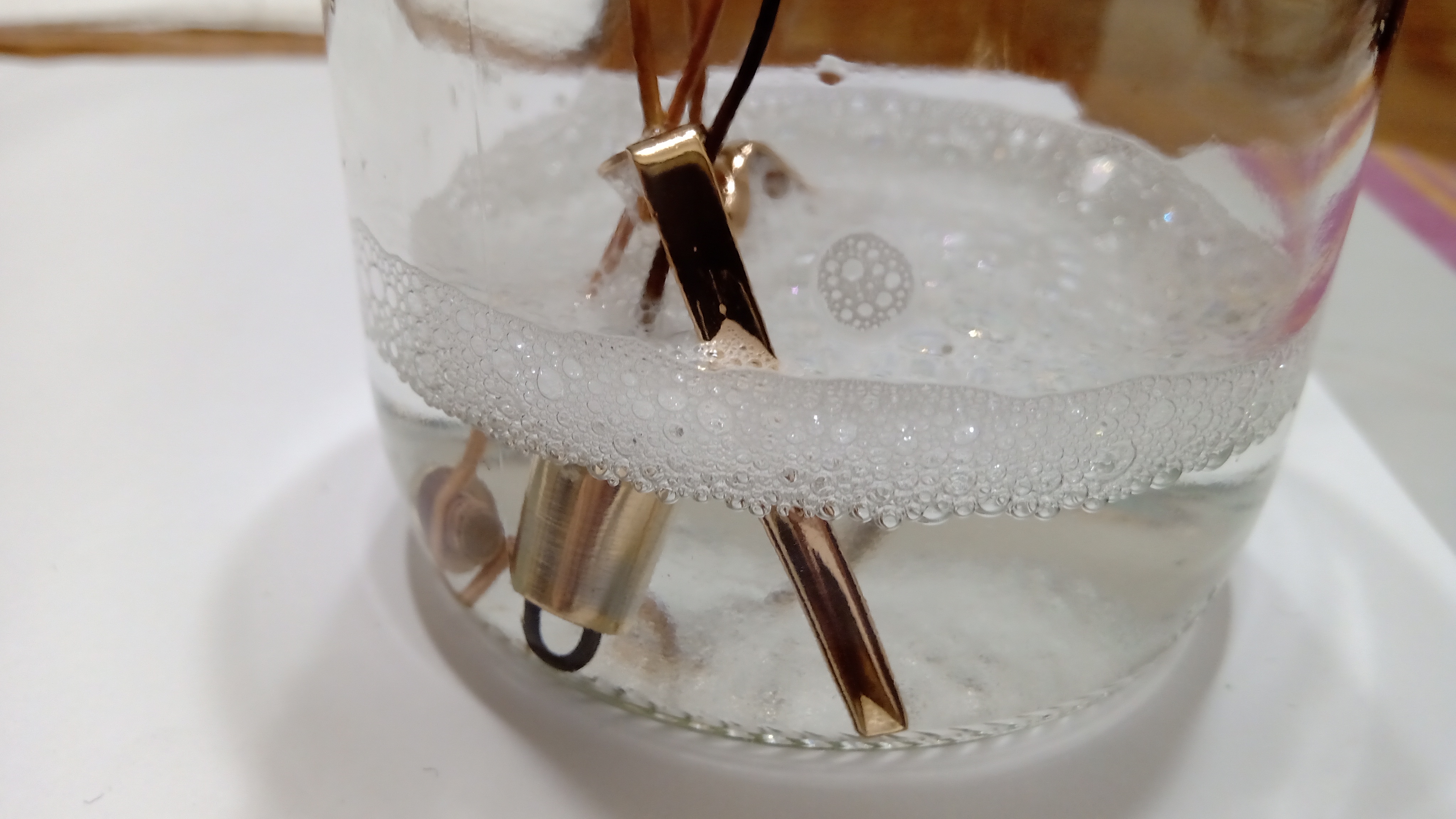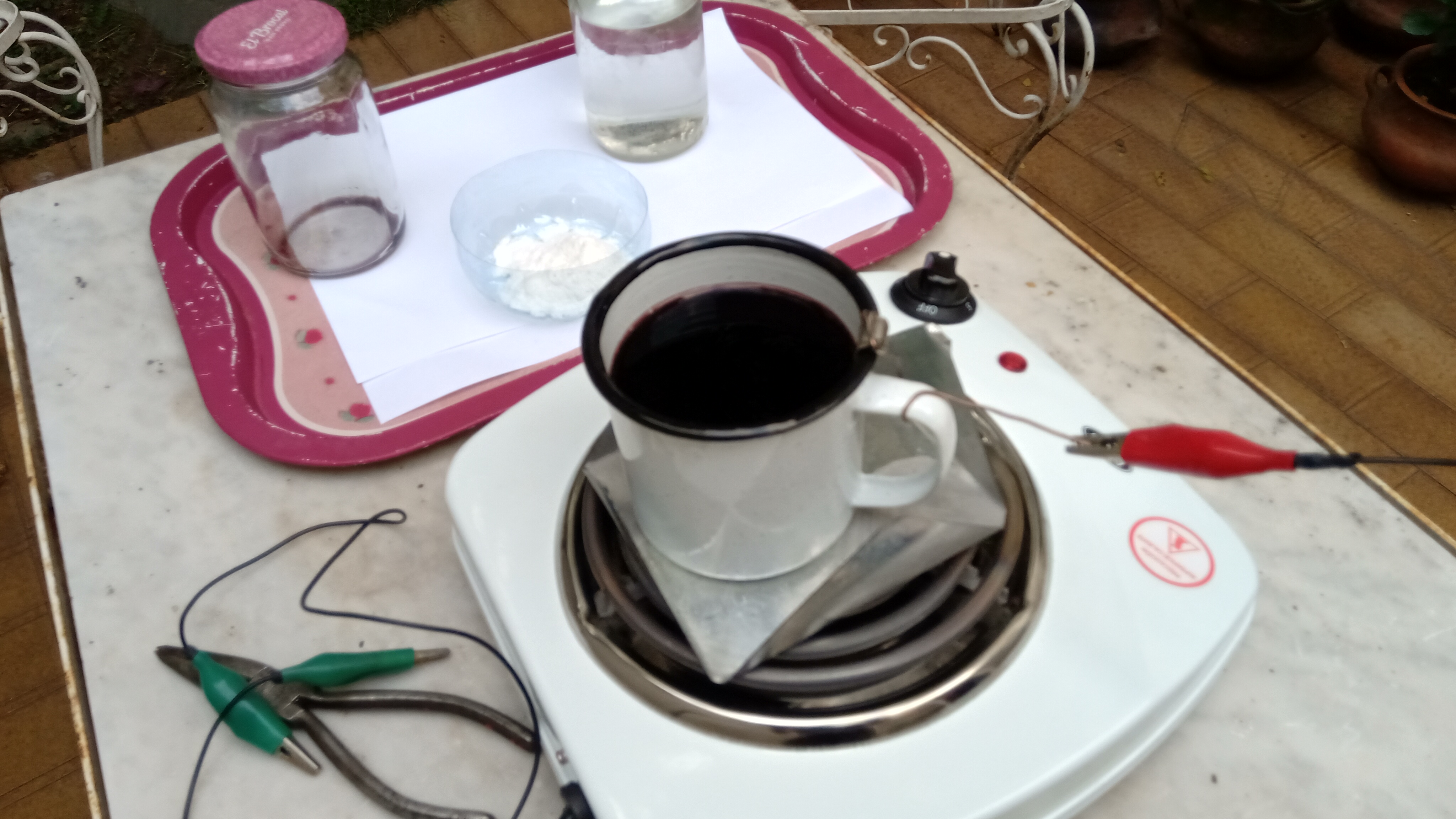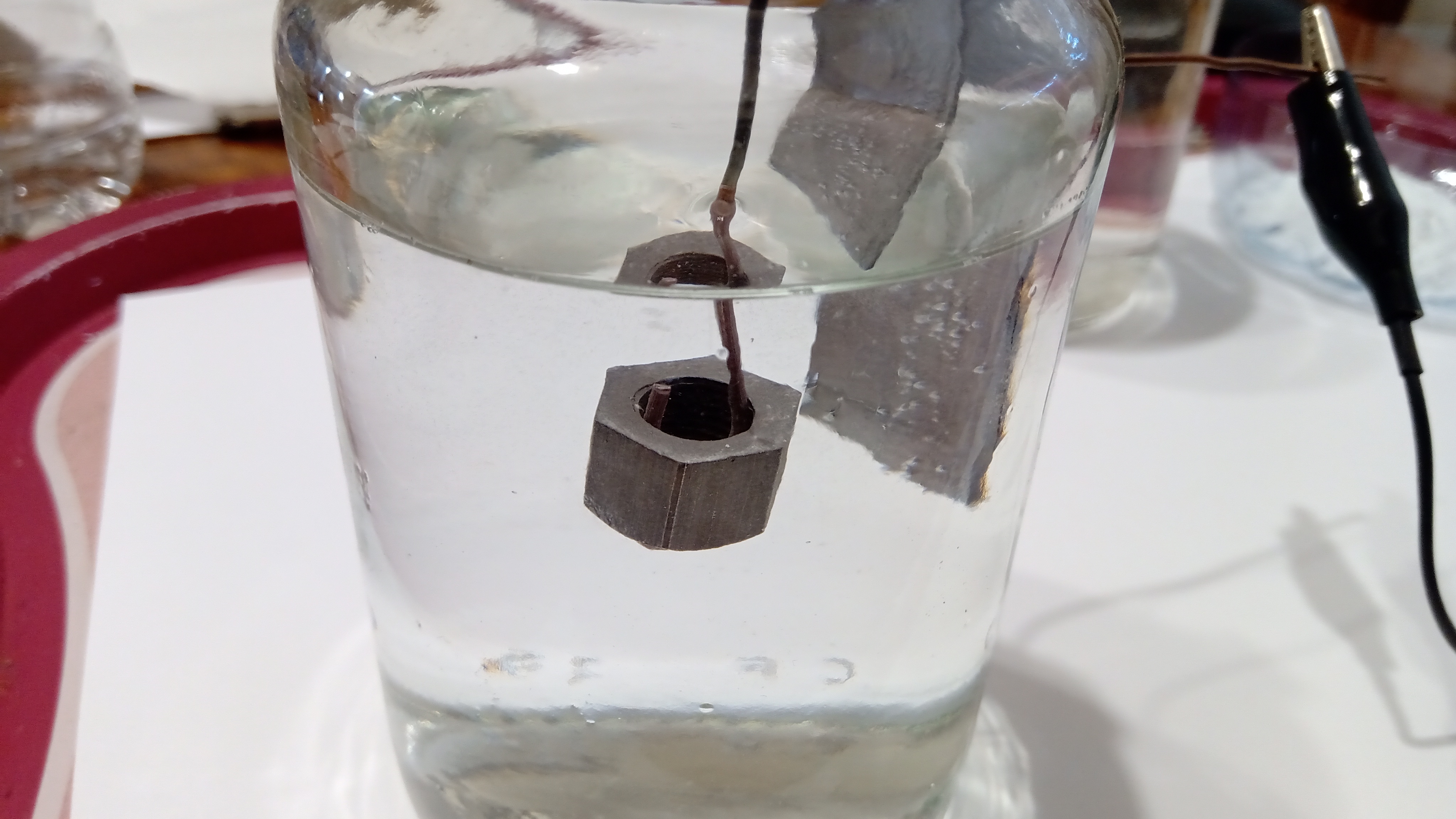 La solución de base fue la misma que en el caso del niquelado (1/2 litro de vinagre blanco + 2 cucharadas soperas de cloruro de sodio), donde el único cambio fue reemplazar los electrodos de níquel por electrodos de acero inoxidable para crear el electrolito.