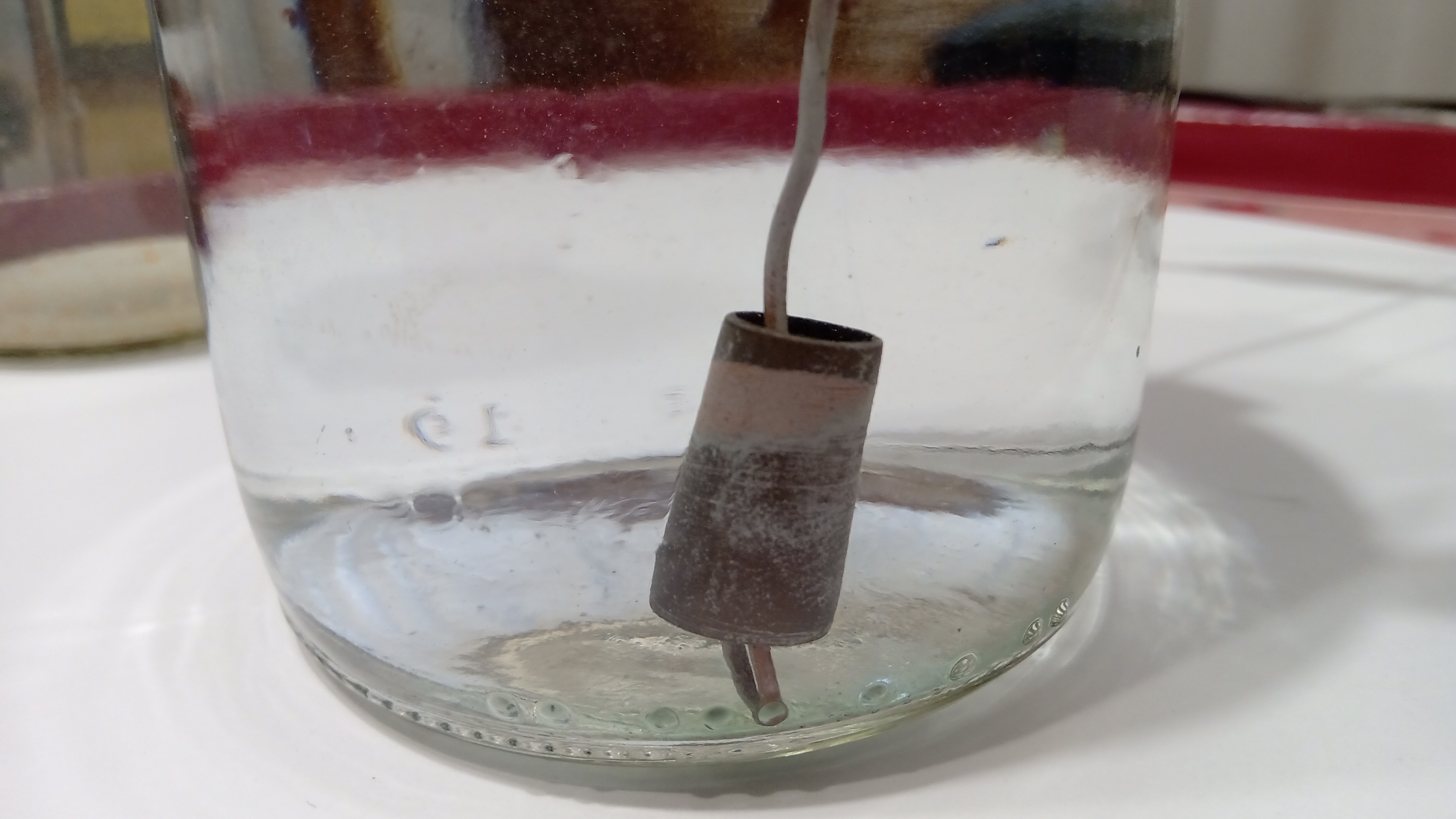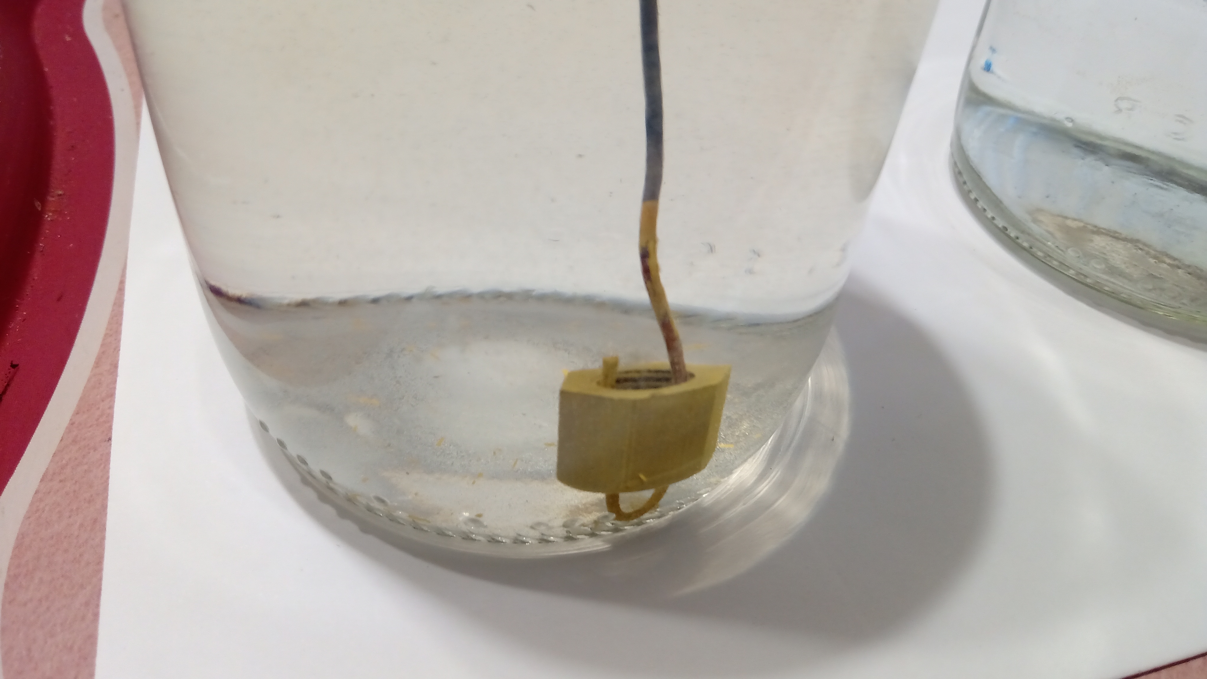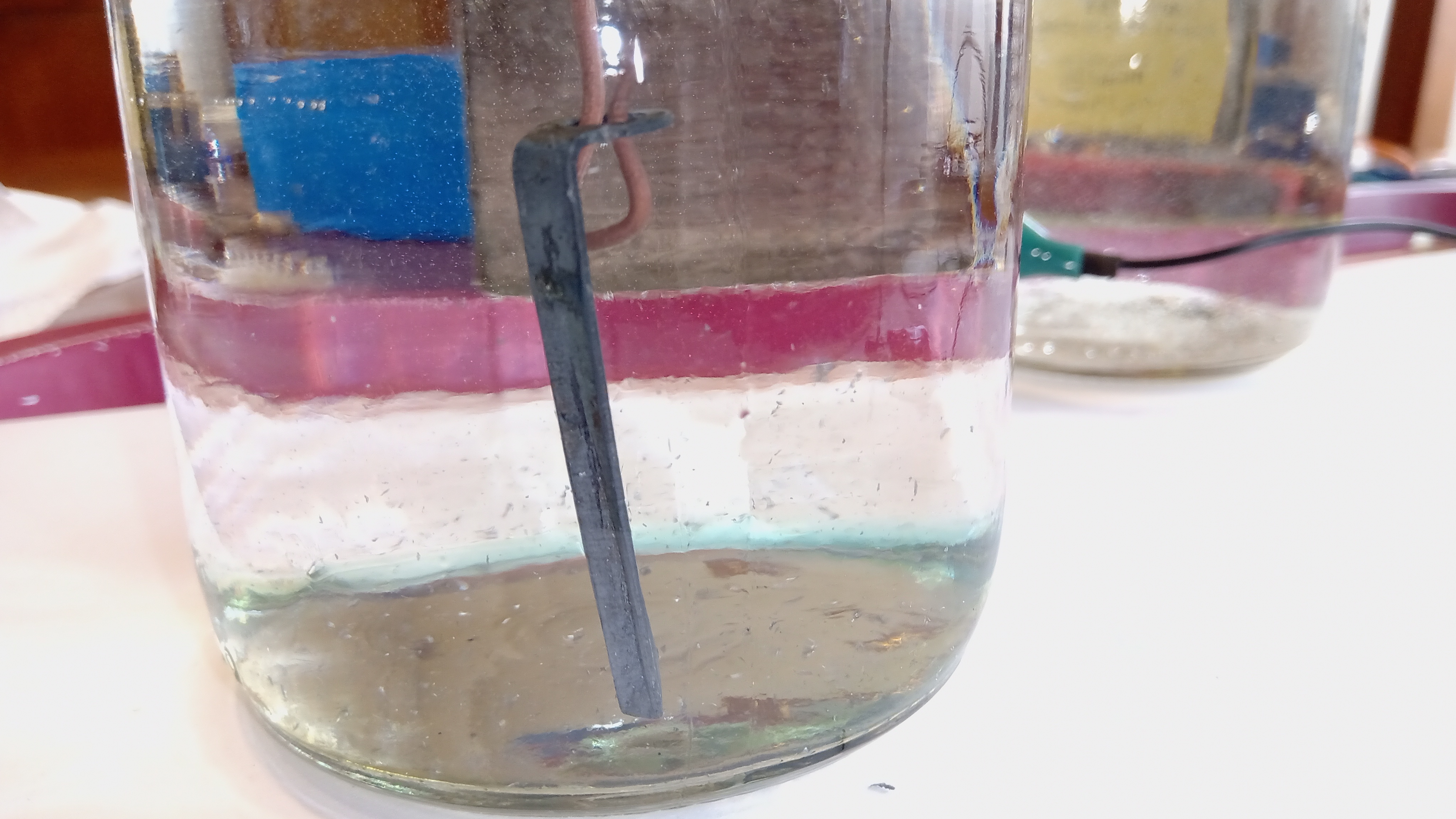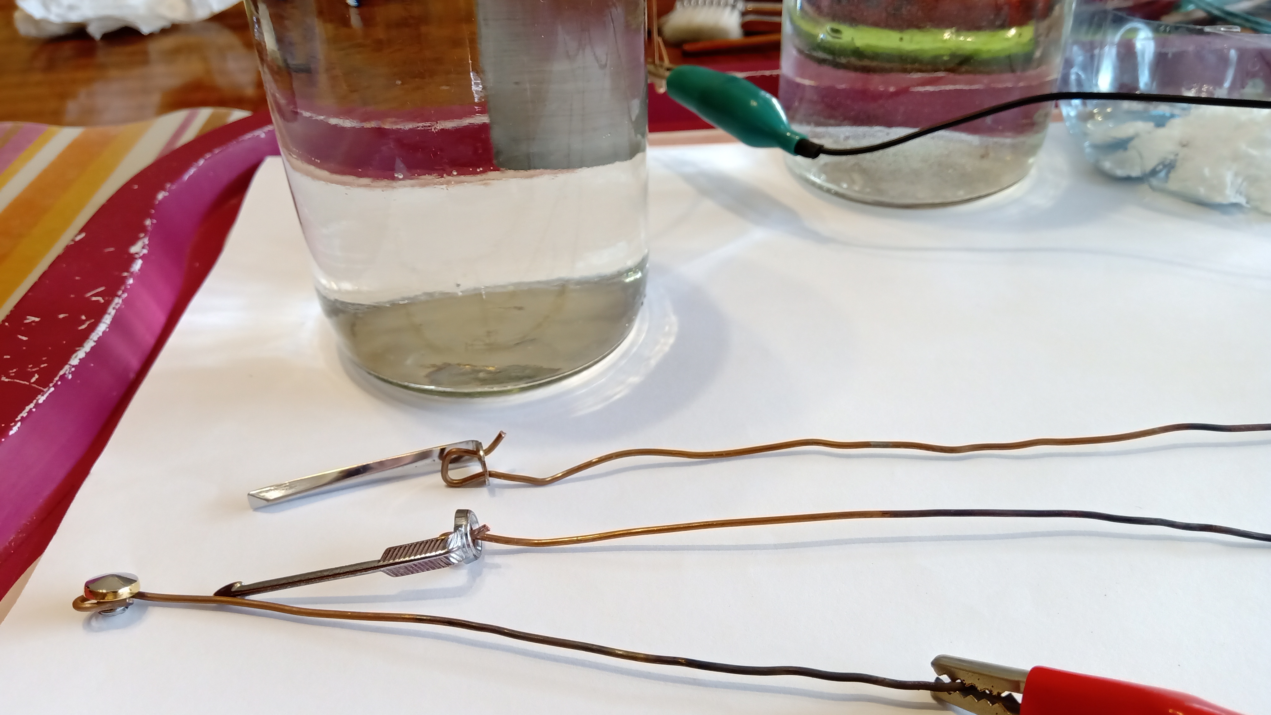 La solución de base fue la misma que en el caso del niquelado (1/2 litro de vinagre blanco + 2 cucharadas soperas de cloruro de sodio), donde el único cambio fue reemplazar los electrodos de níquel por electrodos de acero inoxidable para crear el electrolito.
