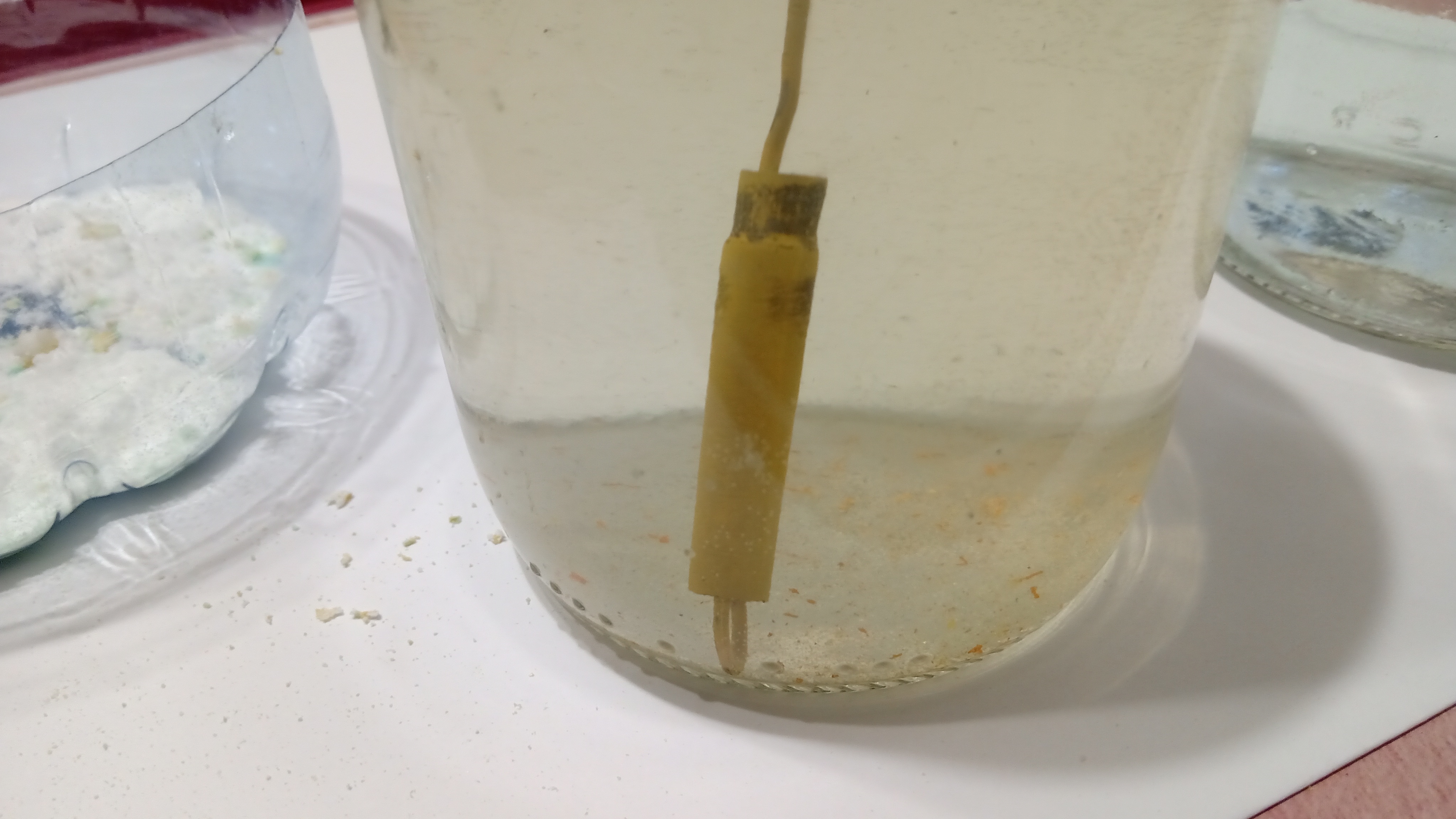 e, come per la generazione dell'elettrolita per la nichelatura, ho messo entrambi i pezzi di acciaio in un recipiente di vetro, che ho riempito completamente con aceto bianco in cui avevo precedentemente sciolto due cucchiai da tavola di cloruro di sodio...