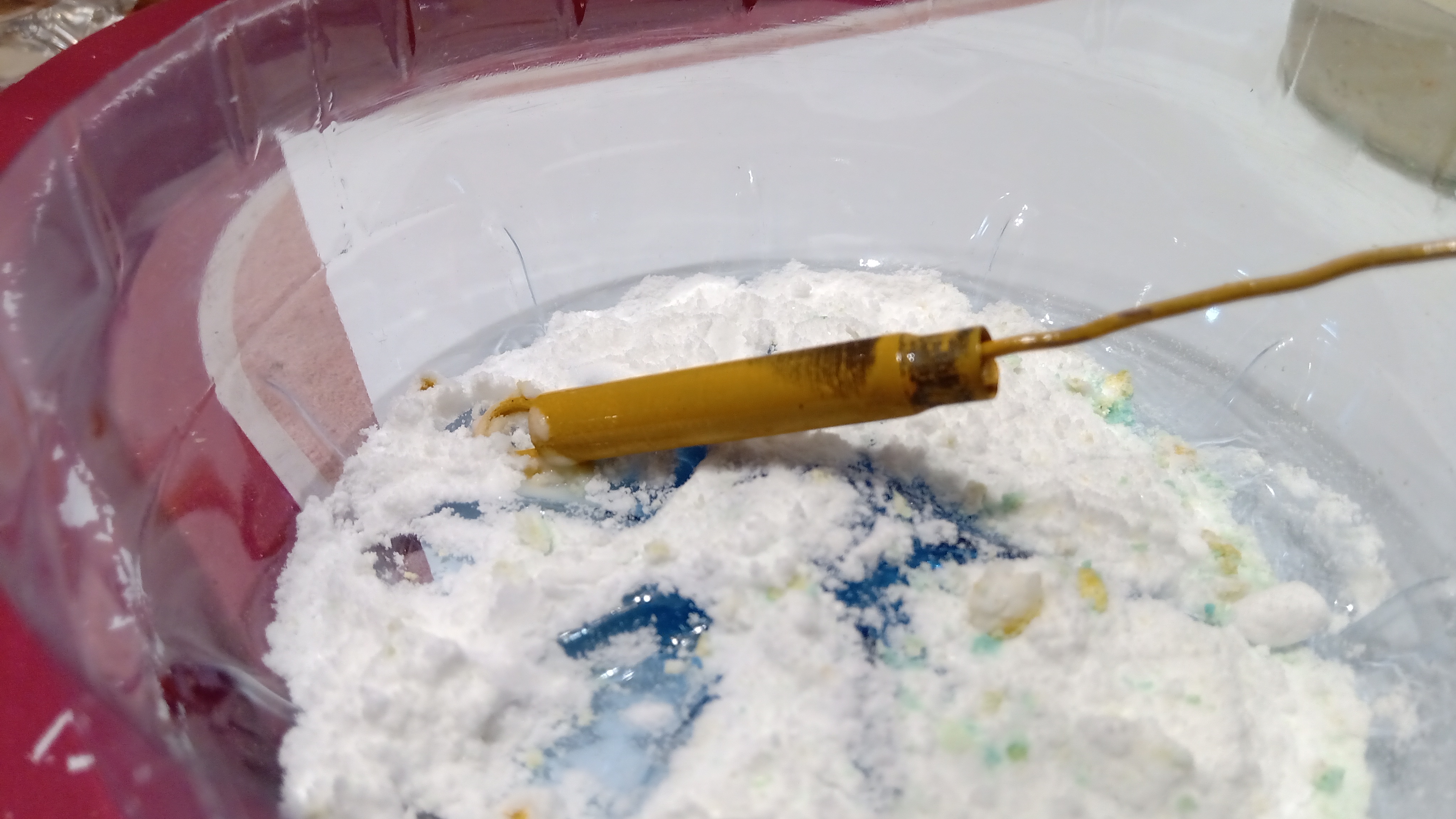 cucchiai da tavola di cloruro di sodio), con l'unica differenza che gli elettrodi di nichel sono stati sostituiti da elettrodi di acciaio inossidabile per creare l'elettrolita.