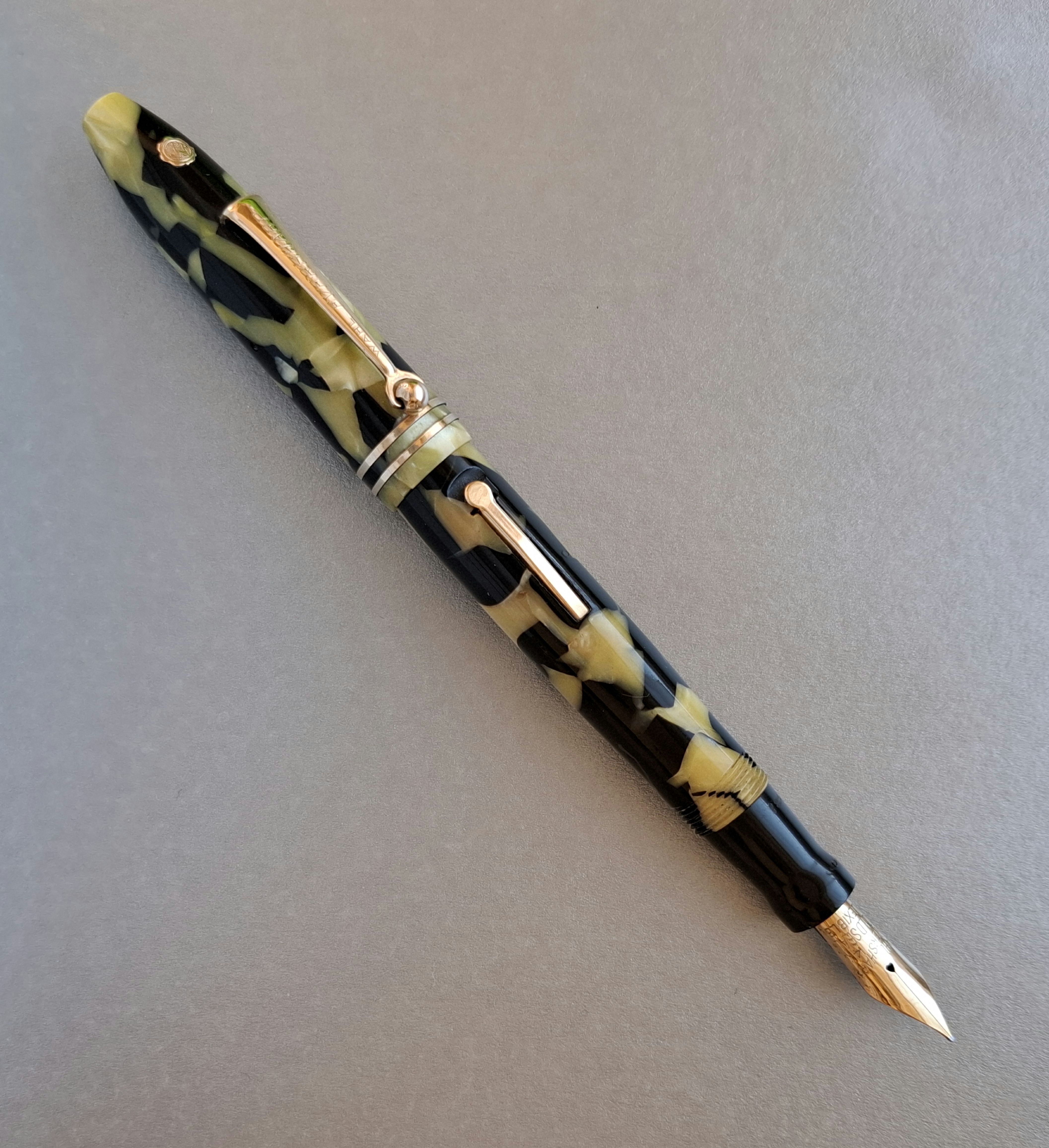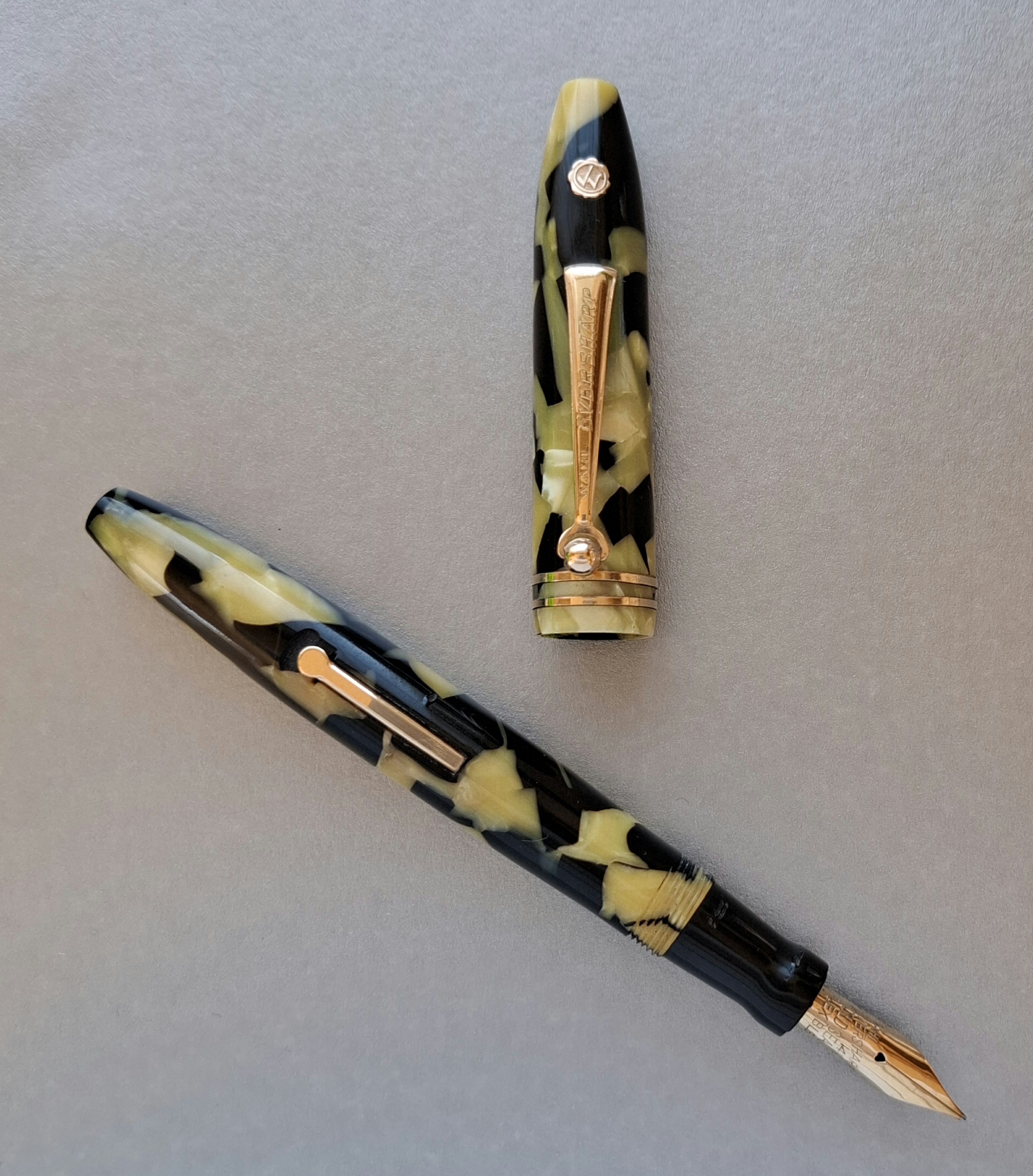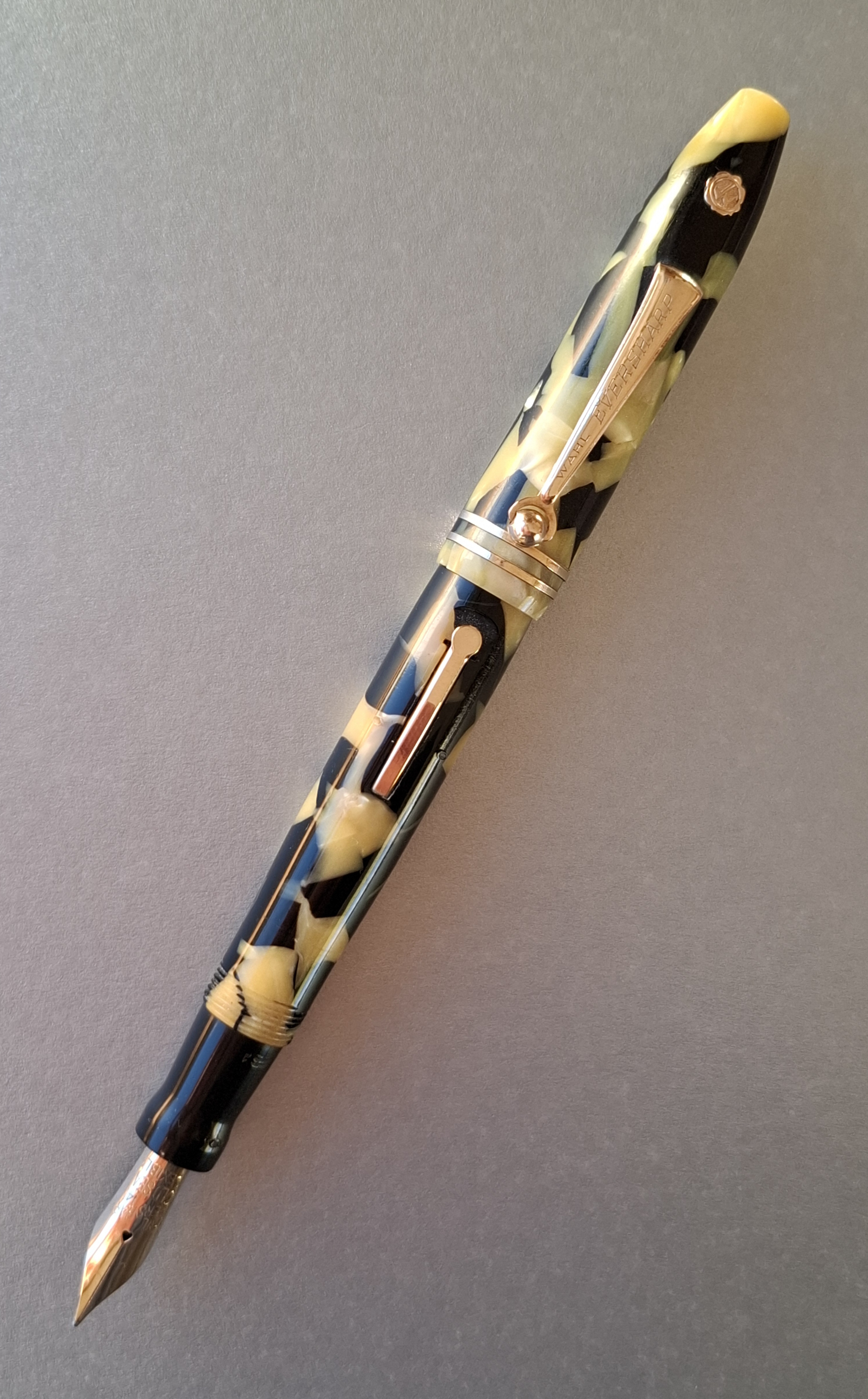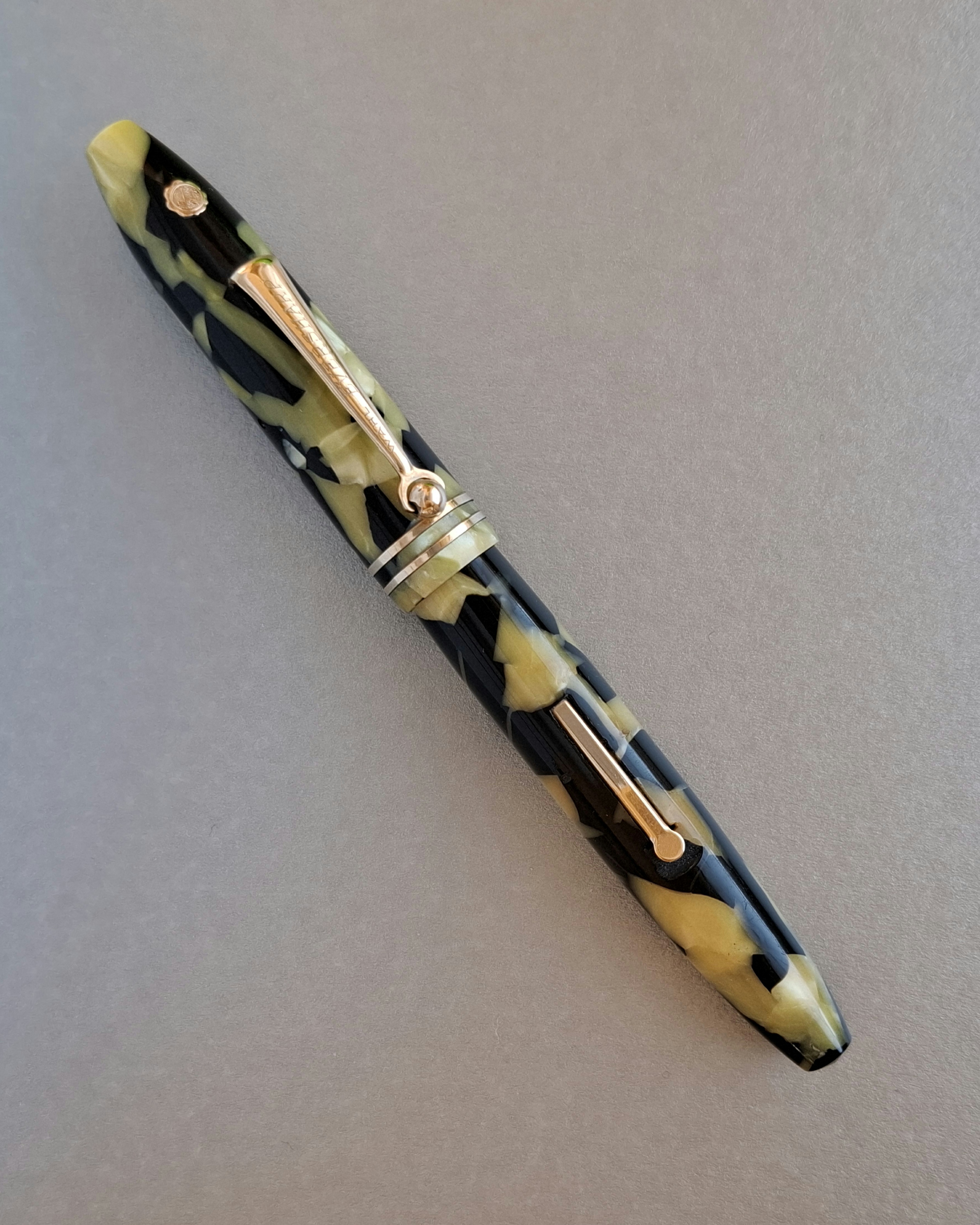 La penna WAHL-EVERSHARP PERSONAL-POINT EQUI-POISED GOLD SEAL misura unica con CLIP nel colore BLACK AND PEARL seconda versione*, in celluloide tornita dal pieno, parti metalliche a vista laminate oro, con cappuccio a vite, corretto pennino intercambiabile Wahl-Eversharp “Flexible” in oro 14 carati, caricamento a levetta. Produzione U.S.A., anno 1929.